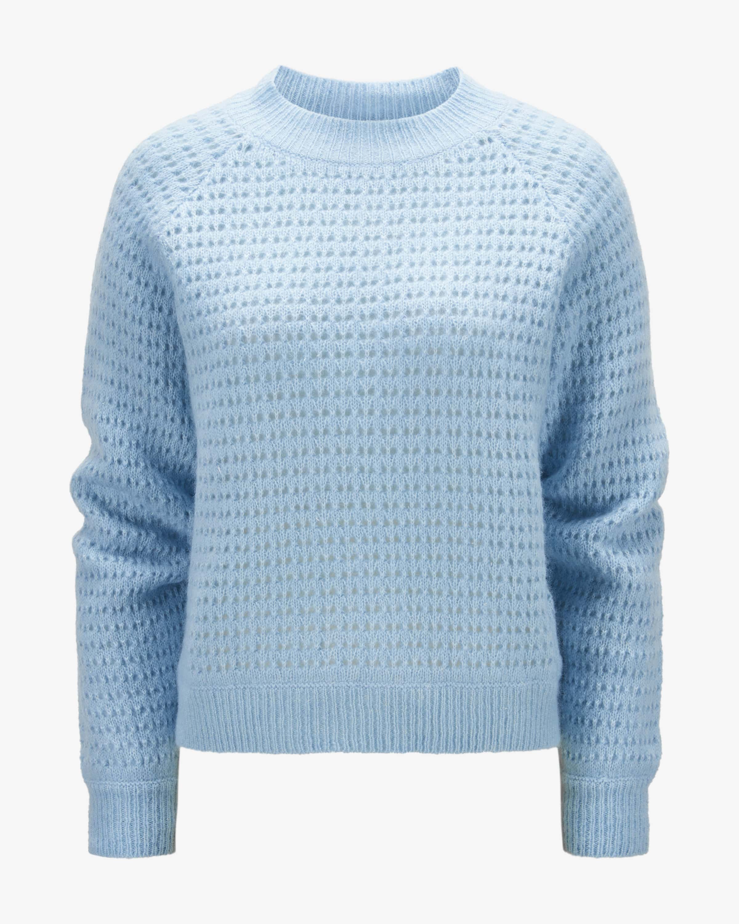 Pullover Gia für Damen von Stephan Boya in Hellblau. Das Hamburger Label steht für luxuriöse Kaschmirteile in puristischer Optik – stilvoll, reduziert, hochwertig. Gefertigt aus hochwertiger Cashmere-Wolle überzeugt auch dieses Modell mit einer besonders weichen Haptik. Zugleich setzt das semi-transparente Ajourstrick- Design das Gesamtbild modisch in Szene.