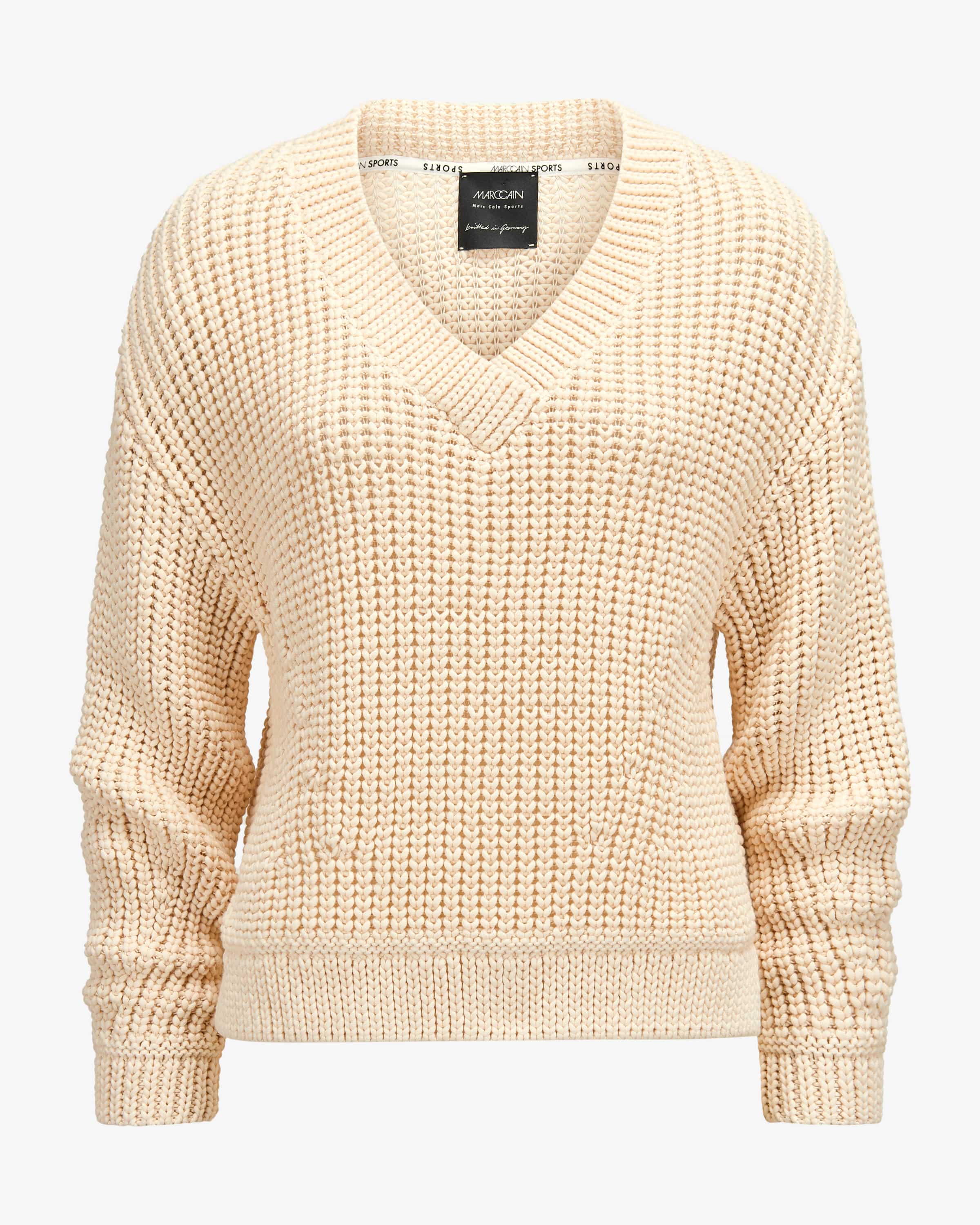 Pullover für Damen von Marc Cain in Creme. Knitted in Germany - Die deutsche Marke steht für selbstbewusste, feminine Looks. Dieses Modell aus leichtem Baumwoll-Mix ist aus der Marc Cain Sports-Reihe und avanciert dank dem semi- transparenten Grobstrick-Muster zu einem angenehmen Begleiter mit legerem Touch.
