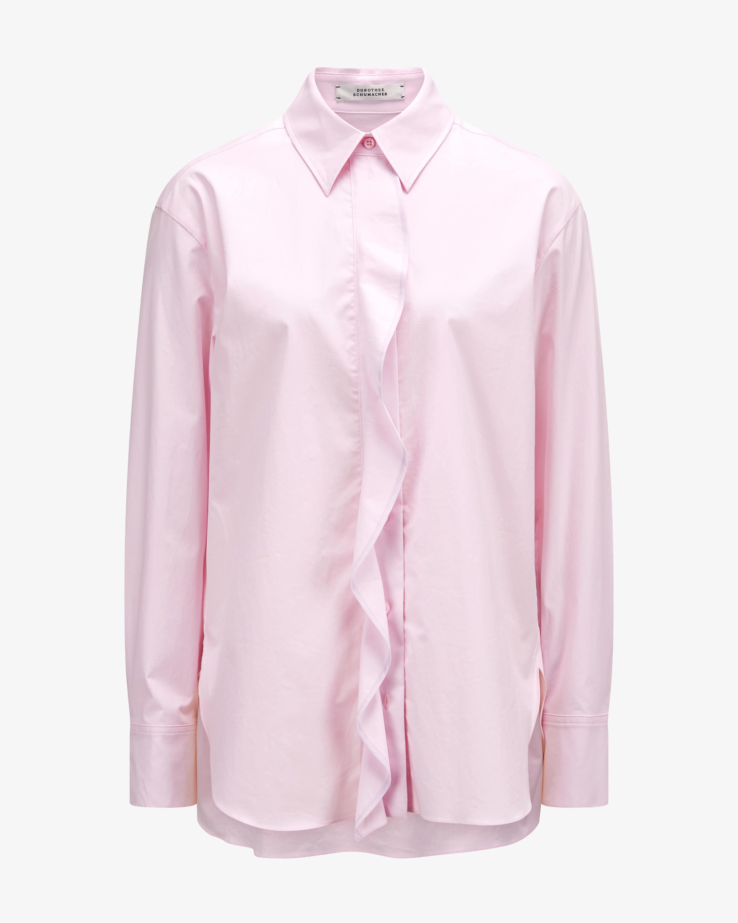 Pure Power Hemdbluse für Damen von Dorothee Schuhmacher in Rosa. Feminine Power aus Deutschland – Dorothees Looks verbinden Stärke mit verspielter Eleganz. Auch dieses Modell punktet dank elastischer Popeline-Qualität sowie der lockeren Schnittführung mit hohem Tragekomfort, während der sonst klassische Hemd-Look durch die Rüschen entlang der Knopfleiste und die tonalen Paspeln eine romantische Note erhält.