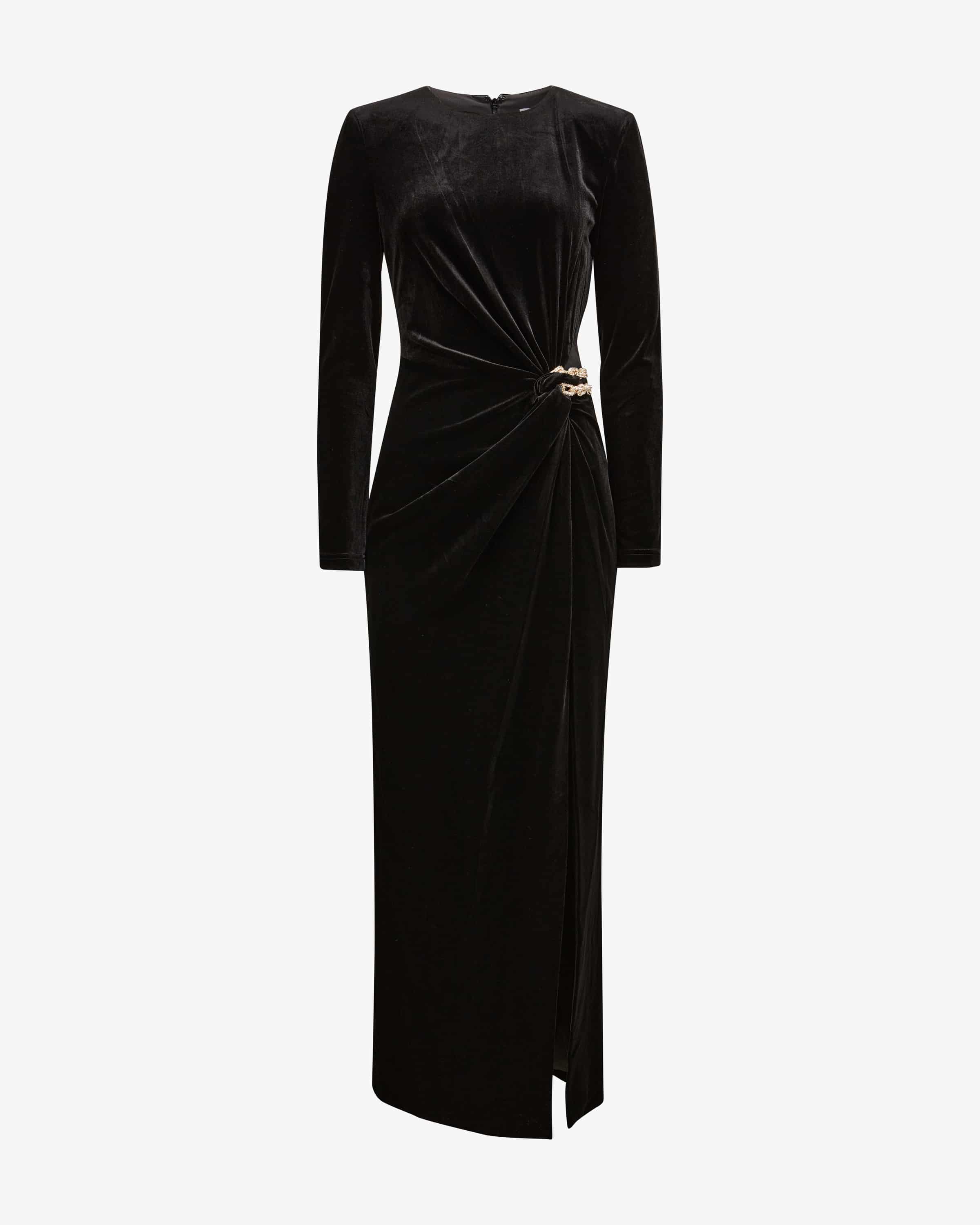 Samtkleid für Damen von Self-Portrait in Schwarz. Das Londoner Label steht für moderne Cocktailkleider mit Spitze, Cut-Outs und femininer Detailverliebtheit. Auch dieses schmale Modell präsentiert sich mit raffiniertem Knoten-Detail mit Cut-Out an der Taille und changierender Ketten-Applikation. Die weiche Samt- Verarbeitung rundet den edlen Abend-Look gekonnt ab.