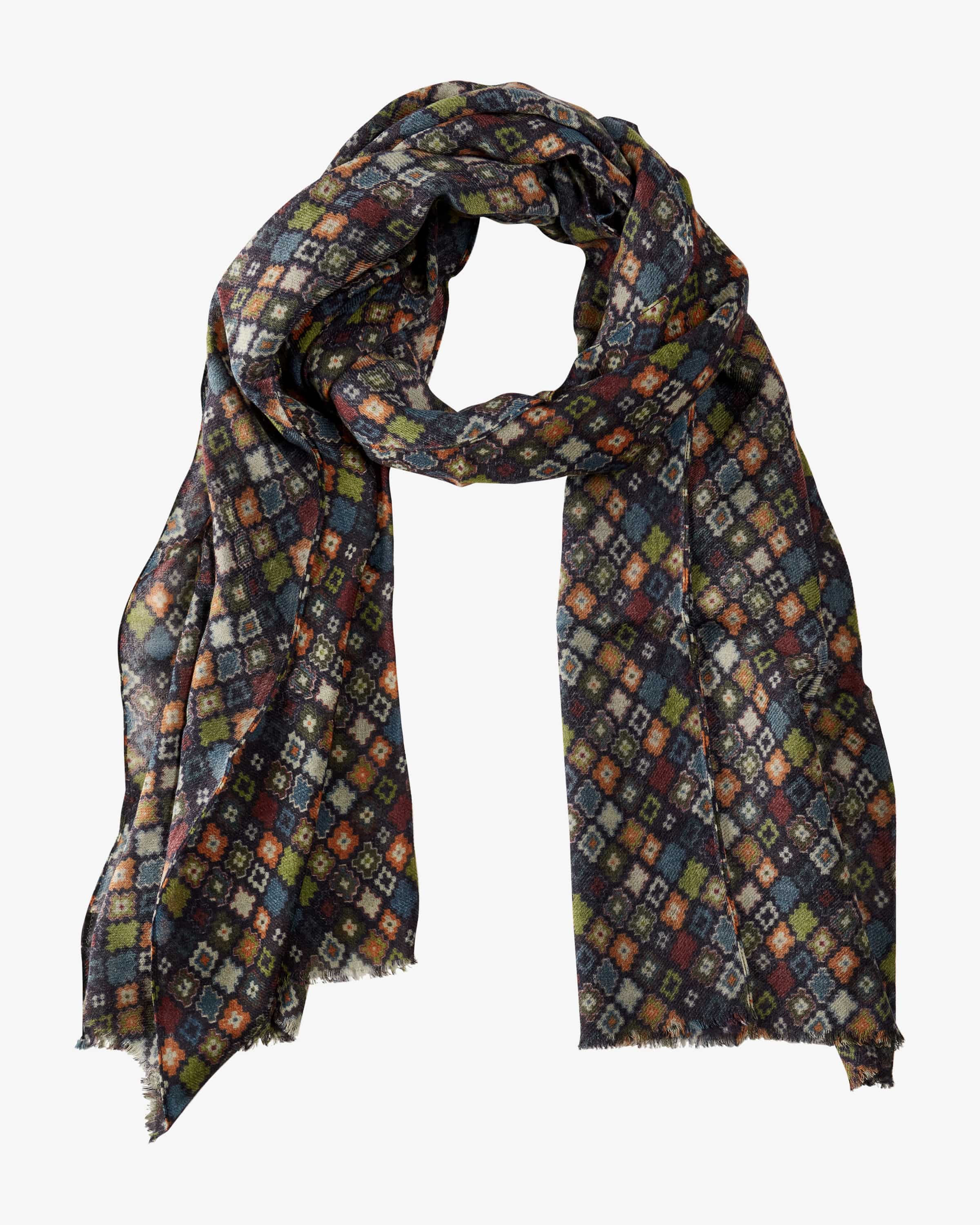 Schal für Herren von Hohenberger in Blau, Grün und Creme. Das Modell überzeugt durch den hochwertige Woll-Qualität mit haptischen Highlights, während das geometrische Dessin einen modischen Begleiter schafft.