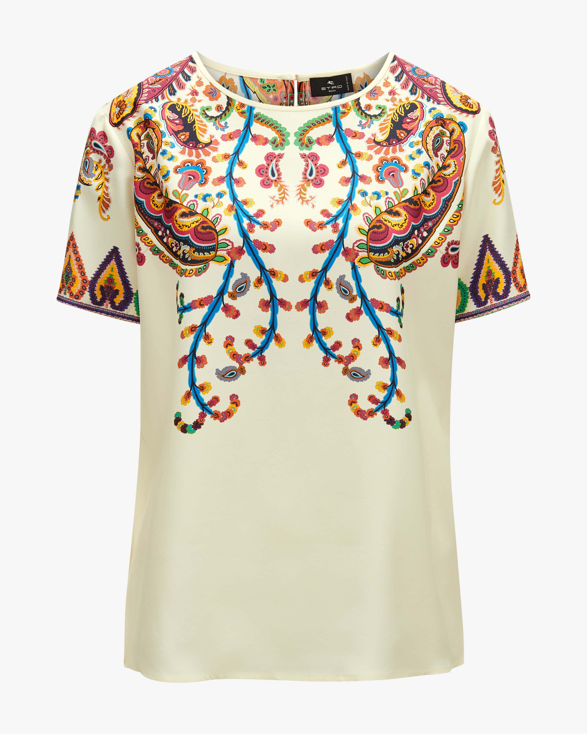 Seiden-Blusenshirt für Damen von Etro in Ecru und Bunt. Die italienische Traditionsmarke ist bekannt für ihre opulenten Paisley-Muster und ethnischen Prints. Auch dieses edle Modell überzeugt mit labeltypischem Paisley-Dessin in raffinierter platzierter Optik, während die fließende Seiden-Qualität angenehme Tragemomente garantiert.