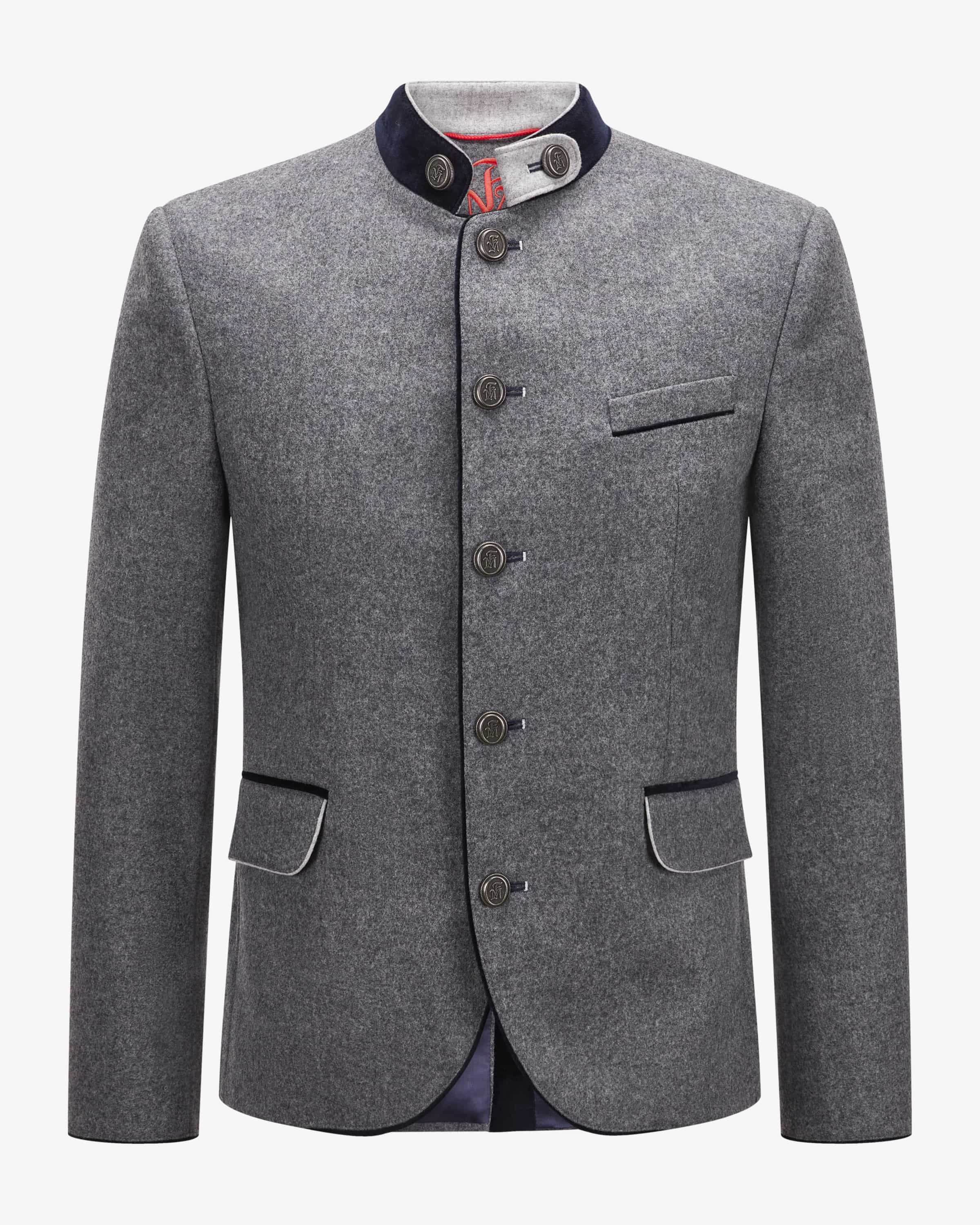 Silas Trachten-Janker aus Merino-Schurwolle für Herren von Frederic Meisner in Grau und Nachtblau. Das Modell besticht dank der hochwertigen und zugleich leichten Merino-Schurwolle in traditioneller Aufmachung. Edle Metallknöpfe mit Initialen des Labels sowie Kontrast-Paspeln aus changierendem Samt runden das maskuline Trachten-Outfit perfekt ab.
