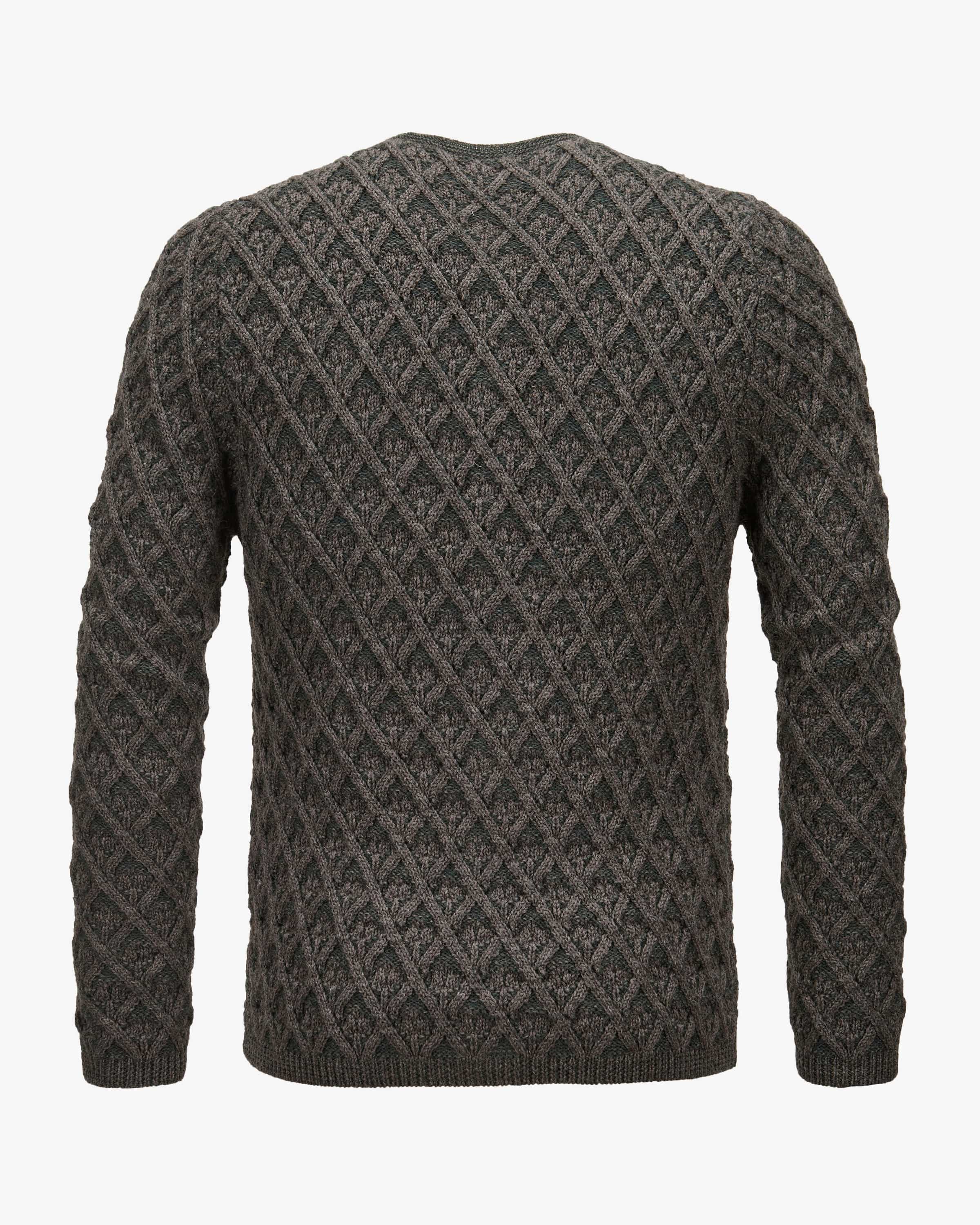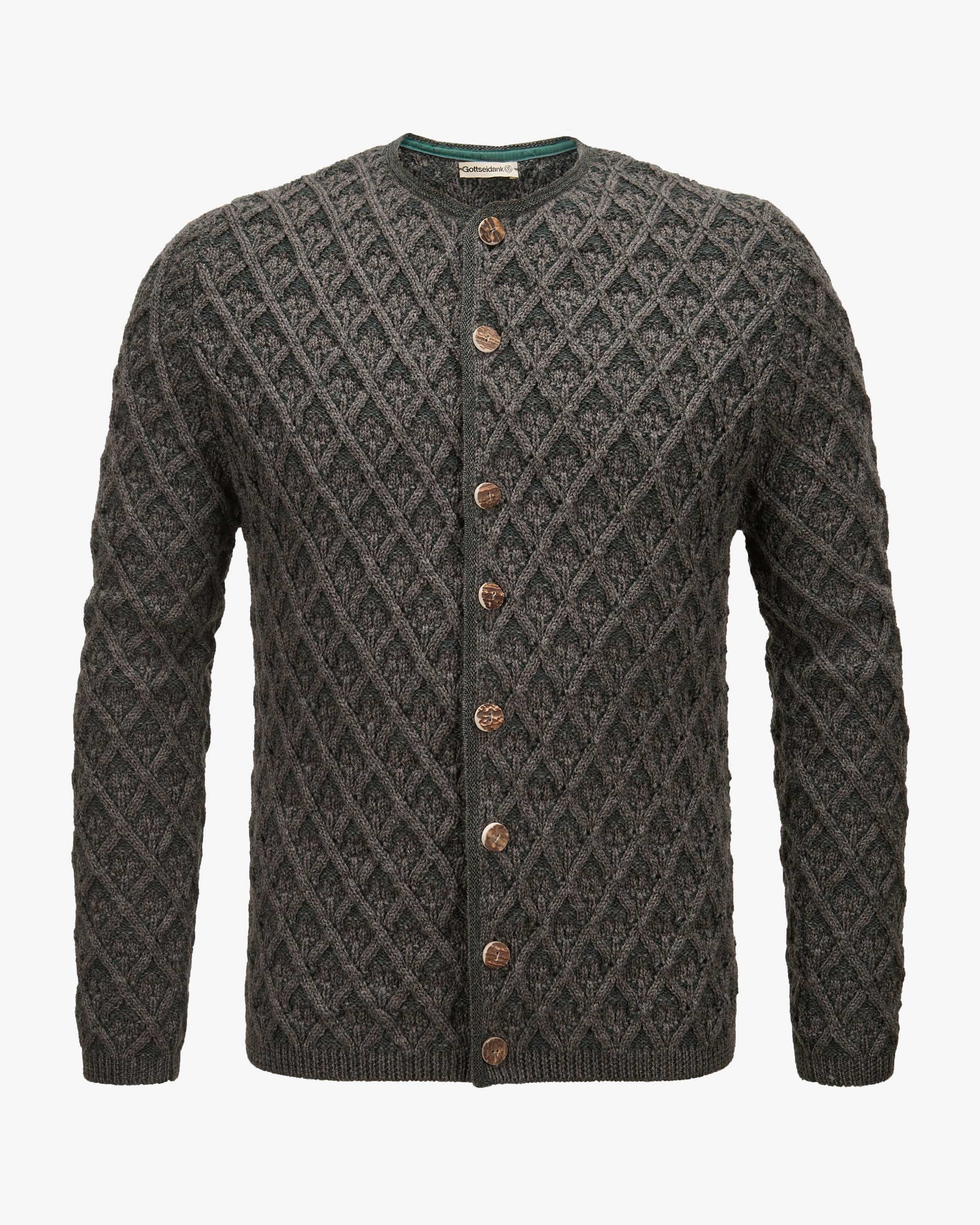 Simon Trachten-Strickjacke für Herren von Gottseidank in Graubraun und Tanne. Tracht mit Charakter - Traditionelle Details, ein einzigartiges Bicolor- Strickmuster sowie hochwertige Schurwoll-Verarbeitung zeichnen das Modell des Münchner Labels aus.