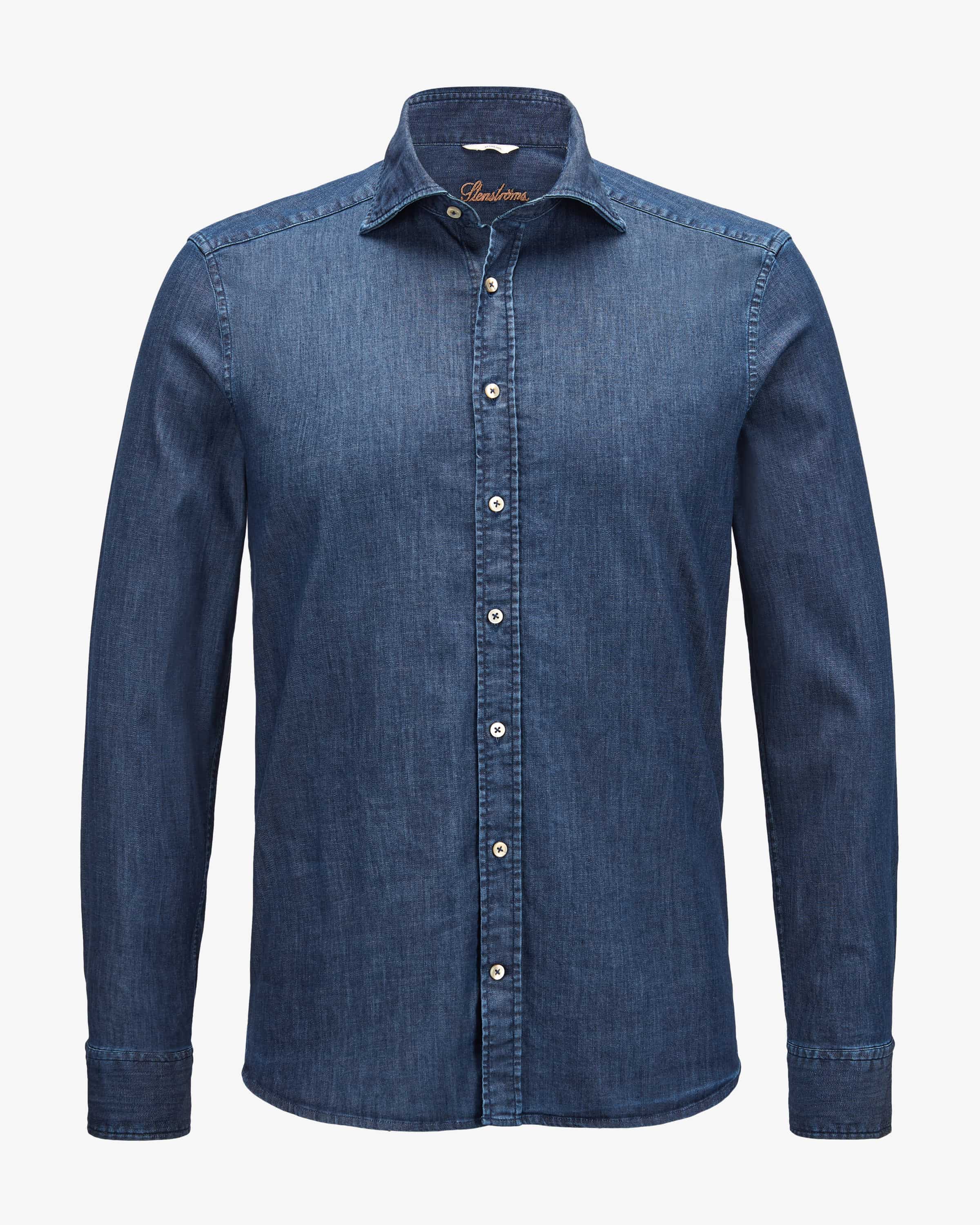 Jeanshemd für Herren von Stenströms in Dunkelblau. Das klassisch gehaltene Modell besticht mit der Light Denim-Aufmachung, wodurch dem Hemd ein legerer Charakter verliehen wird. Changierende Perlmutt-Knöpfe runden den Look zudem harmonisch ab.