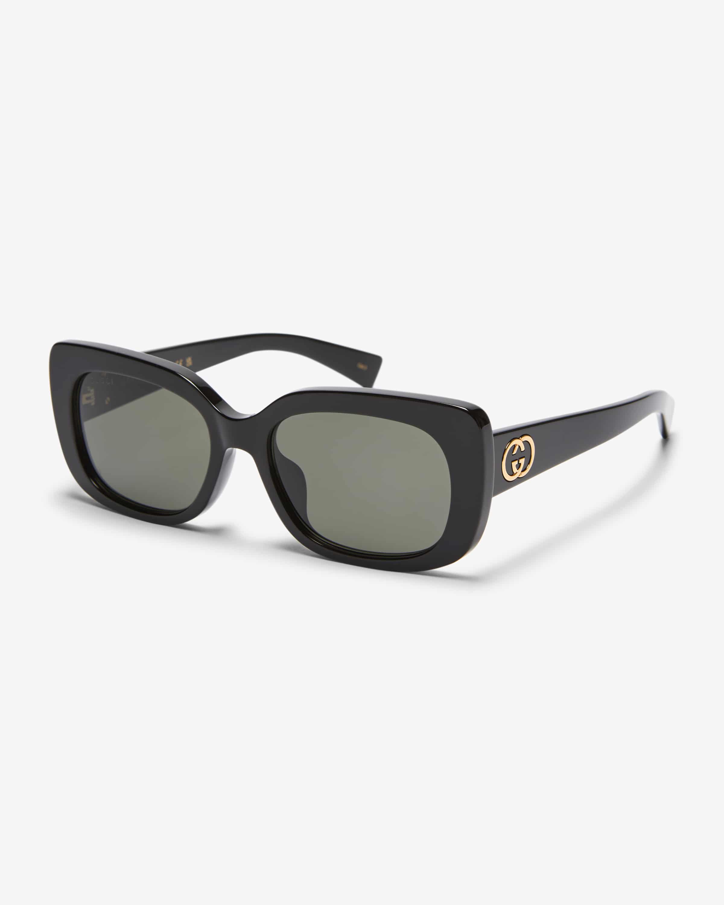 Sonnenbrille für Damen von Gucci Eyewear in Schwarz. Dank eckiger Form in klassischer Silhouette avanciert das Modell mit breitem Rahmen in Hochglanz- Optik zum modernen Begleiter an sonnigen Tagen. Die seitlichen, goldfarbenen Logo-Applikationen runden die Brille charakteristisch ab.