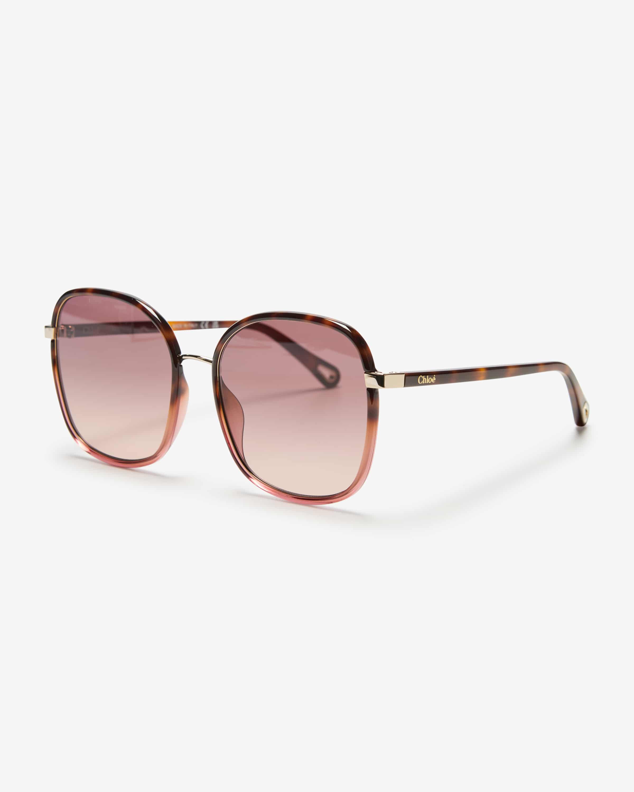 Sonnenbrille für Damen von Chloé Eyewear in Altrosa, Braun und Gold. Dank abgerundeter Gläser und der extragroßen Form mit schmalen Bügeln avanciert das Modell zum modernen Begleiter für den Sommer, während das Havana-Design den sonnigen Charakter gekonnt vollendet.