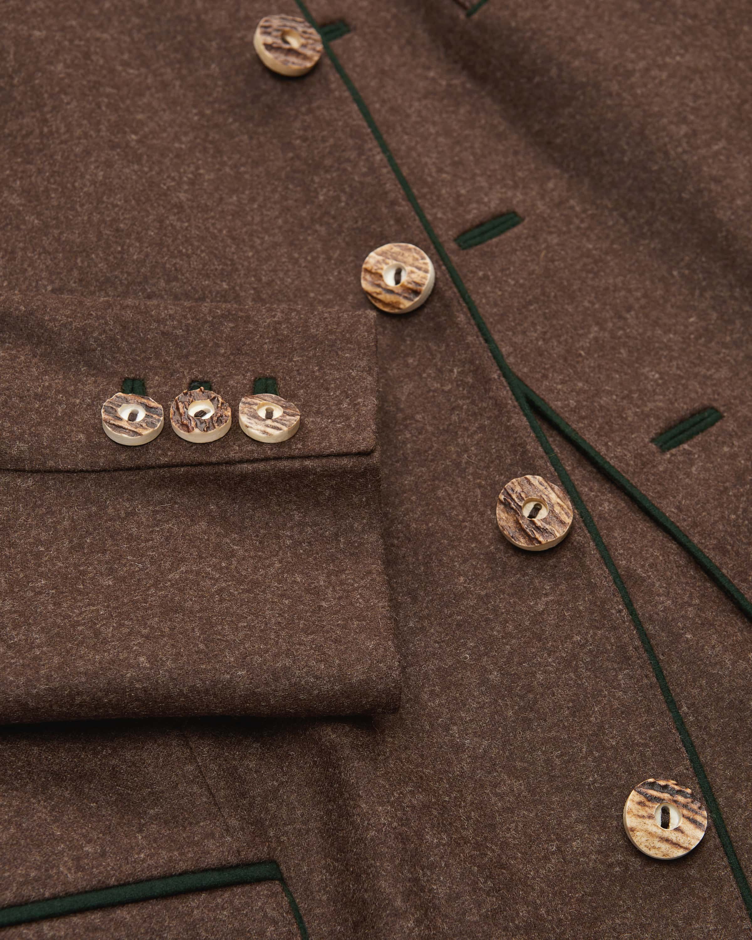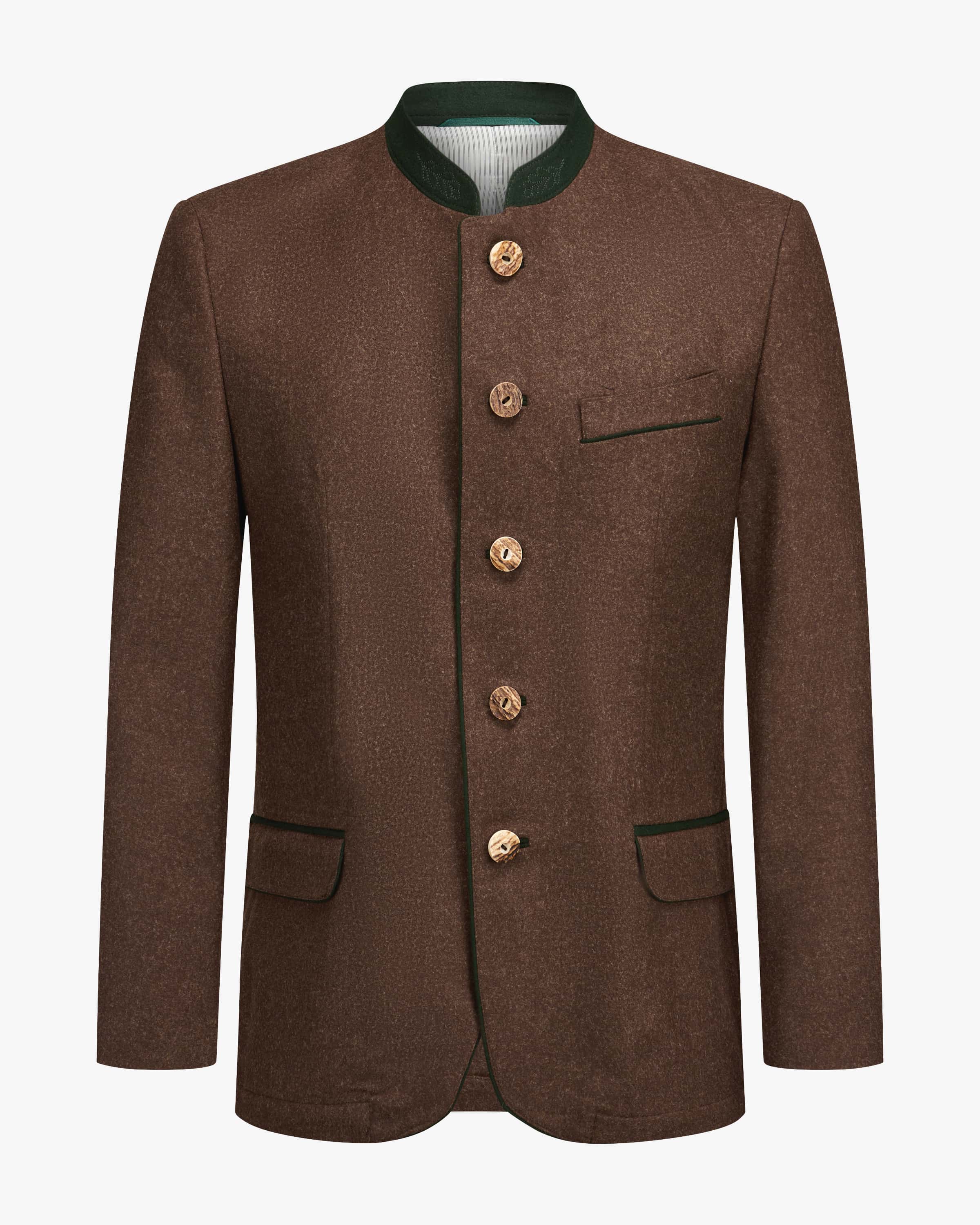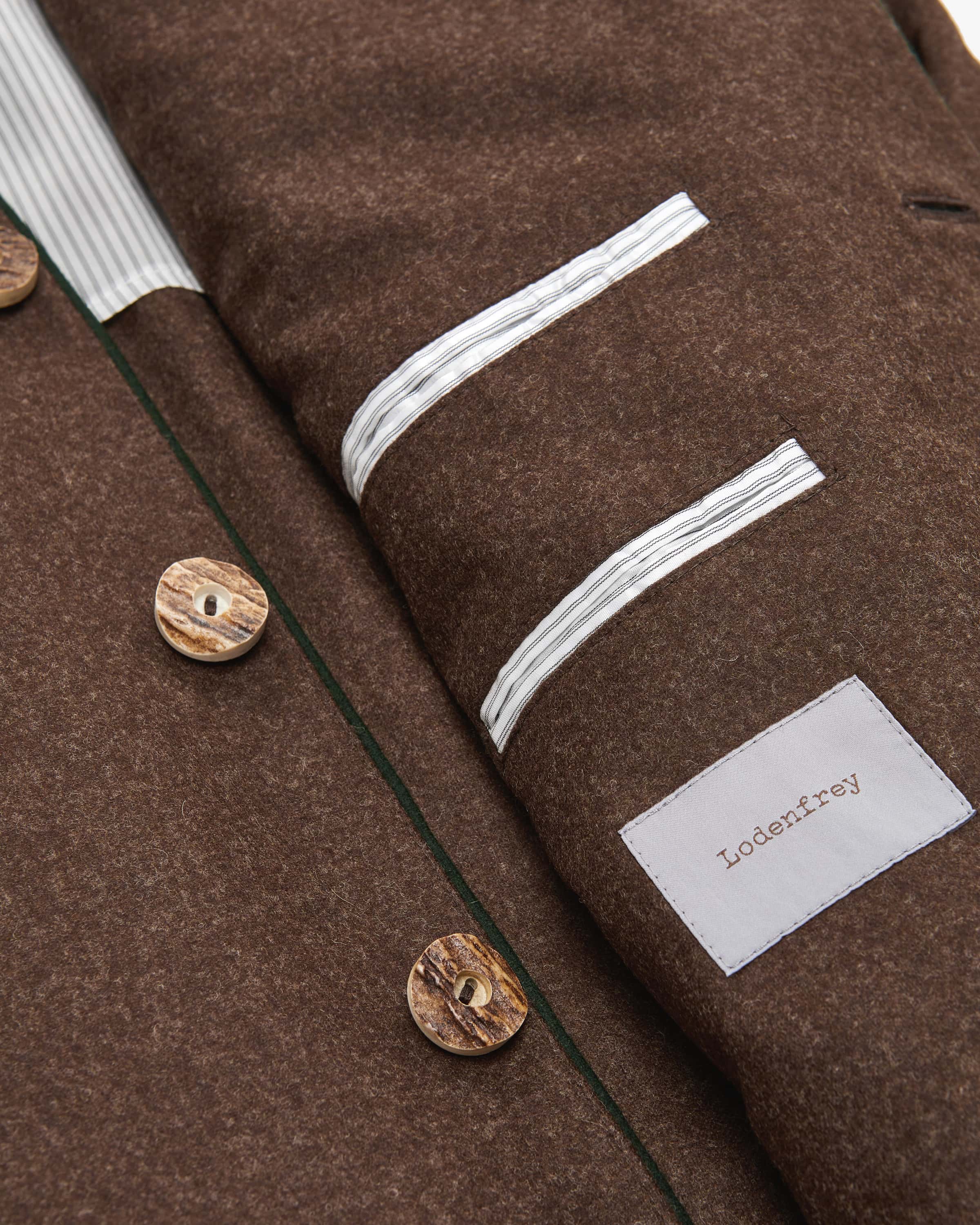 Steinbach Trachtenjanker für Herren von LODENFREY in Braun und Dunkelgrün. Das traditionelle Modell besticht durch die hochwertige Schurwoll-Qualität, die angenehmen Tragekomfort verspricht. Kontrastfarbene Paspelierungen sowie markante Knöpfe runden den Trachten-Look perfekt ab.