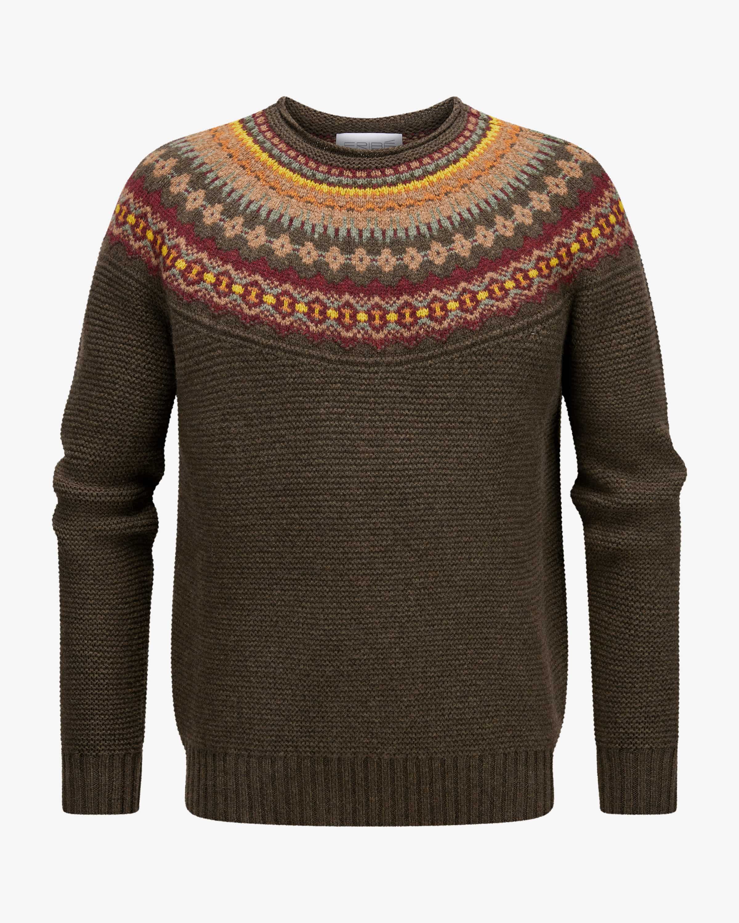 Stoneybrek Pullover für Herren von ERIBE KNITWEAR in Braun, Bordeaux und Beige. Leger und modisch zugleich – so präsentiert sich das maskuline Modell in hochwertiger Woll-Verarbeitung, während das klassische Norweger-Muster in Kontrastfarben einen kombistarken Favoriten schafft.