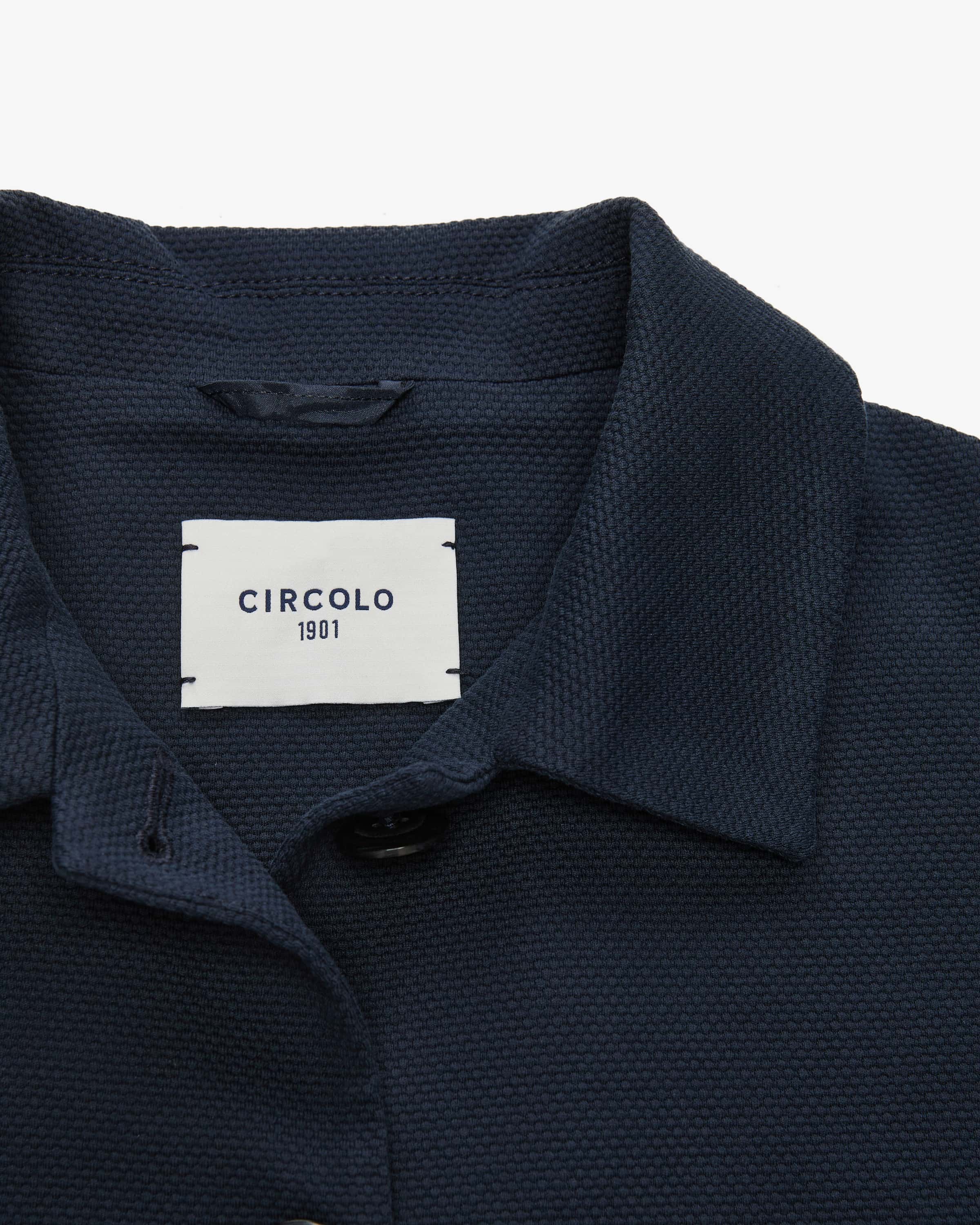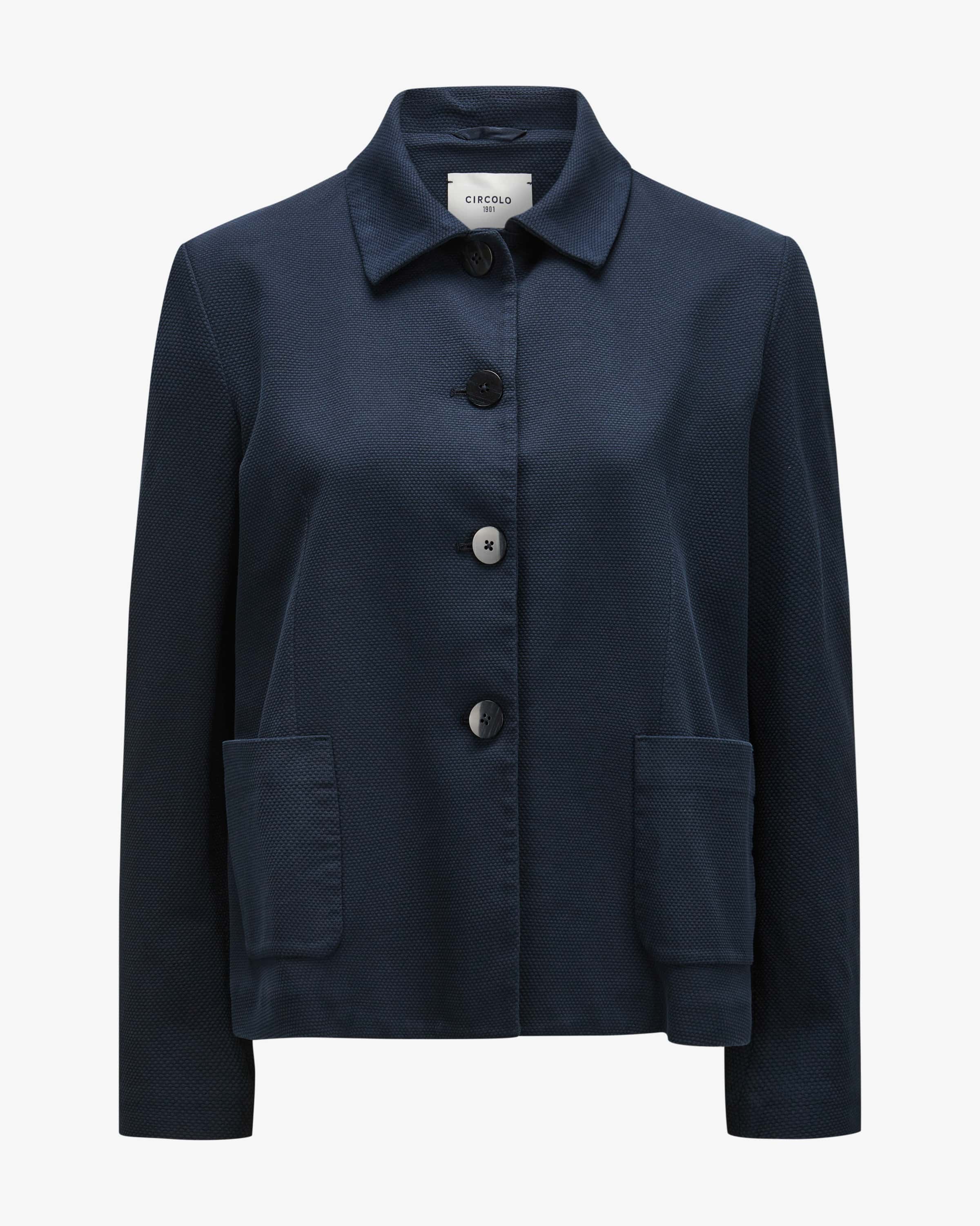 Strickblazer Caban Oxford für Damen von Circolo 1901 in Navy. Die Marke steht für komfortable Blazer und Jersey-Jacken mit perfektem Sitz – casual tailored made in Italy. Das ungefütterte Modell präsentiert sich mit feiner 3D- Strickstruktur aus elastischem Baumwoll-Mix, welcher für einen hohen Tragekomfort sorgt. Zugleich verleiht die weite, ausgestellte Silhouette mit markanter Kellerfalte einen stilsicheren Charakter.