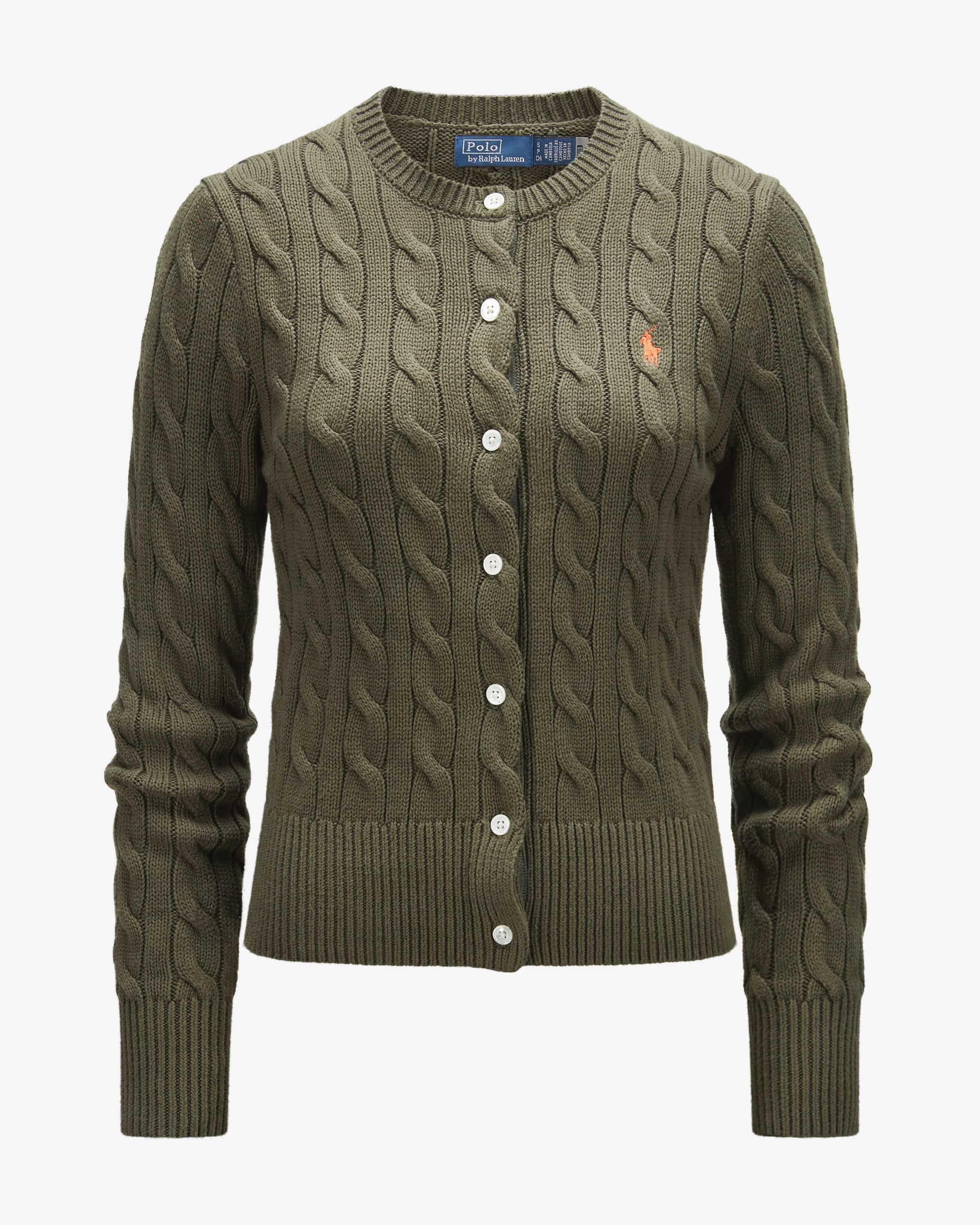 Strickjacke für Damen von Polo Ralph Lauren in Oliv. Das Modell im sportiven Heritage-Look begeistert mit hochwertiger Baumwolle und hohem Tragekomfort. Stilvoll abgerundet wird das Design durch die kontrastierende Logo-Stickerei auf der Brust sowie das klassische Zopf-Strickmuster.