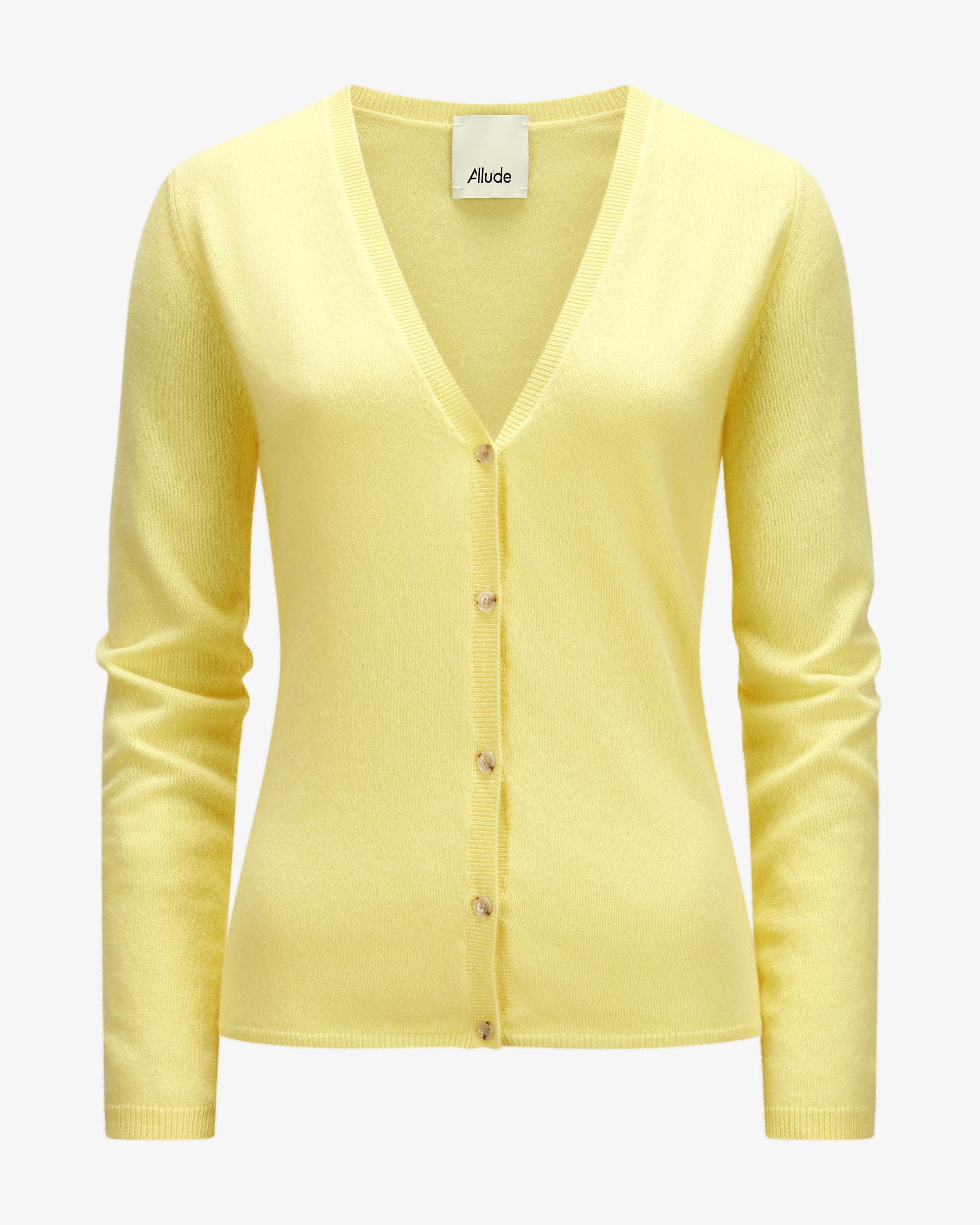 Strickjacke für Damen von Allude in Zitrone. Das Münchner Unternehmen Allude steht für Mode, die Selbstbewusstsein und zeitlose Individualität ausstrahlt. Gefertigt aus hochwertiger Cashmere-Wolle, besticht das Modell mit weicher und leichter Haptik, während das feine Strick-Design ein hochwertiges Essential schafft.