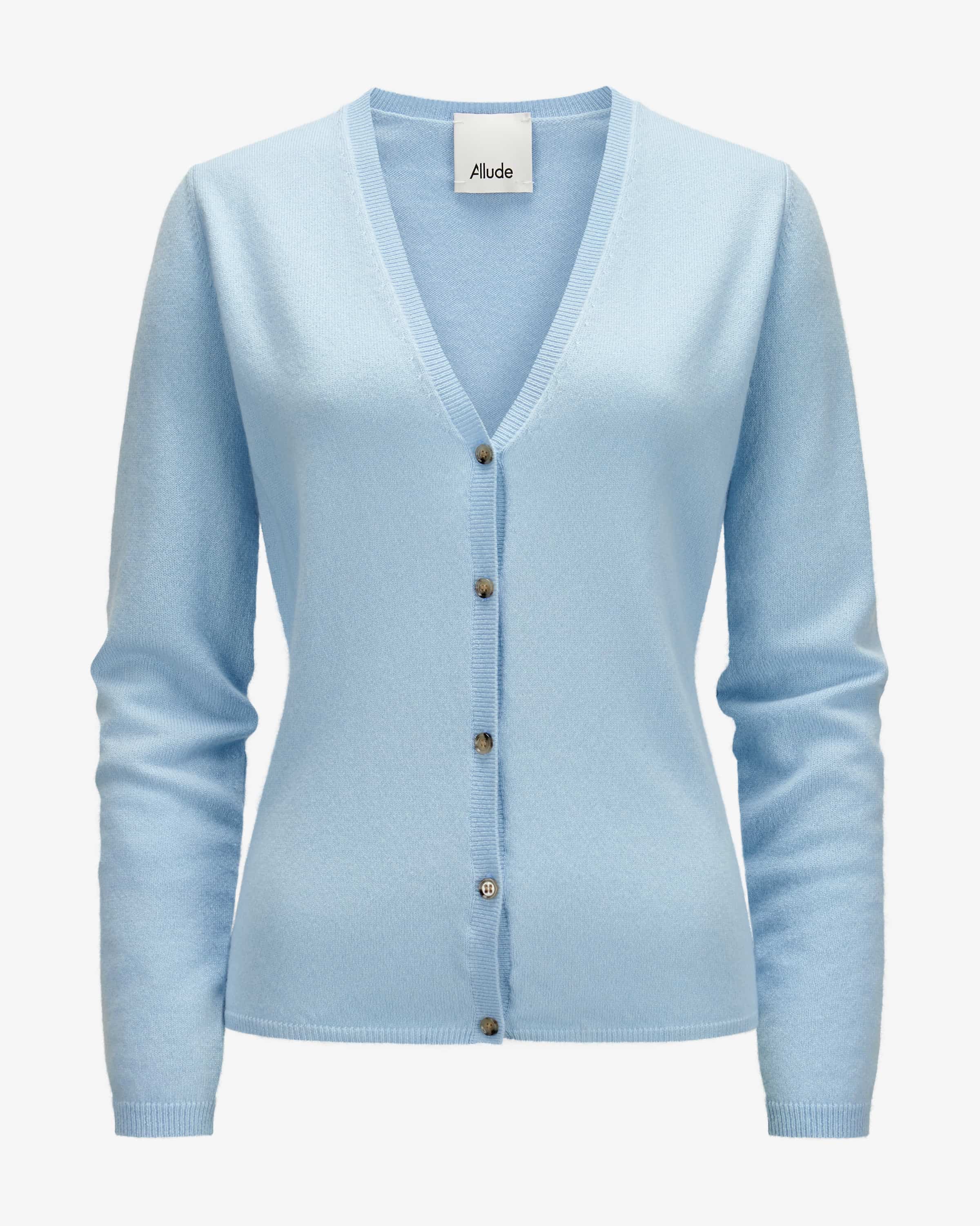 Strickjacke für Damen von Allude in Hellblau. Das Münchner Unternehmen Allude steht für Mode, die Selbstbewusstsein und zeitlose Individualität ausstrahlt. Gefertigt aus hochwertiger Cashmere-Wolle, besticht das Modell mit weicher und leichter Haptik, während das feine Strick-Design ein hochwertiges Essential schafft.