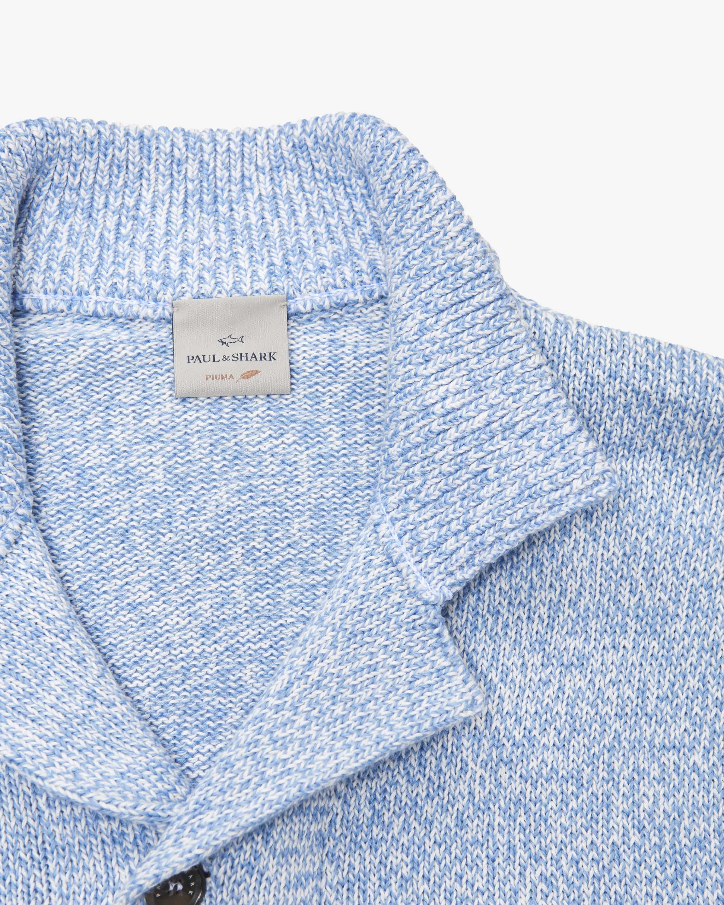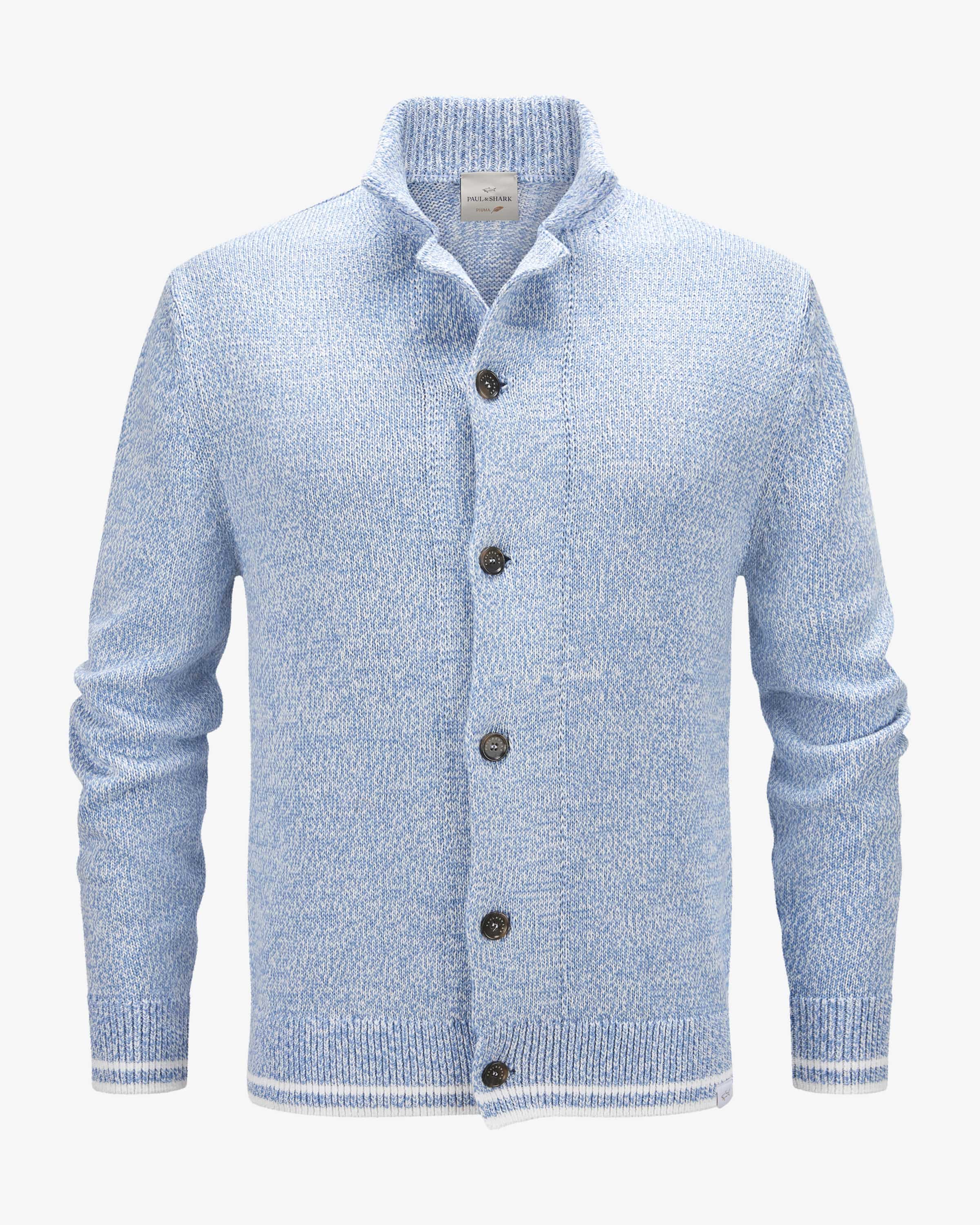 Strickjacke für Herren von Paul & Shark in Hellblau und Weiß. Dank der Verwendung von hochwertiger ägyptischer Giza-Baumwolle punktet das Modell mit einer soften und atmungsaktiven Haptik, während das Bicolor Mouline-Strickdesign einen maritimen Charakter verleiht.