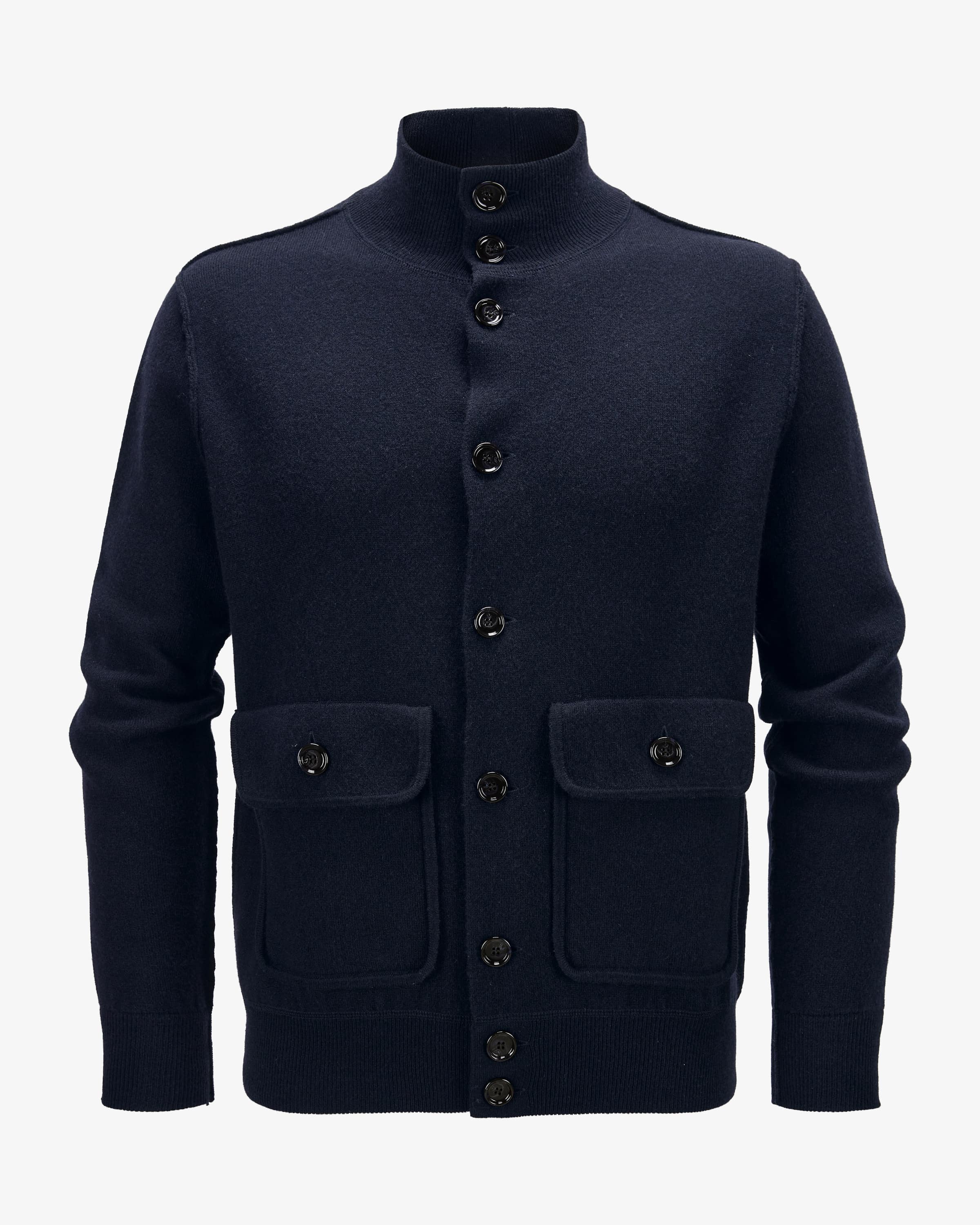 Strickjacke für Herren von Allude in Nachtblau. Die Marke verbindet hochwertige Handwerkskunst mit innovativen Trends, um stets das Beste im Bereich Cashmere zu bieten. Die Cashmere-Kollektionen überzeugen im Alltag durch ihre Bequemlichkeit, Pflegeleichtigkeit und Langlebigkeit. Auch dieses Modell überzeugt dank dem hochwertigen Mix aus Schurwolle und Cashmere mit weicher Haptik, während das legere Design mit Stehkragen und aufgesetzten Taschen ein modernes Strick-Essential schafft.