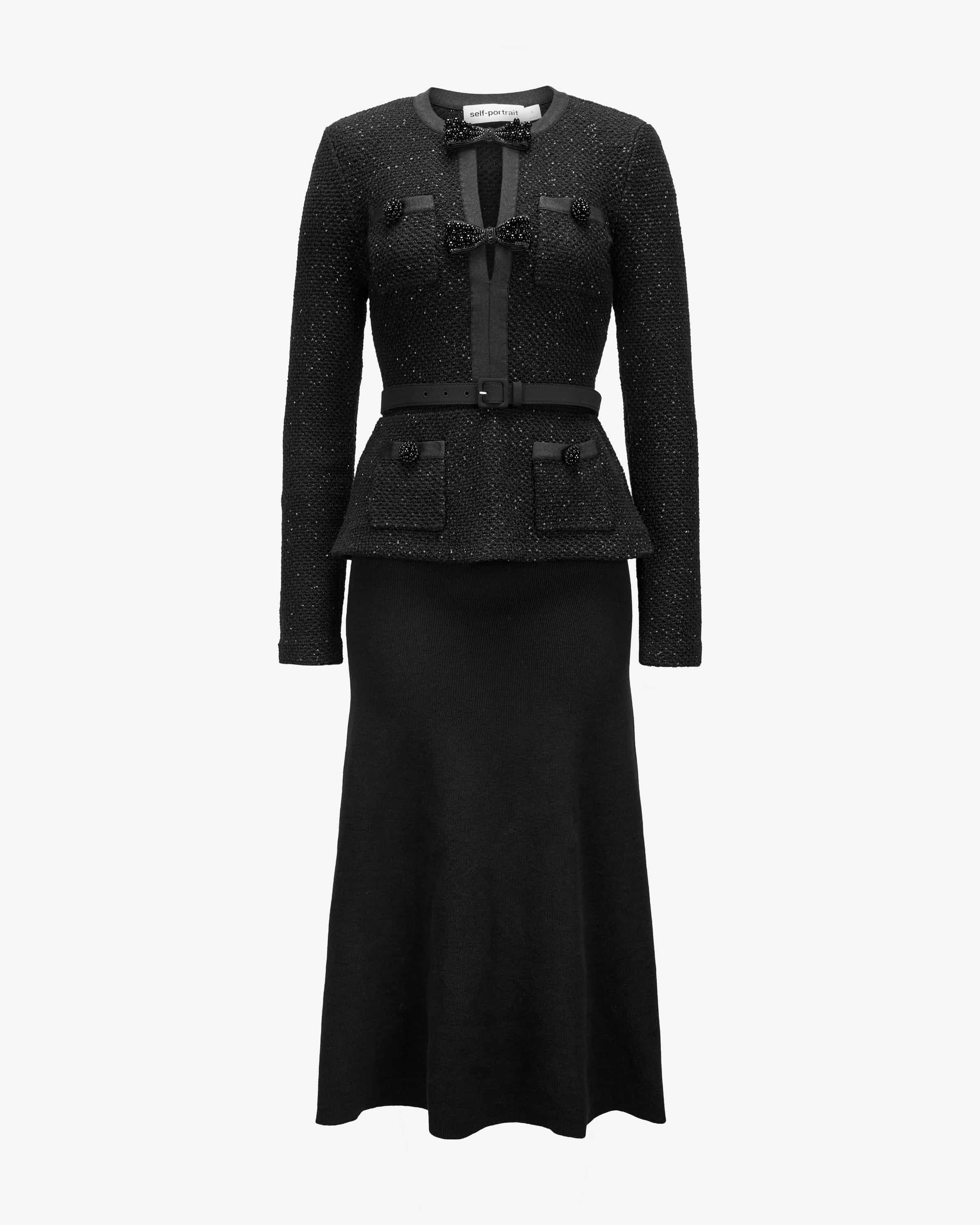 Strickkleid für Damen von Self-Portrait in Schwarz. Das Londoner Label steht für moderne Cocktailkleider mit Spitze, Cut-Outs und femininer Detailverliebtheit. Dieses Midi-Modell avanciert durch die raffinierte Kombination aus Strickjacke mit Schößchen und integriertem Rock zu einem femininen Strick-Highlight, welches die Schleifen-Applikationen und Knöpfe mit aufgesetzten Schmuckperlen- und Strasssteinen elegant vollenden.
