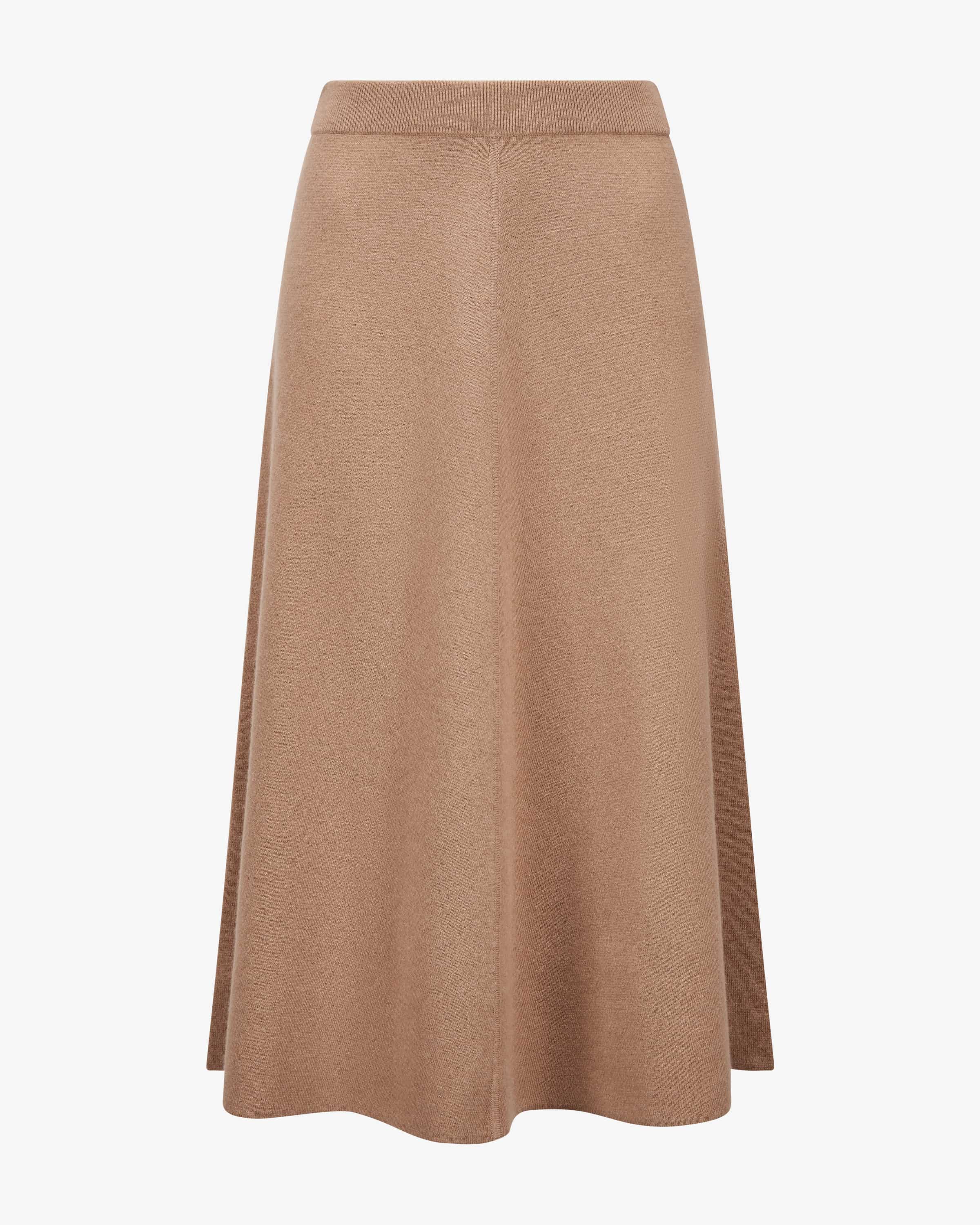 Strickrock für Damen von Allude in Camel. Das Münchner Label wurde 1993 von Andrea Karg gegründet und ist bekannt für luxuriöse Strickmode aus edlem Cashmere. Auch dieses Modell überzeugt mit edlem Schurwoll-Cashmere-Mix in feiner Strick-Aufmachung, während die cleane Aufmachung und die ausgestellte Passform einen eleganten und femininen Look verleihen.