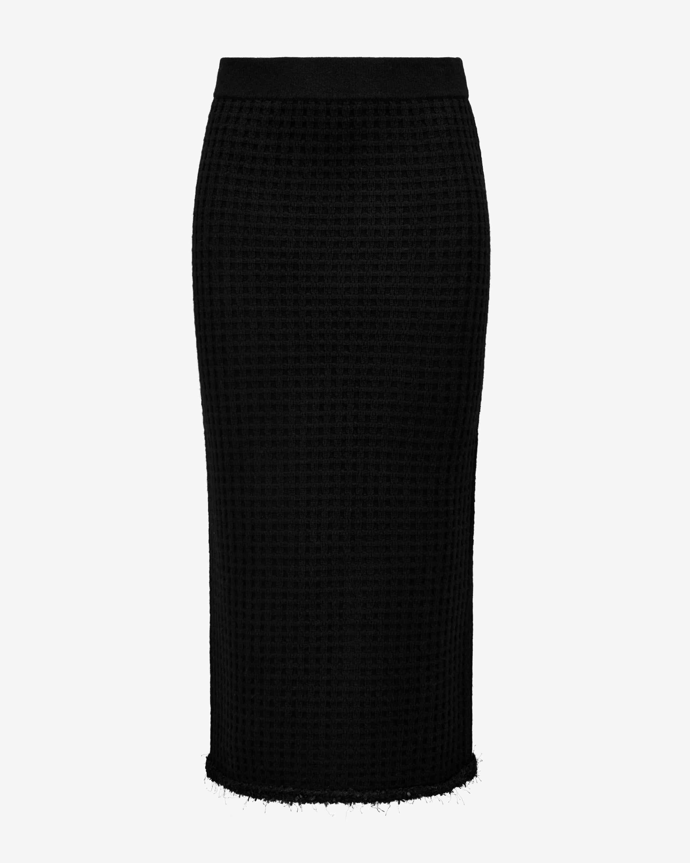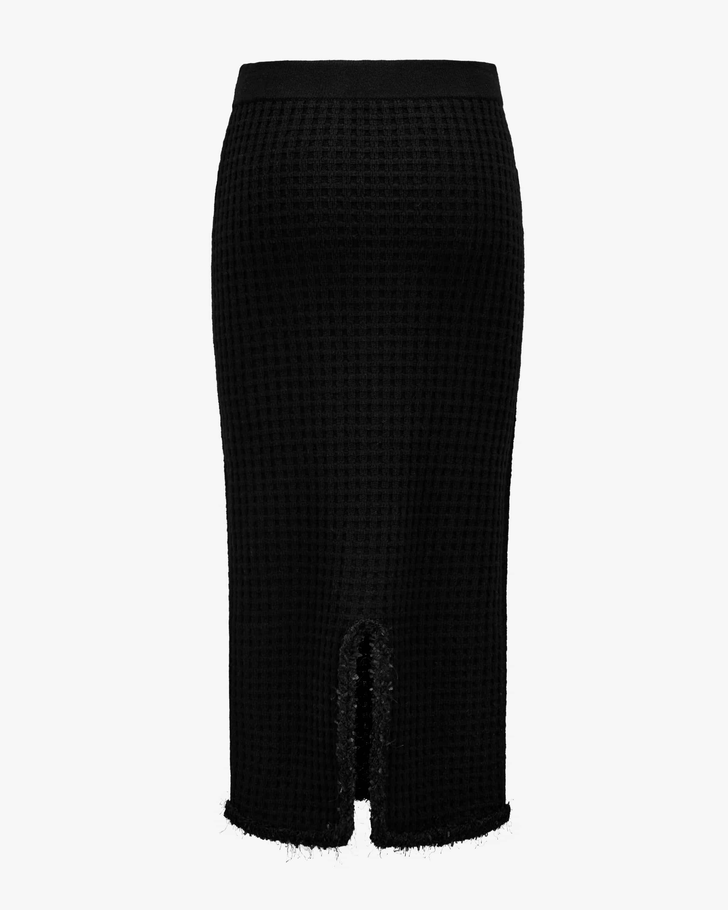 Strickrock für Damen von Allude in Schwarz. Das Münchner Label wurde 1993 von Andrea Karg gegründet und ist bekannt für luxuriöse Strickmode aus edlem Cashmere. Auch dieses Modell überzeugt mit edlem Schurwoll-Cashmere-Mix in Karo- Strick-Aufmachung, während die besondere Borten-Applikation und der Schlitz einen eleganten und femininen Look verleihen.