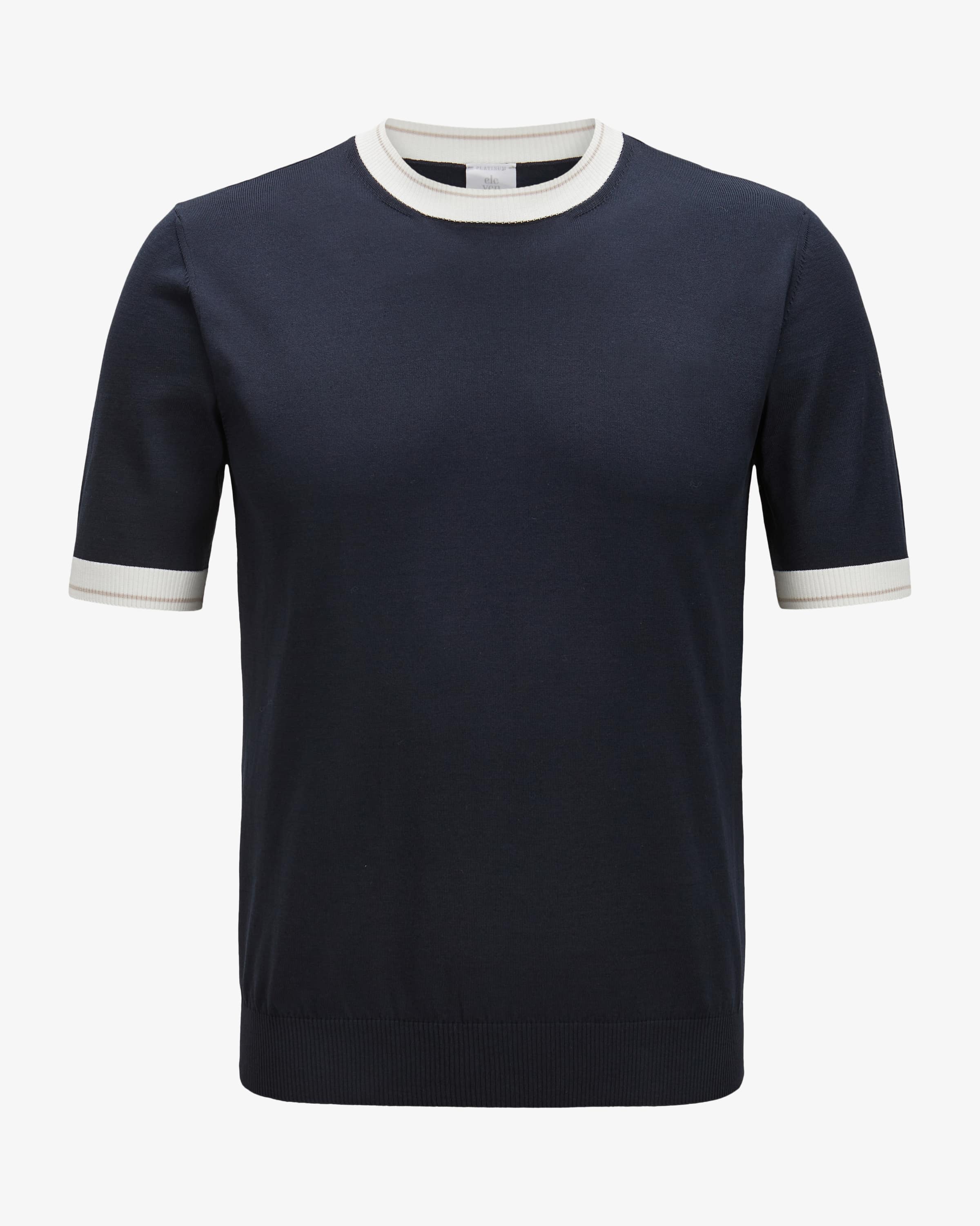 Strickshirt für Herren von Eleventy in Navy und Off-White. Das Modell aus angenehmer Baumwoll-Qualität avanciert dank des sportiven Strick-Designs mit kontrastfarbenen Rippstrick-Elementen zum vielseitig kombinierbaren Basic, das in keinem Kleiderschrank fehlen darf.