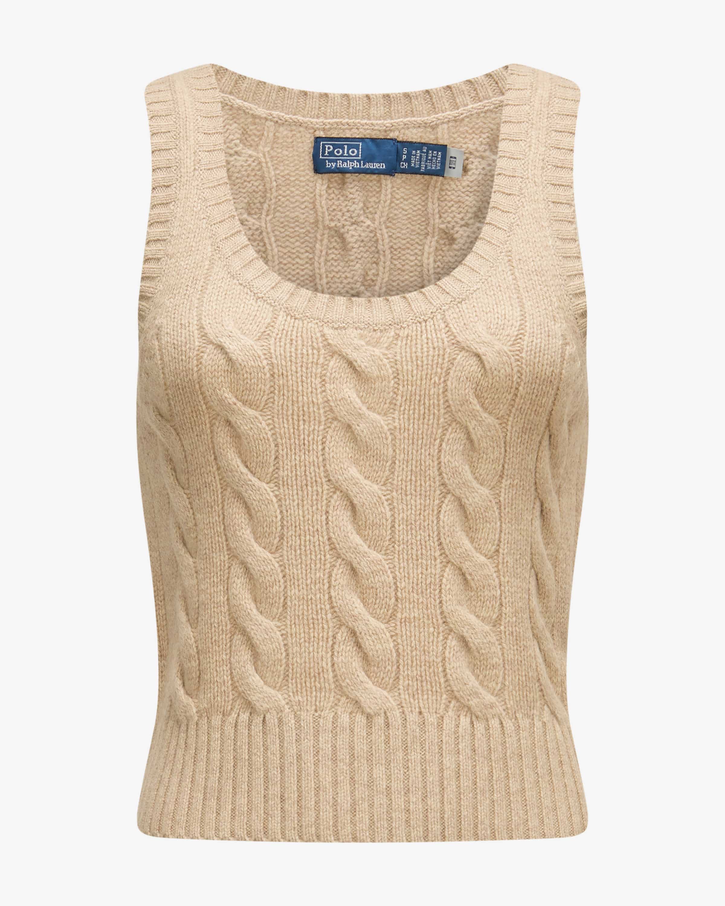 Stricktop für Damen von Polo Ralph Lauren in Beige. Während der hochwertige Woll-Cashmere-Mix in schwerer Haptik einen komfortablen Strick-Look kreiert, verleiht das klassische Zopfstrickmuster einen charakteristischen Touch. Kombiniert als Layering-Piece entsteht ein moderner Herbst-Charakter.