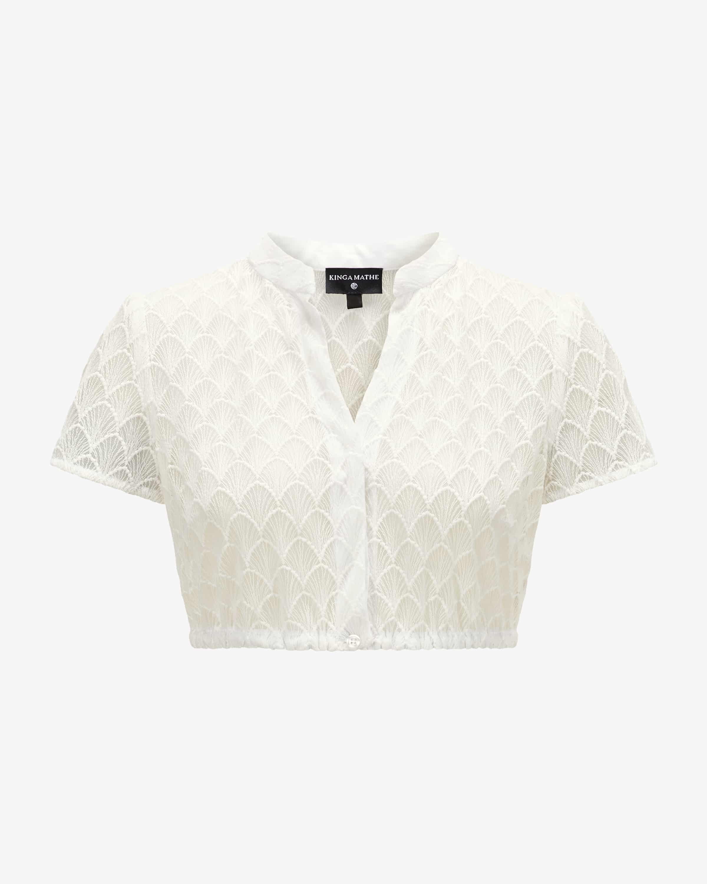 Suri Dirndlbluse Semi-Transparent für Damen von Kinga Mathe in Weiß. Das Modell zeichnet sich durch die semi-transparente Spitzen-Qualität aus, welche dank zartem Muschelmuster stilvoll ergänzt wird - Ein femininer Begleiter für Ihren Trachten-Look.