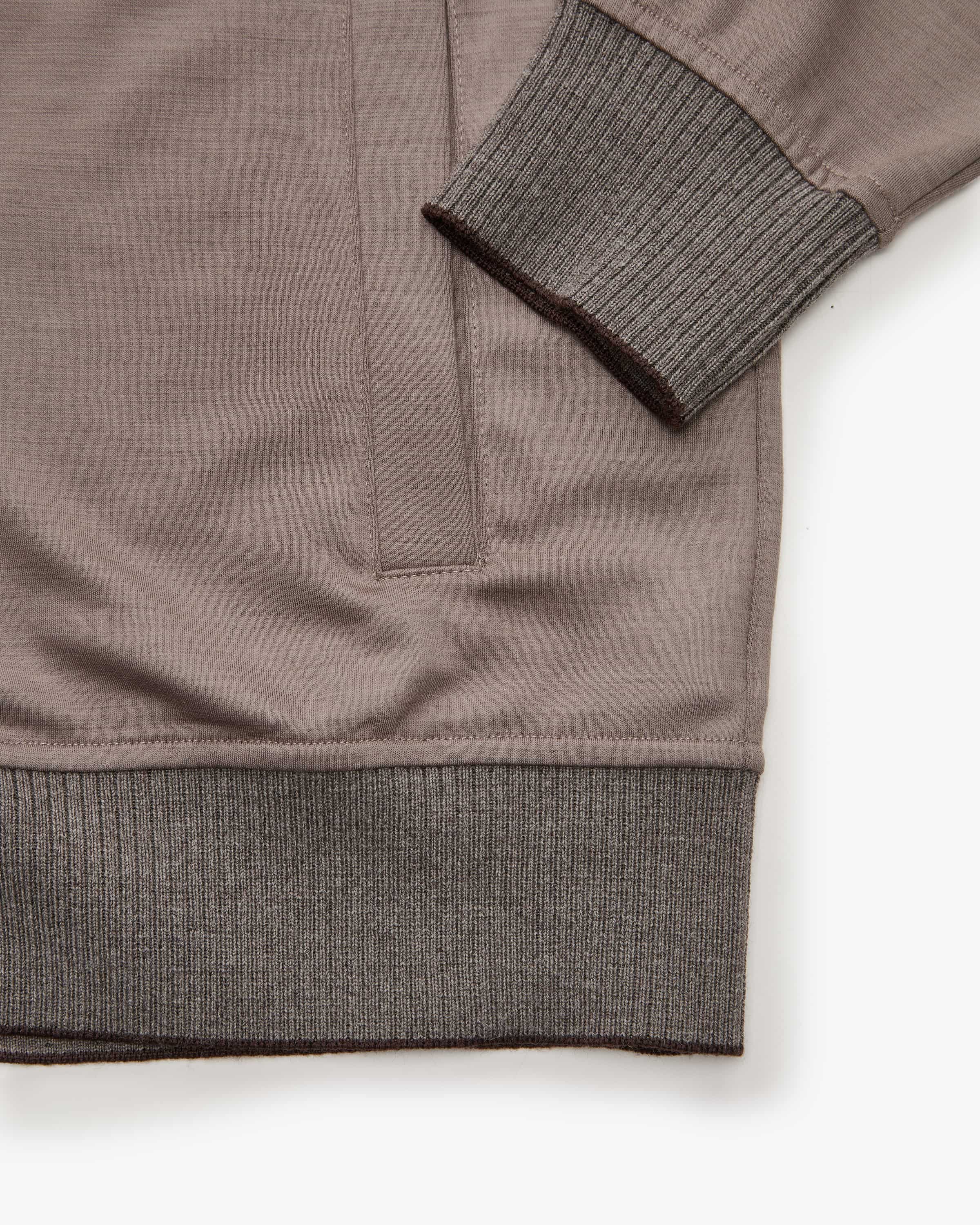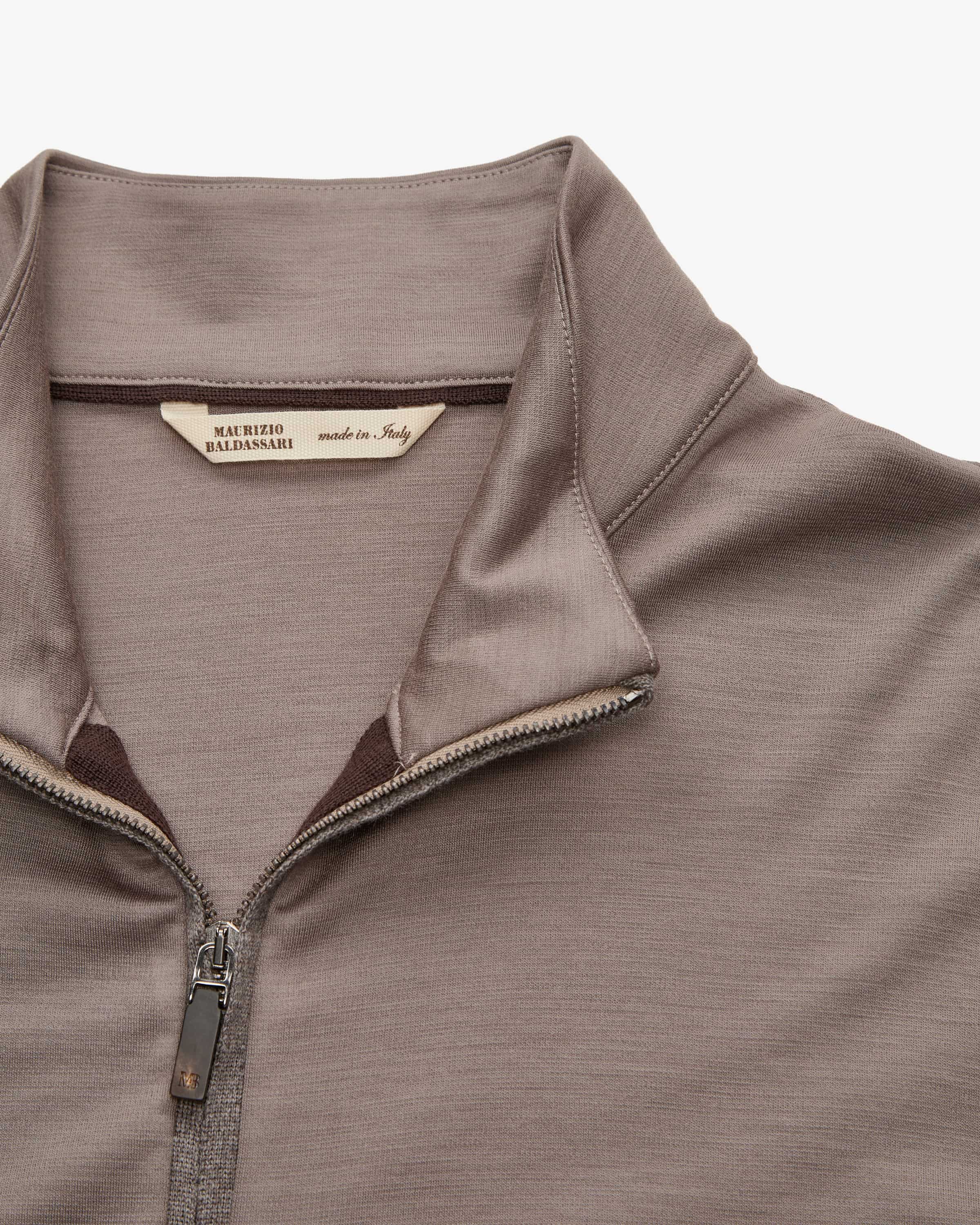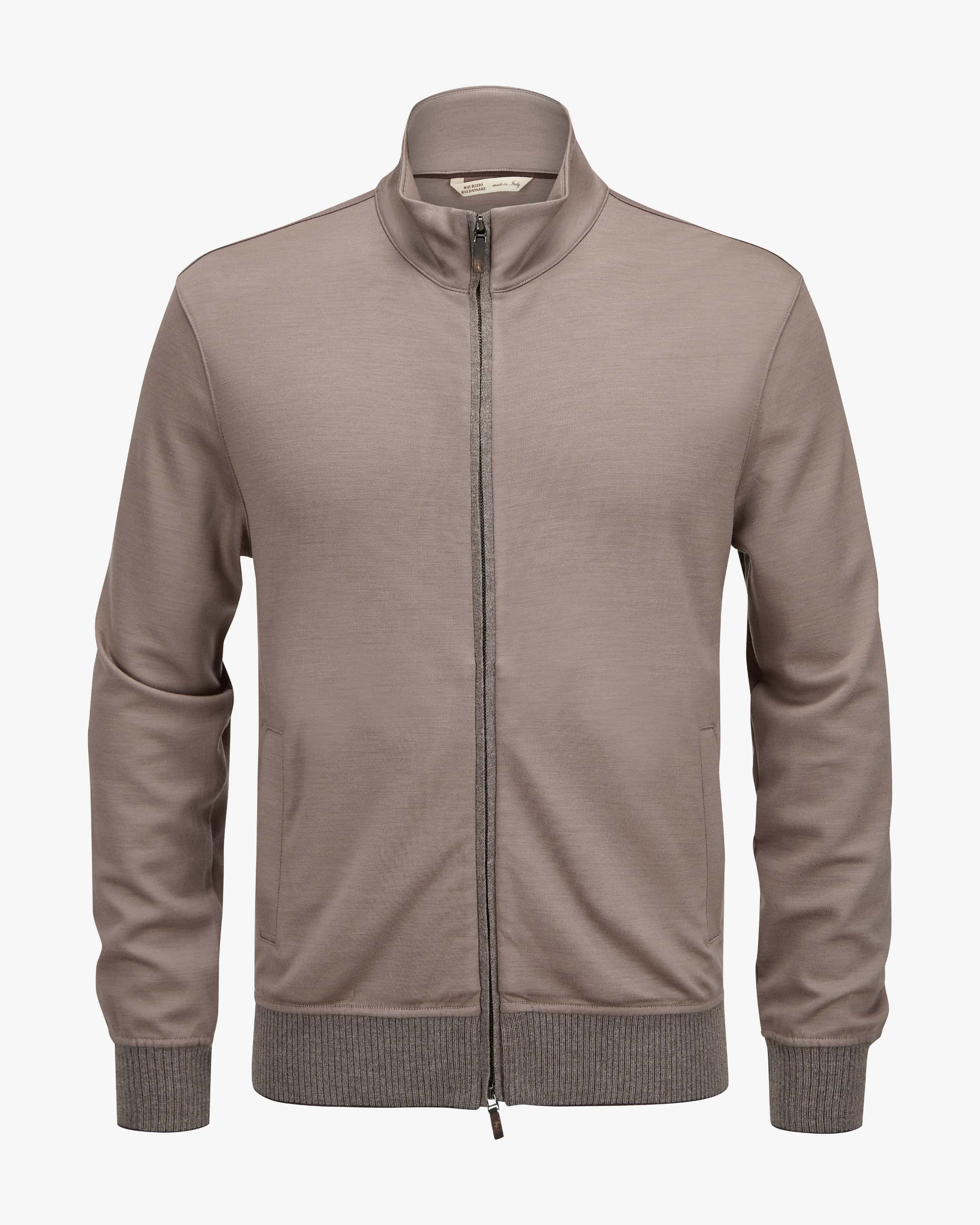 Sweatjacke für Herren von Maurizio Baldassari in Taupe. Das Modell aus hochwertiger Schurwolle besticht mit einem besonders weichen Griff, während das klassische Design einen modischen Alltagsbegleiter in maskuliner Blouson- Aufmachung kreiert.