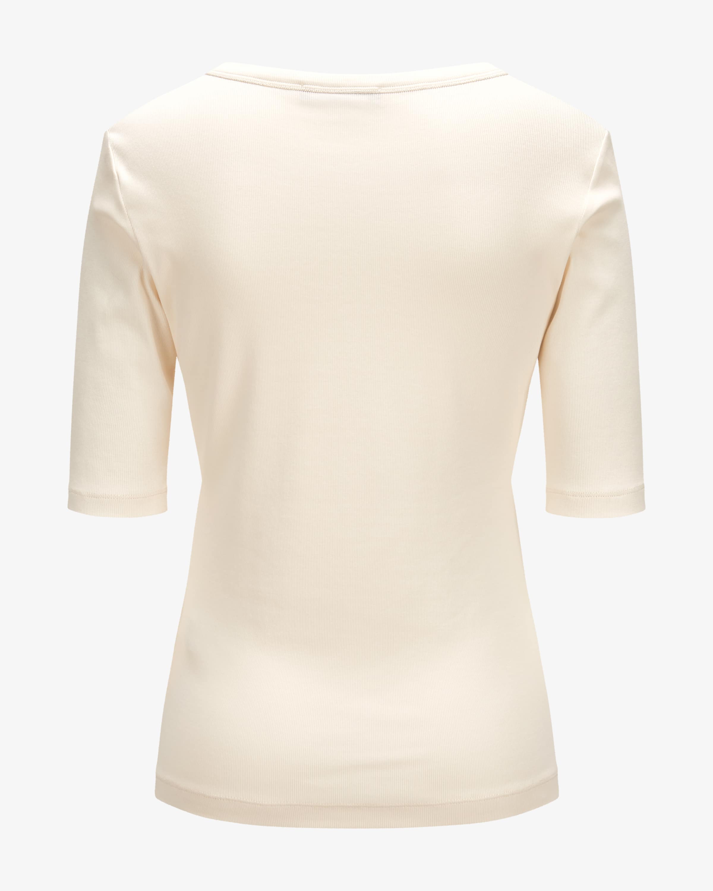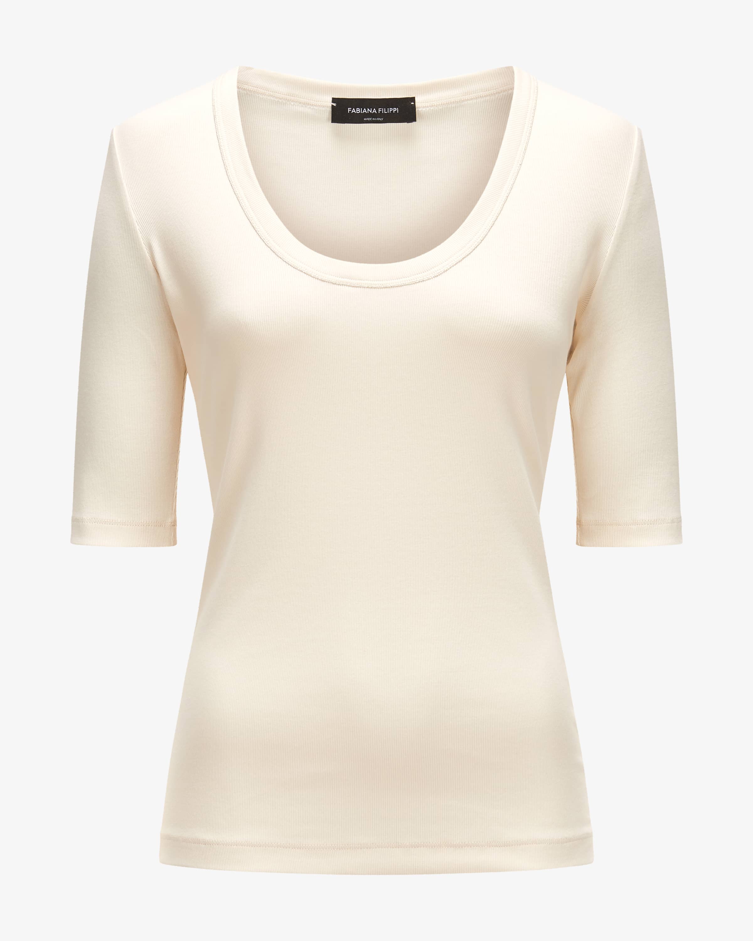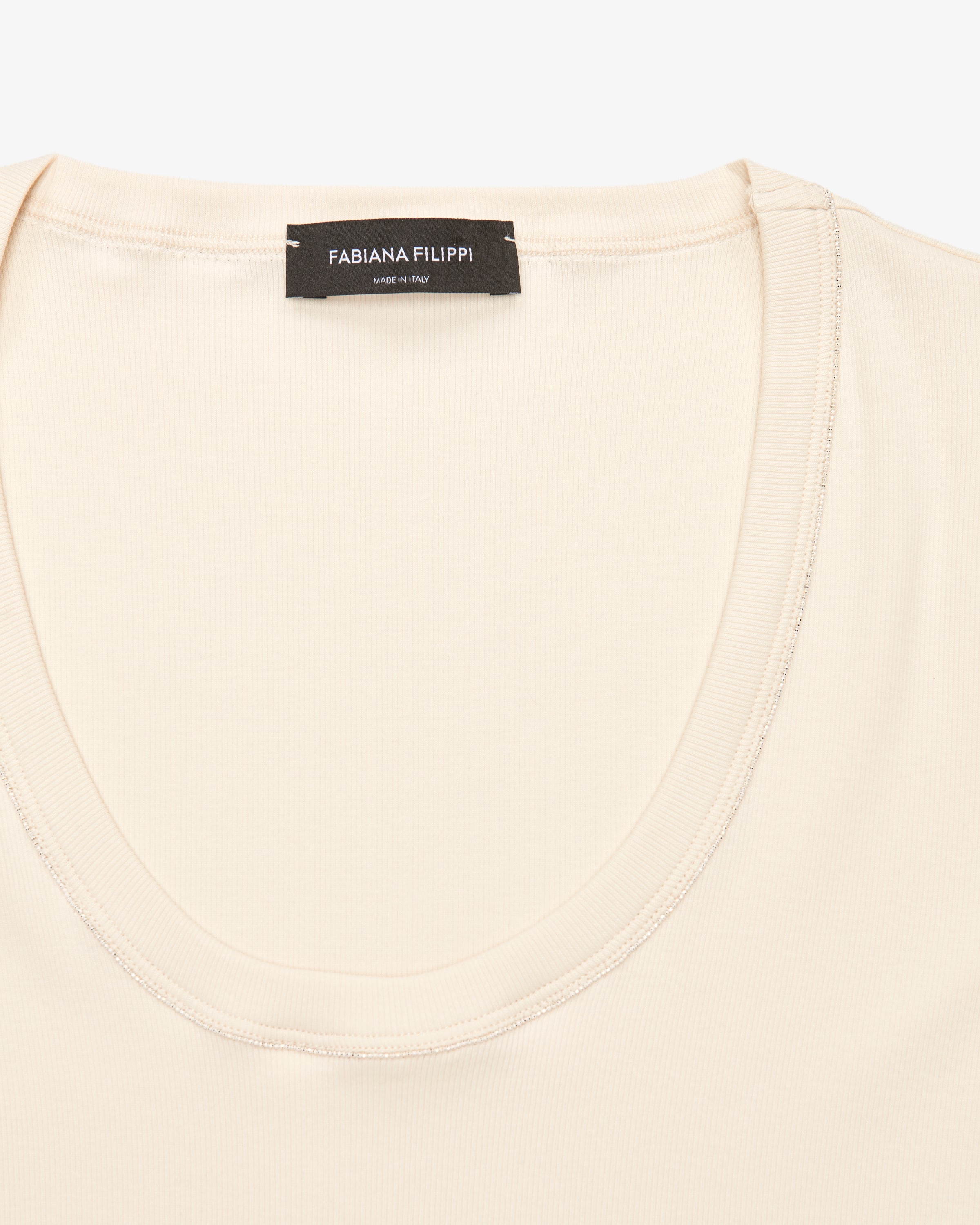 T-Shirt für Damen von Fabiana Filippi in Creme. Das Modell aus elastischer Baumwoll-Verarbeitung begeistert in modischer Rippstrick-Qualität und wird durch die changierende Ketten-Applikation gekonnt vollendet.