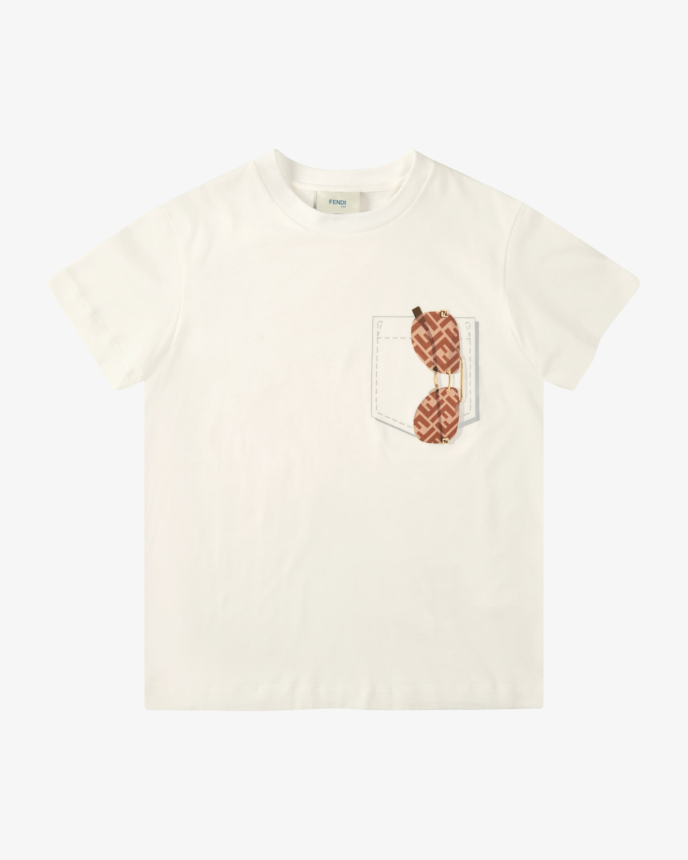 T-Shirt für Kinder von Fendi Kids in Weiß. Das schlichte Design wird durch den modischen Sonnenbrillen-Aufdruck aufgewertet, während die weiche Baumwoll- Qualität eine angenehme Haptik verspricht.