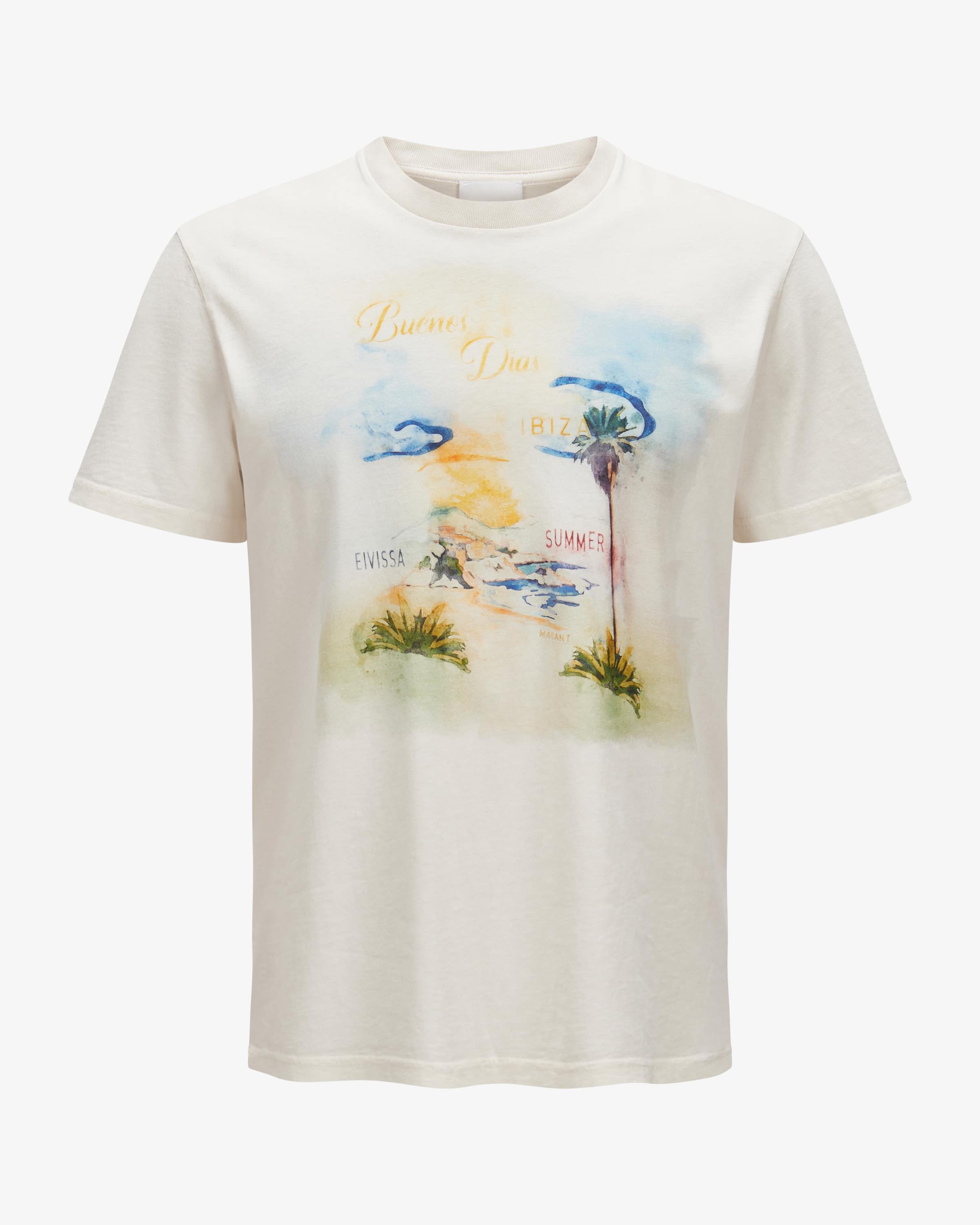 T-Shirt für Herren von Isabel Marant in Ecru und Bunt. Das Label steht für lässige Pariser Eleganz mit bohemischem Einfluss. Das Modell in klassischer Jersey-Qualität überzeugt dank der legeren Schnittführung als modisches Basic, welches durch den farbenfrohen Aquarell-Print mit Ibiza-Motiv einen sommerlichen Charakter erhält.
