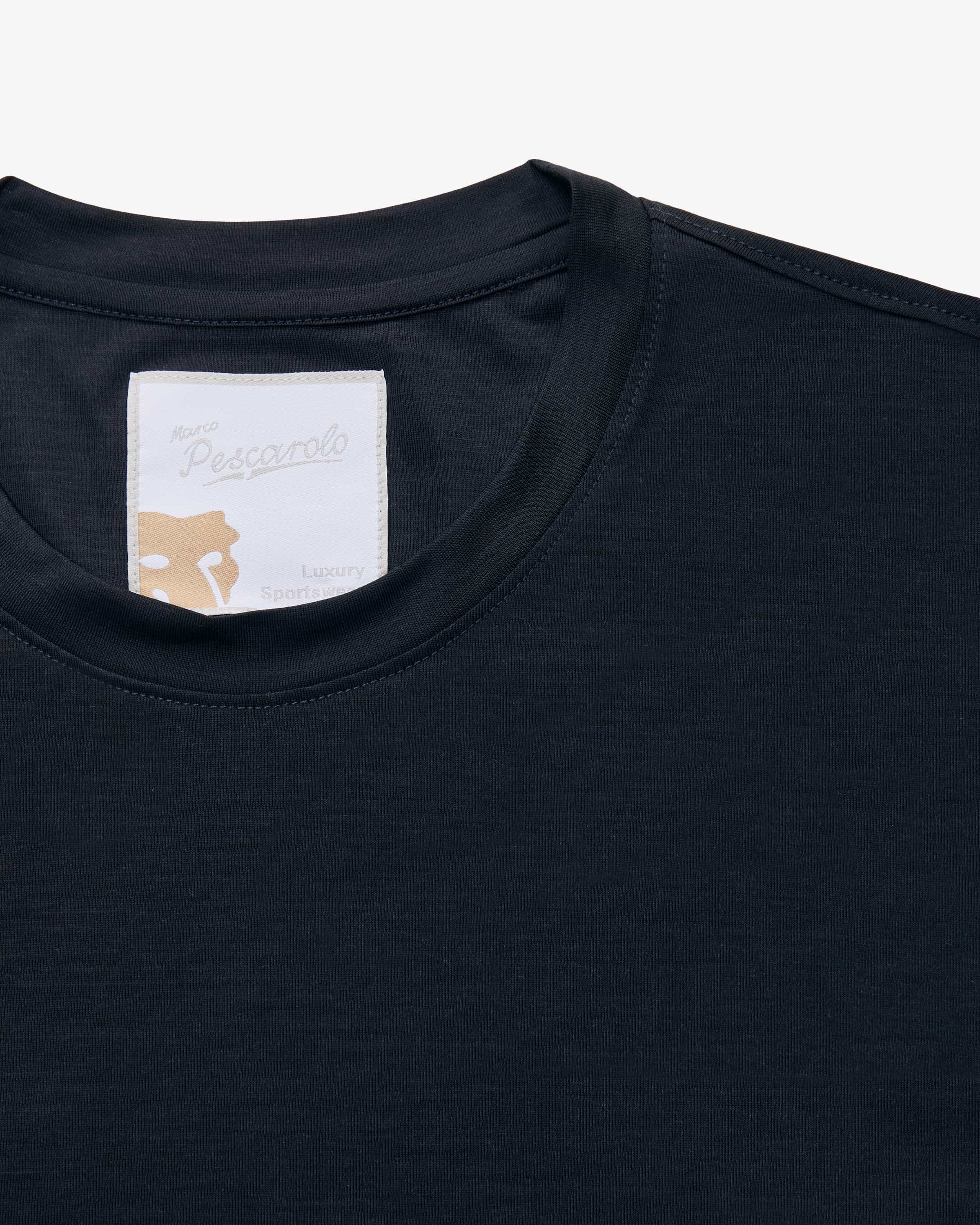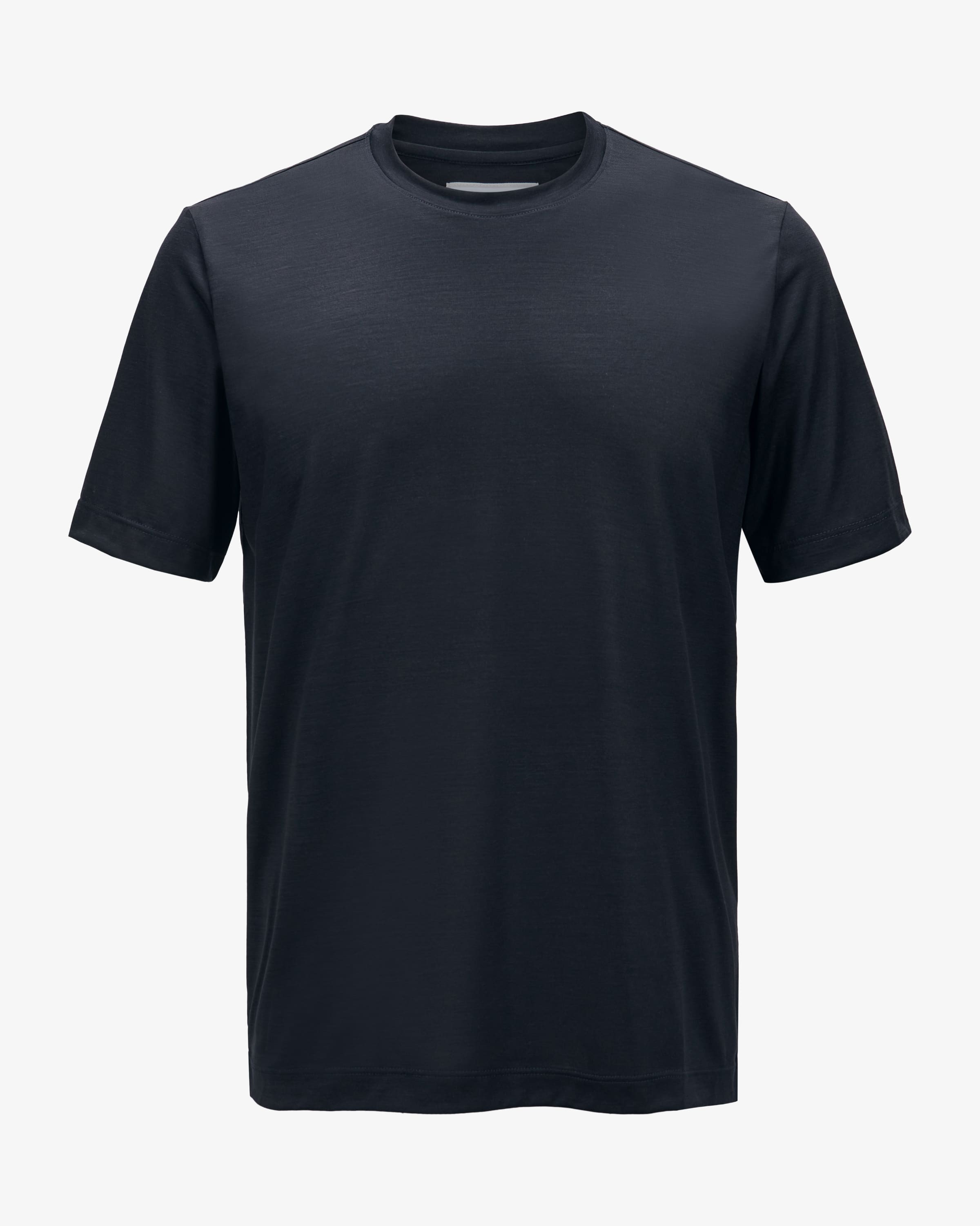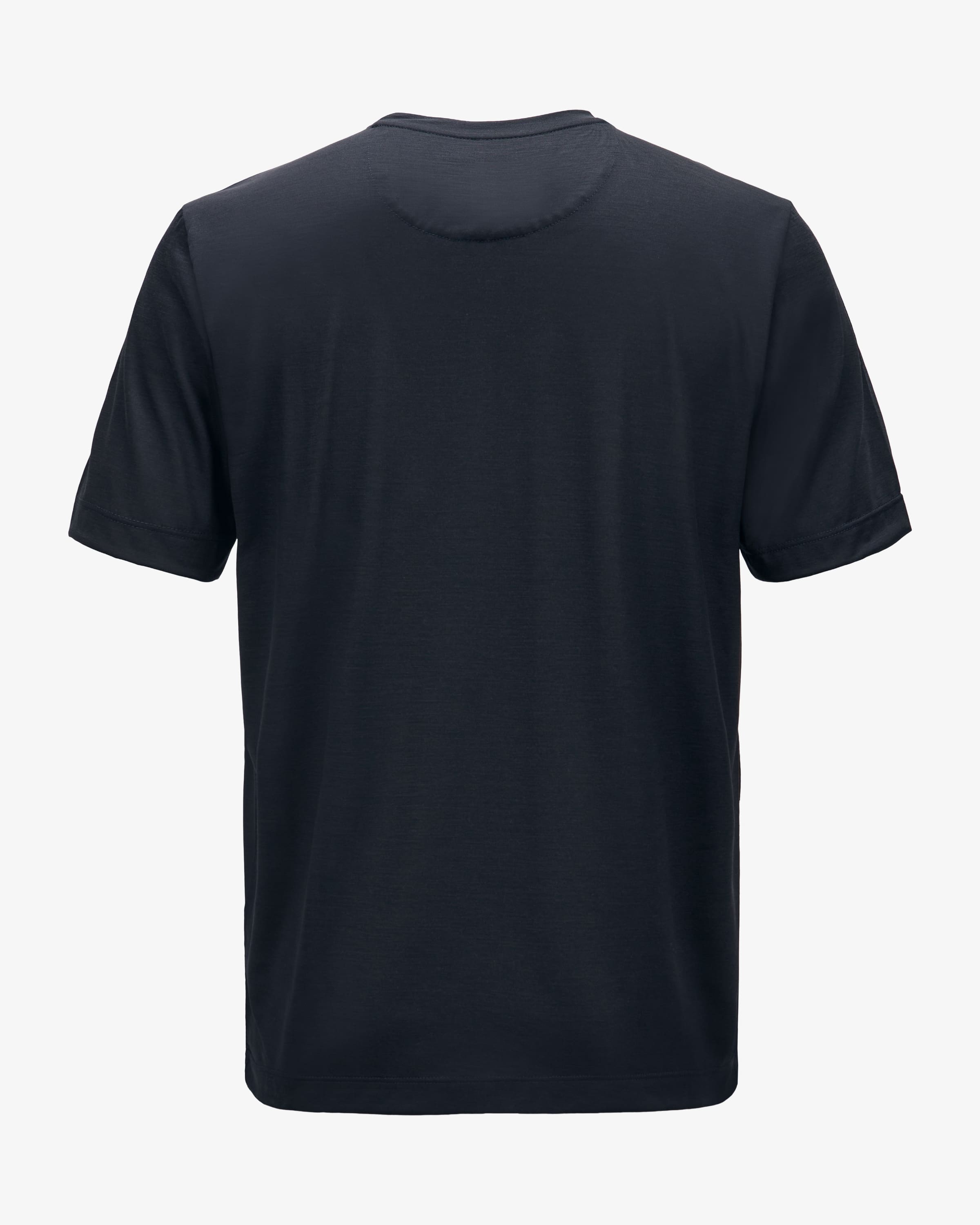 T-Shirt James für Herren von Marco Pescarolo in Navy. Das Luxury Sportswear Modell in modernem Schnitt überzeugt mit leichter und zugleich hochwertiger Schurwoll-Qualität in glatter Qualität, während die Kombination aus klassischem Schnitt und meliertem Design einen modernen Casual-Begleiter schafft.