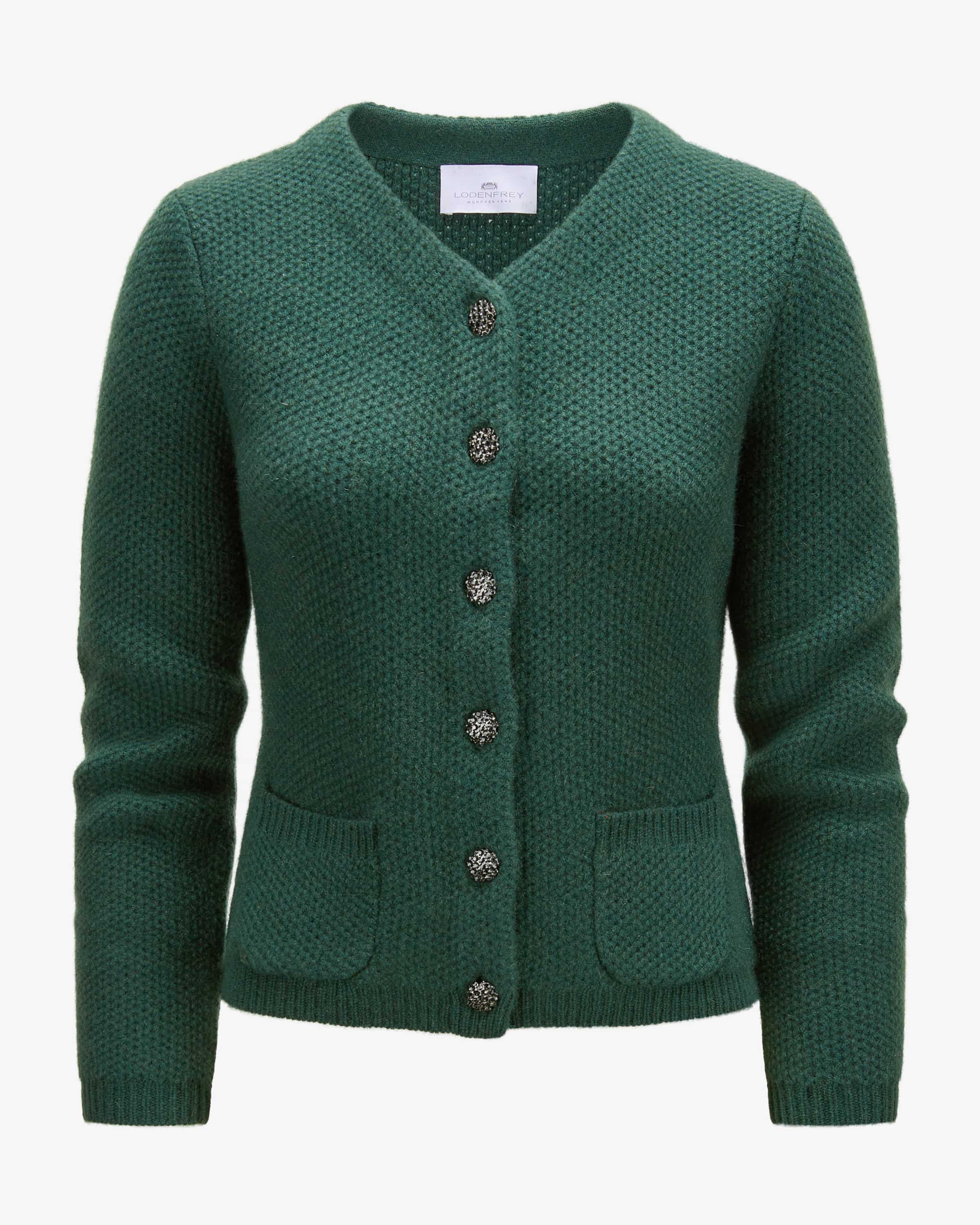 Trachten-Cashmere-Strickjacke für Damen von LODENFREY München 1842 in Flaschengrün. Tradition und Moderne in perfektem Zusammenspiel – Das Modell begeistert durch die klassische Linksstrick-Qualität, während edle Schmuckstein- Knöpfe den Trachten-Look charmant abrunden.