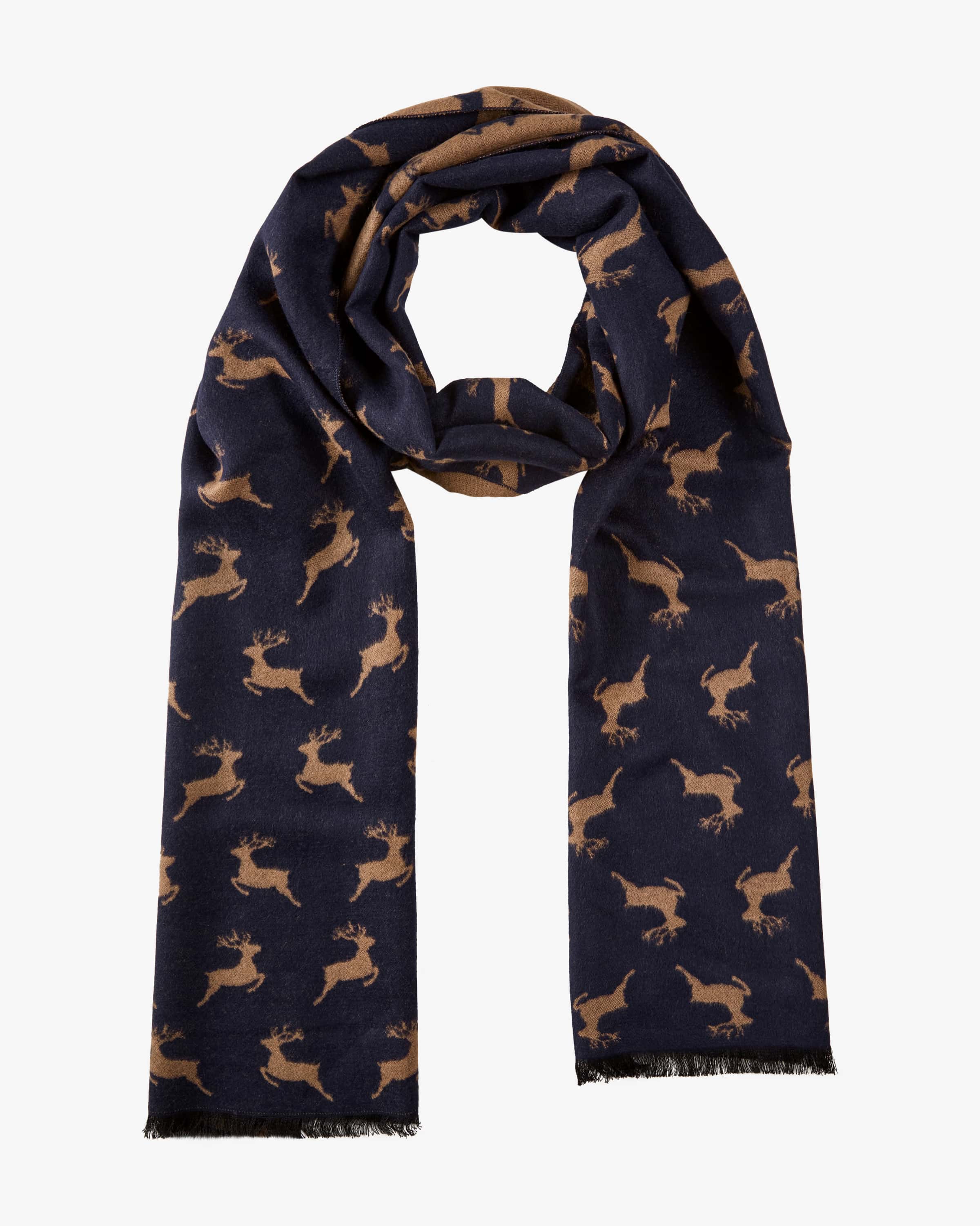 Trachten-Schal für Herren von Luise Steiner in Marine und Beige. Österreichische Traditionsmarke für Trachten-Accessoires mit Qualität. Dank der weichen Material-Verarbeitung erhält das zweiseitige Modell eine weiche Haptik, während das traditionelle Hirsch-Allover-Dessin ein modernes Trachten-Accessoire kreiert.