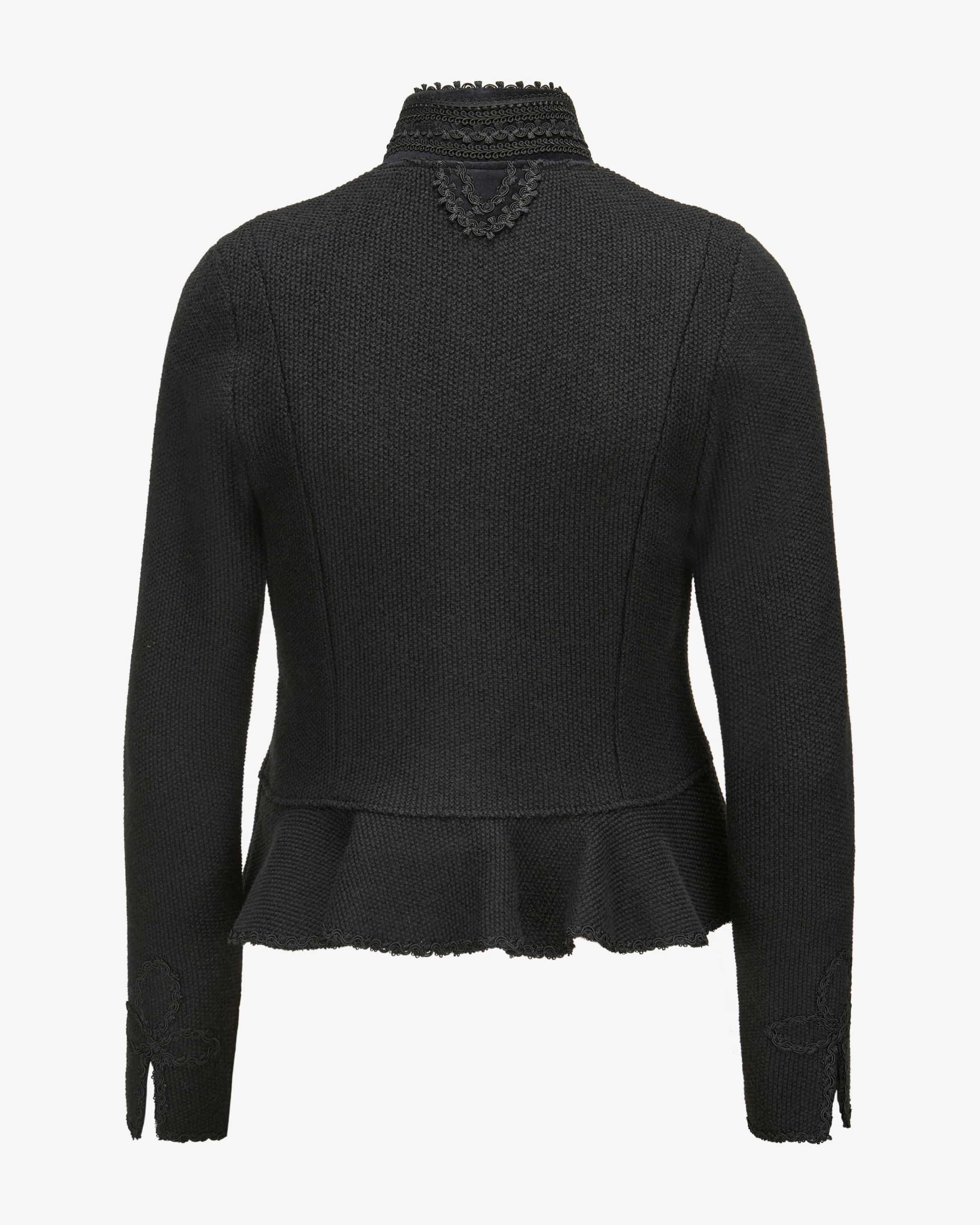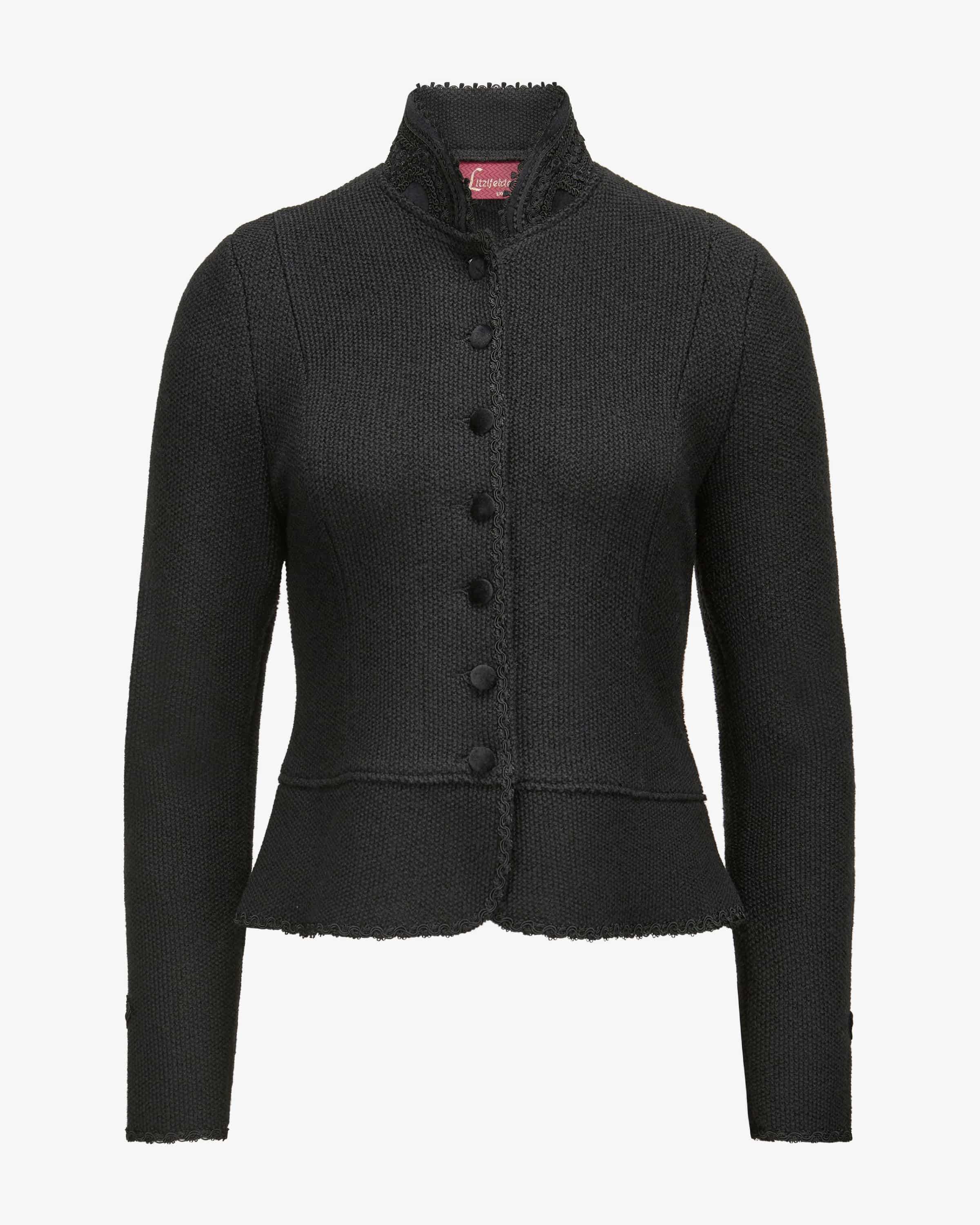 Trachten-Strickjacke für Damen von Litzlfelder Strickmoden in Schwarz. Dieses Modell besticht dank der taillierten Passform und dem Schößchen mit einer modisch-femininen Ausstrahlung, während die hochwertige Schurwoll-Qualität einen angenehmen Begleiter für traditionelle Looks kreiert. Zugleich verleihen zarte Borten-Details in Kombination mit Samt eine romantische Note.