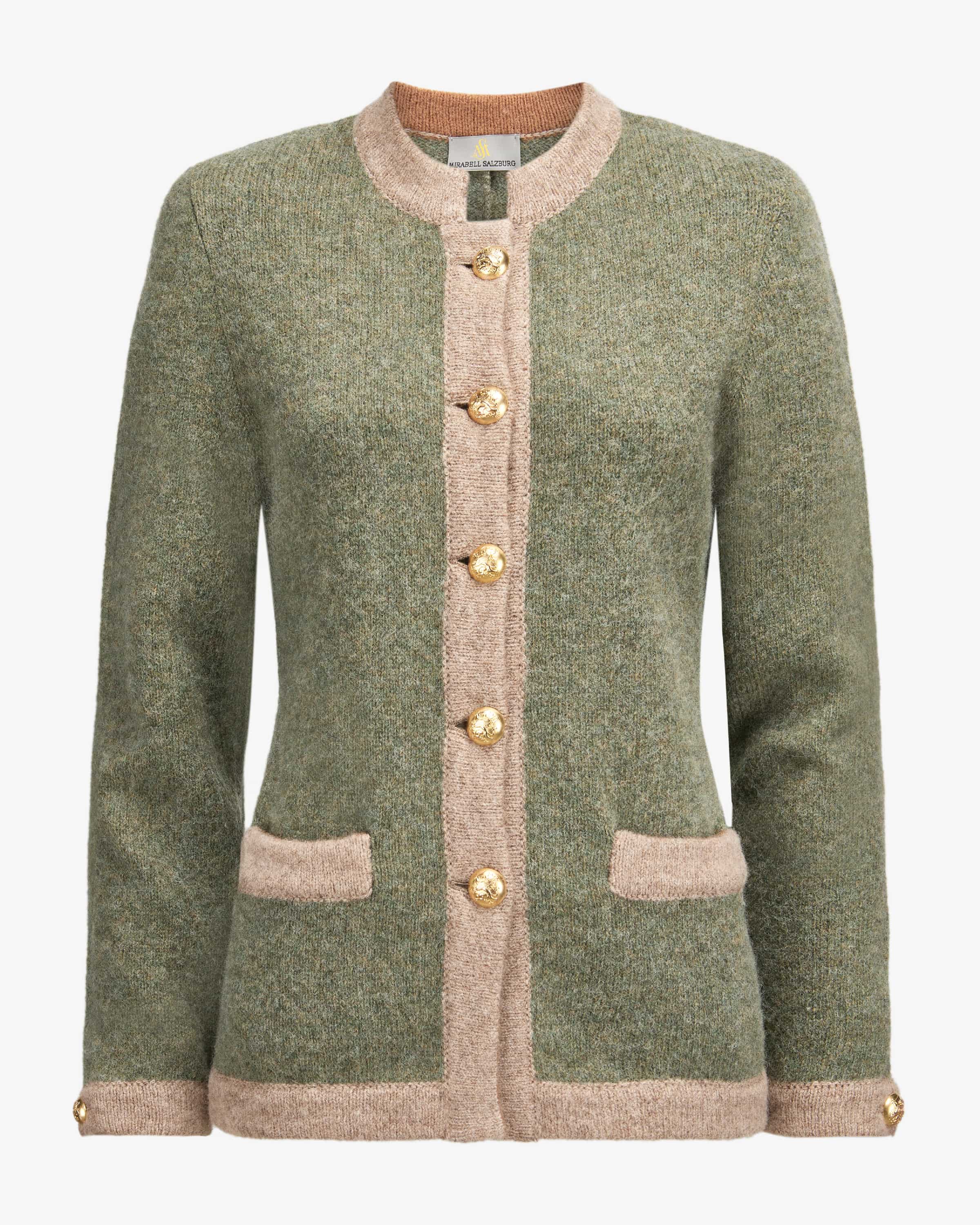 Trachten-Strickjacke für Damen von Mirabell in Oliv und Beige. Die hochwertige Schurwoll-Qualität verleiht dem klassischen Modell eine unverwechselbare Haptik, während goldfarbene Wappenknöpfe sowie kontrastierende Elemente einen traditionellen Look mit moderner Note schaffen.