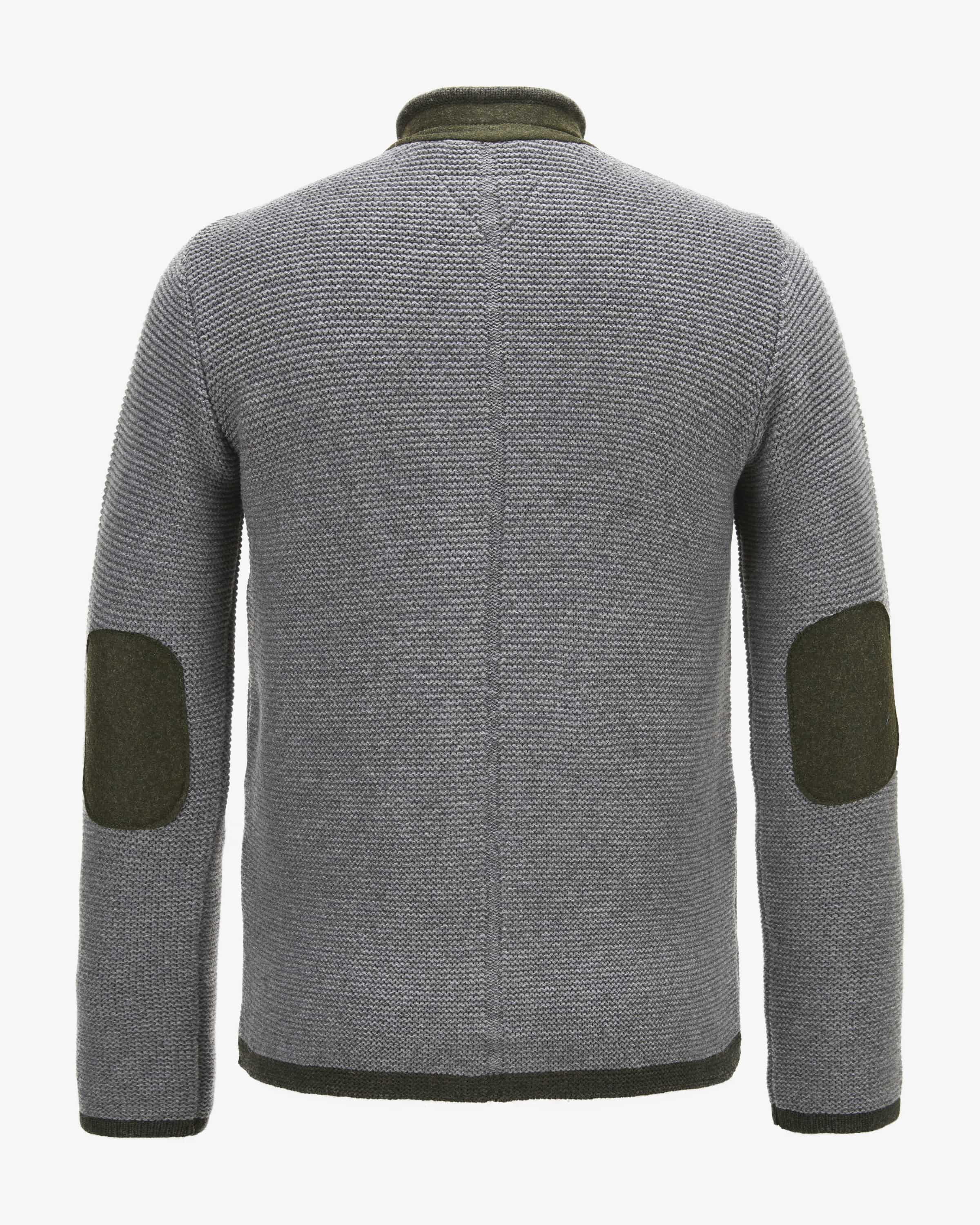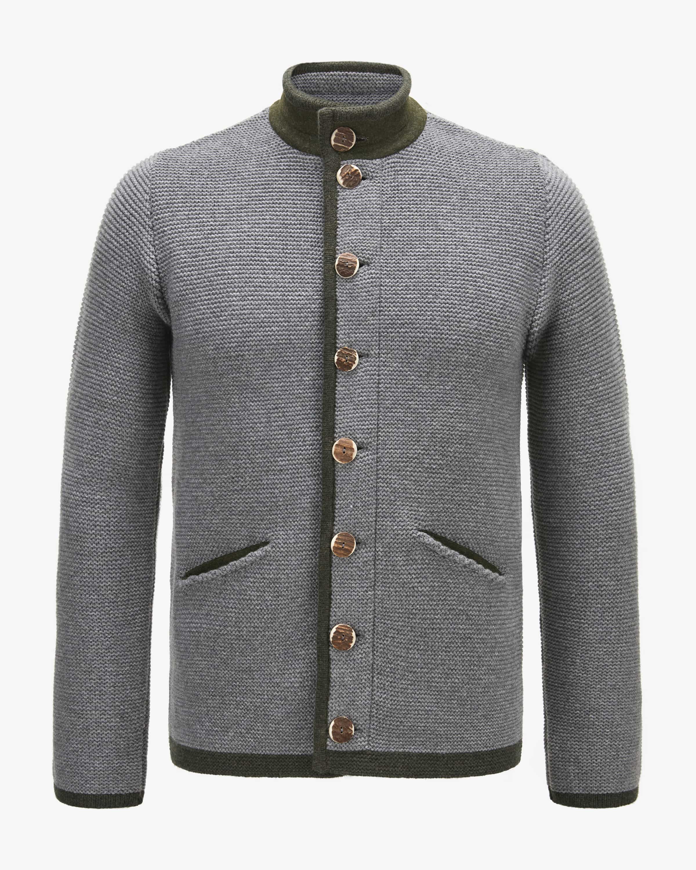 Trachten-Strickjacke Amerang für Herren von Schorsch Hackl in Grau und Oliv. Klassisch gestrickt und aus hochwertiger Lammwolle gefertigt, überzeugt das Modell in traditioneller Aufmachung. Kontrastpaspeln sowie rustikale Hornknöpfe vollenden das Gesamtbild gekonnt.