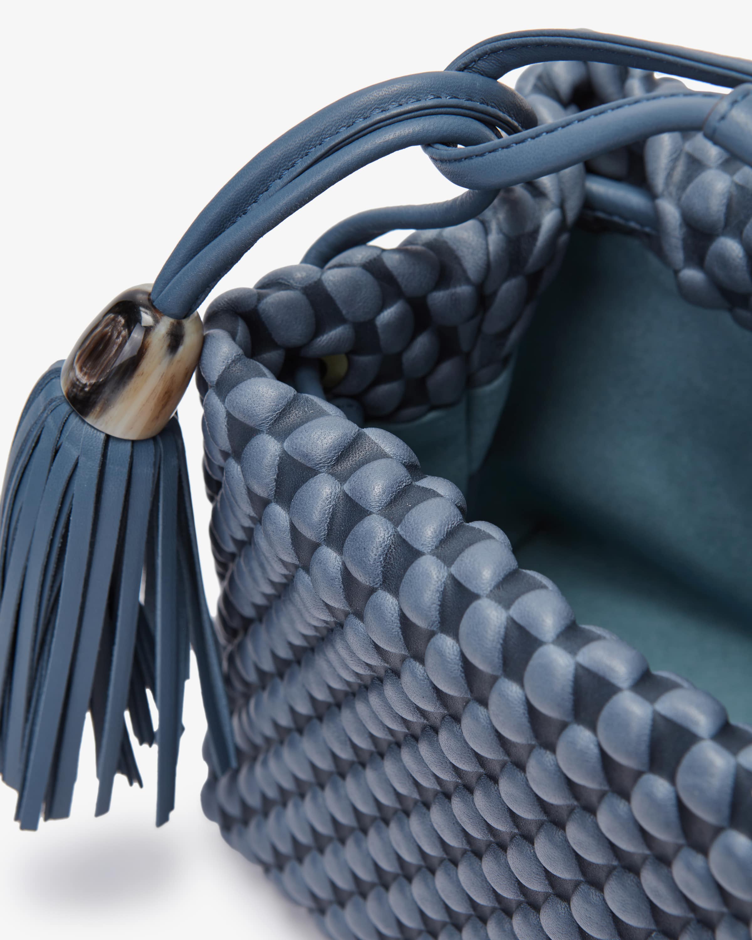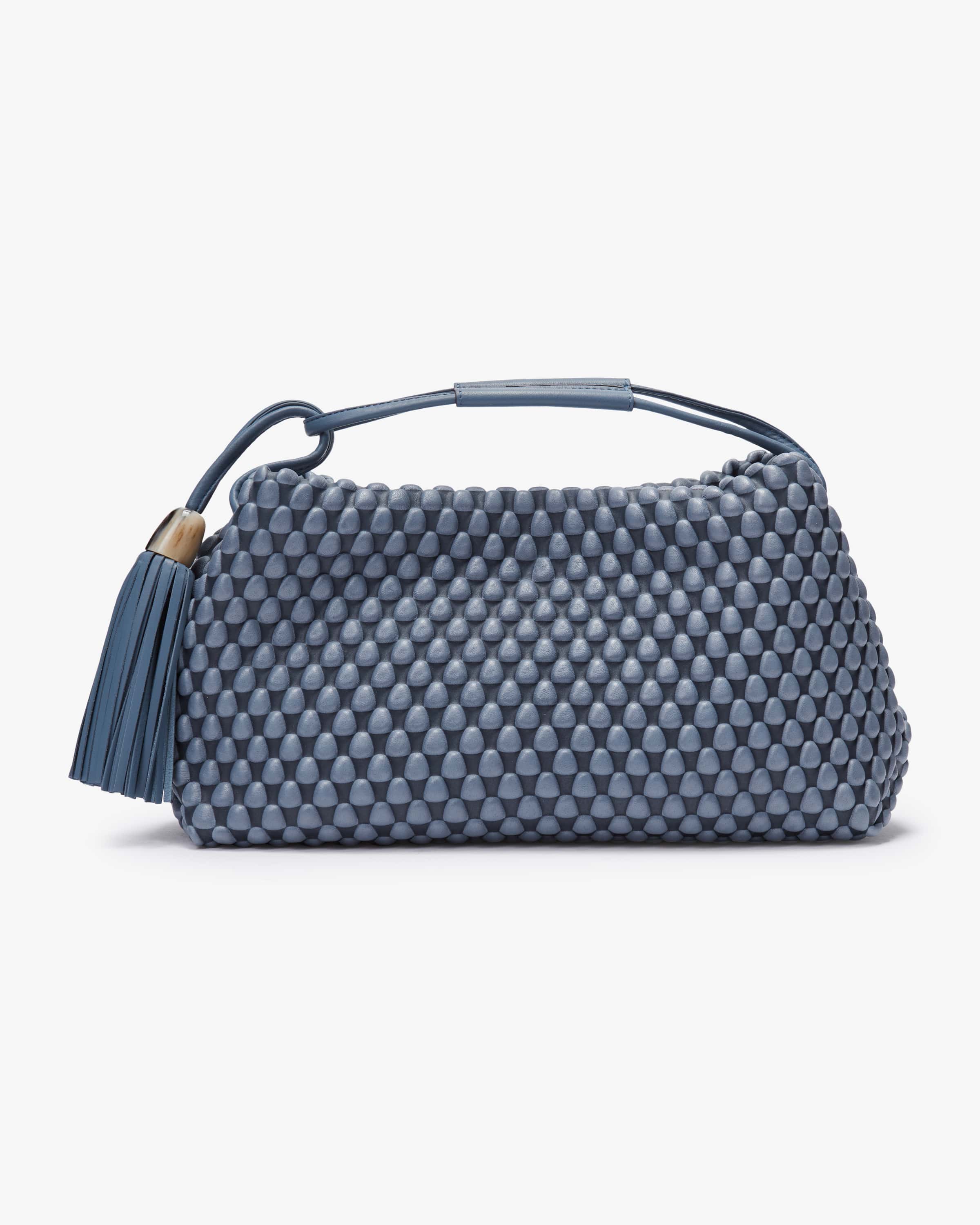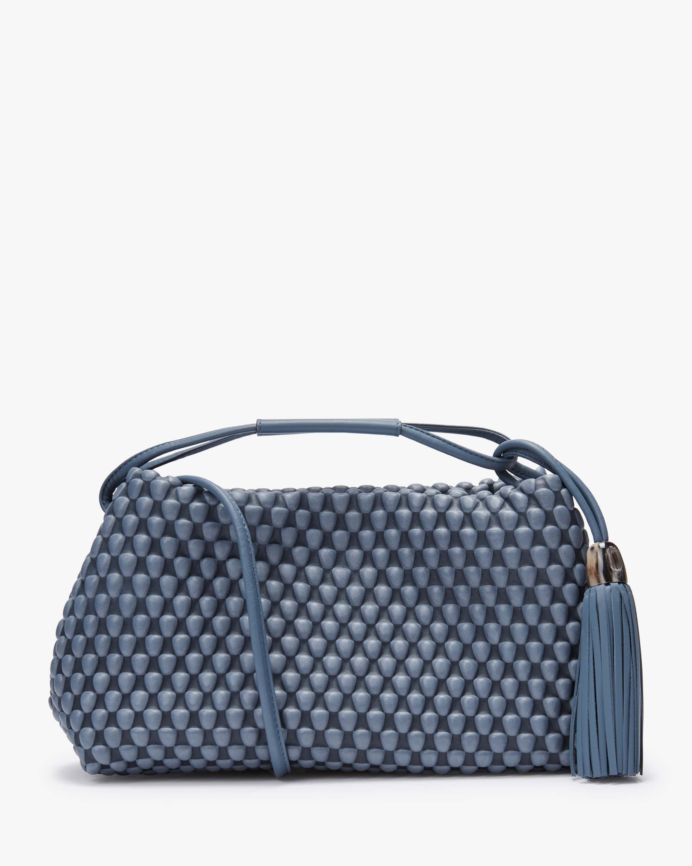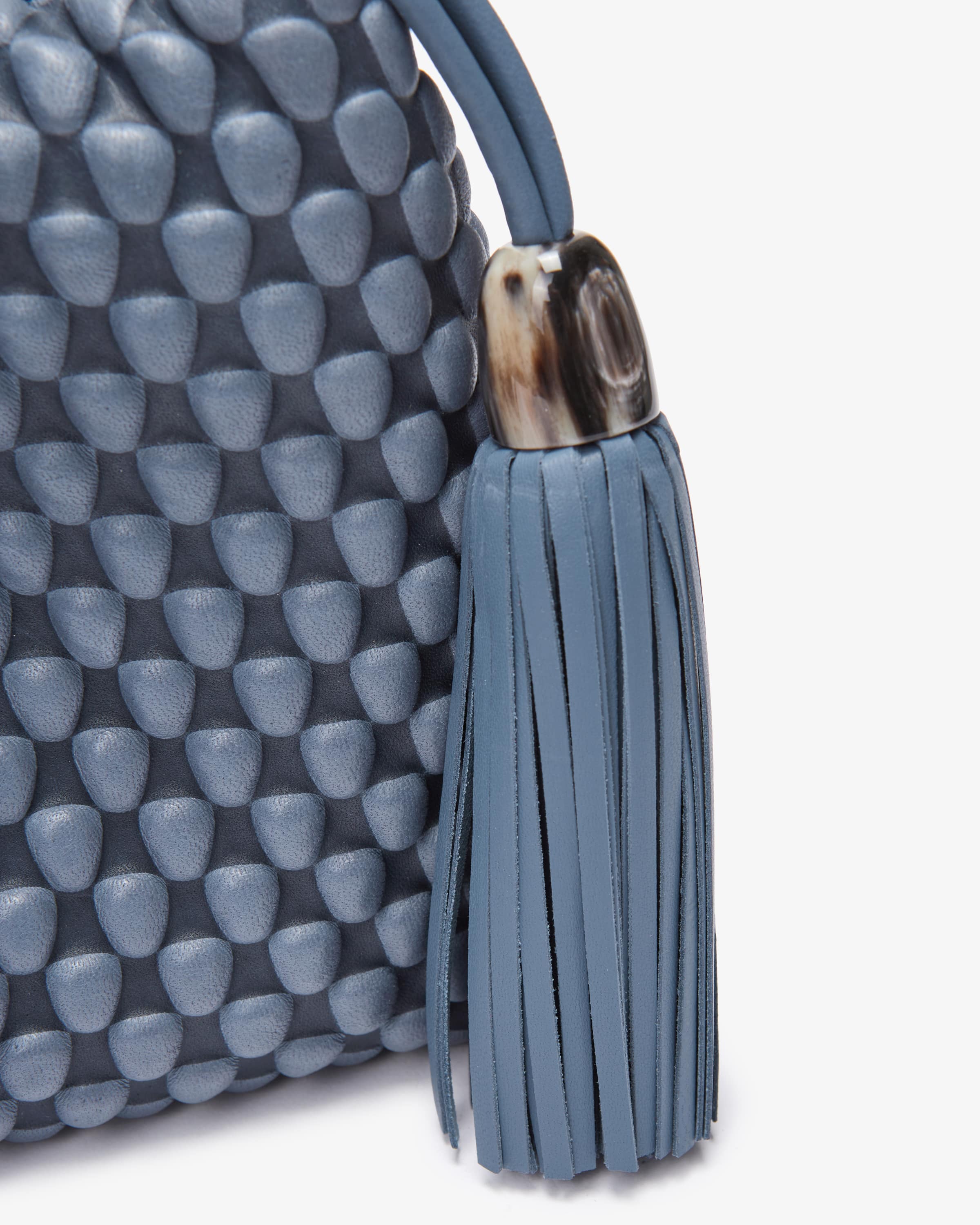 Tango Large Umhängetasche von Tissa Fontaneda in Blau. Das 2010 gegründete Label vereint Handwerkliches Können und Liebe zum Detail. Die sofort erkennbare „Bubble Bag“ ist zum Markenzeichen der Kollektion Tissa Fontaneda geworden. Auch dieses Modell begeistert in charakteristischer Aufmachung mit strukturierter Optik, während der Anhänger mit Fransen-Details den letzten Schliff verleiht.