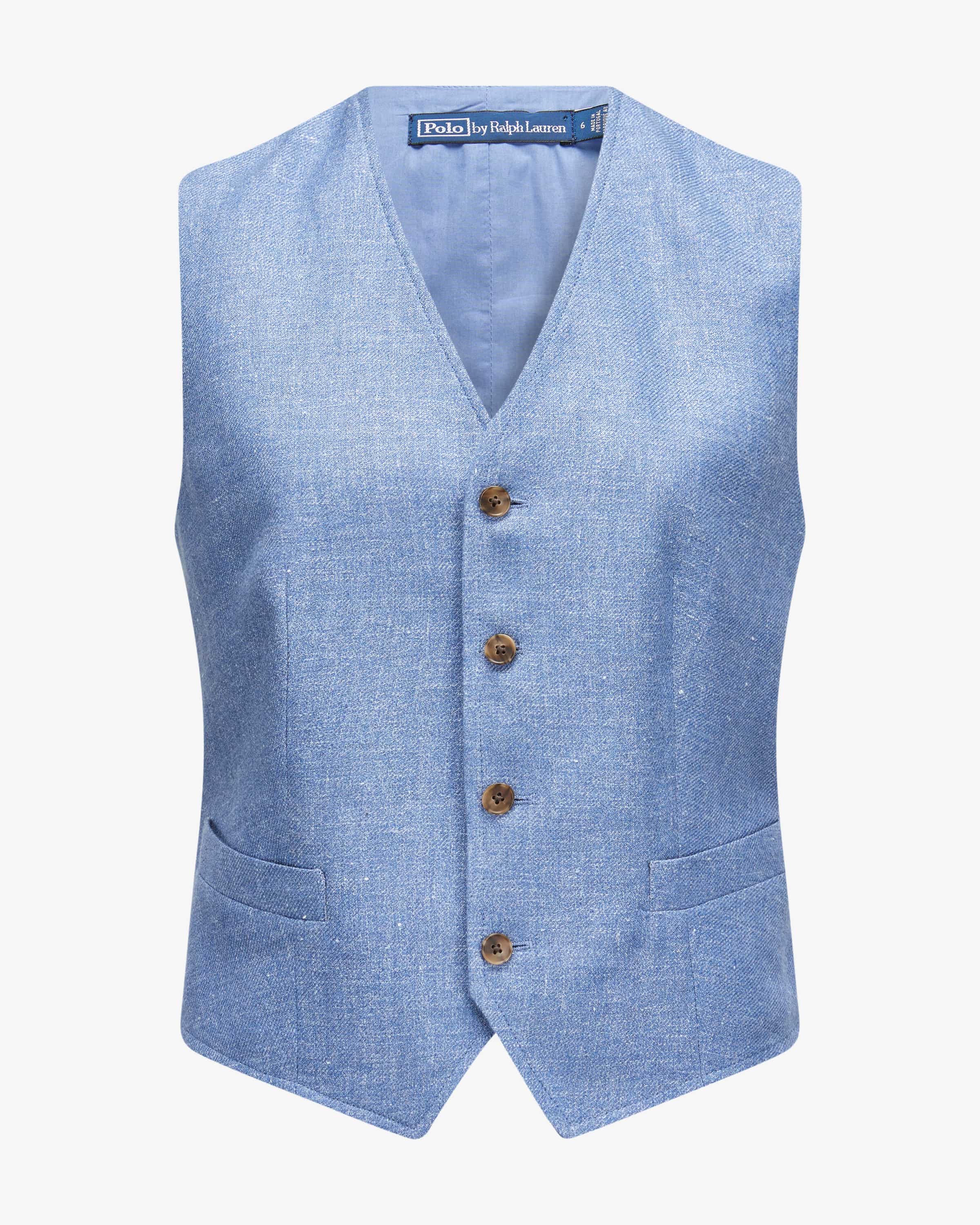 Weste für Damen von Polo Ralph Lauren in Azur. Das Modell in melierter Aufmachung überzeugt mit hochwertigem Leinen-Baumwoll-Mix, während die cleane Aufmachung und klassische Details den Gesamtlook harmonisch abrunden.