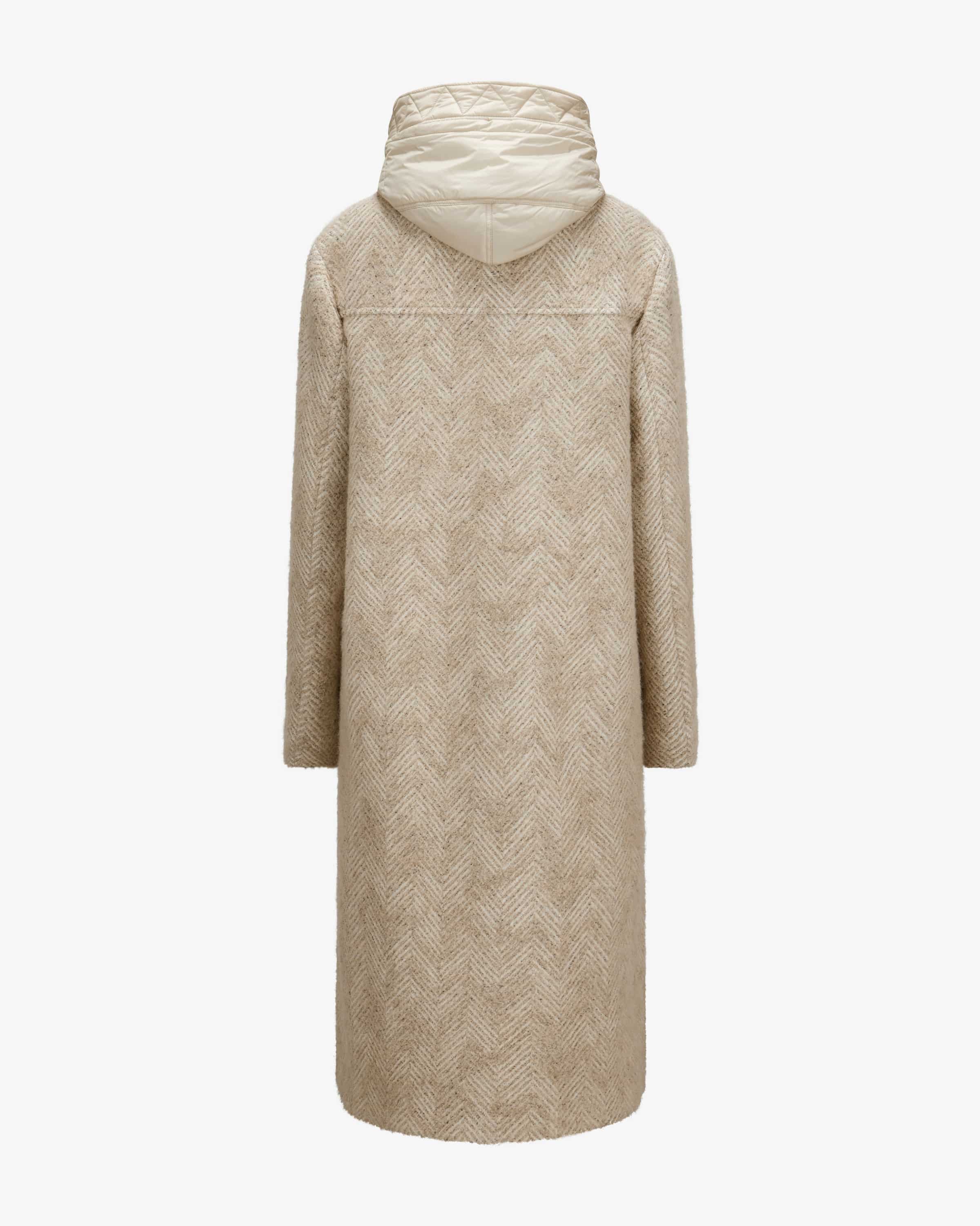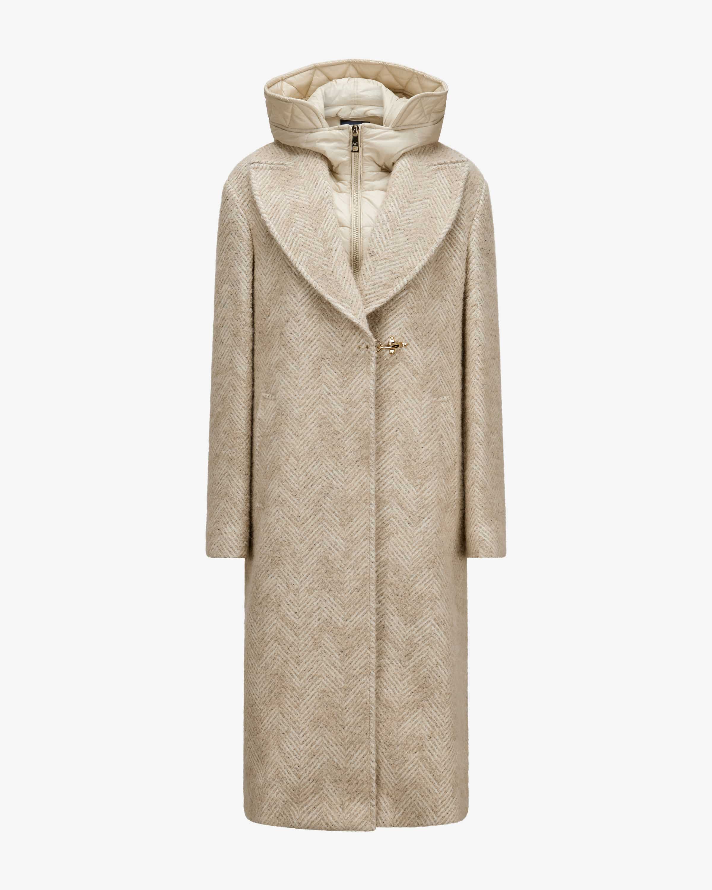 Wollmantel für Damen von Fay in Beige. Die italienische Marke aus dem Hause Tod’s ist bekannt für ihre ikonischen Jacken und Mäntel, die klassische Eleganz mit Funktionalität verbinden. Auch dieses Modell überzeugt mit grafischem Fischgrätmuster in weicher Woll-Mix-Verarbeitung, die für angenehmen Tragekomfort sorgt. Die weite Passform mit raffinierter, abtrennbarer Passe mit Kapuze und der goldfarbene Karabiner-Haken runden den modischen Look gekonnt ab.
