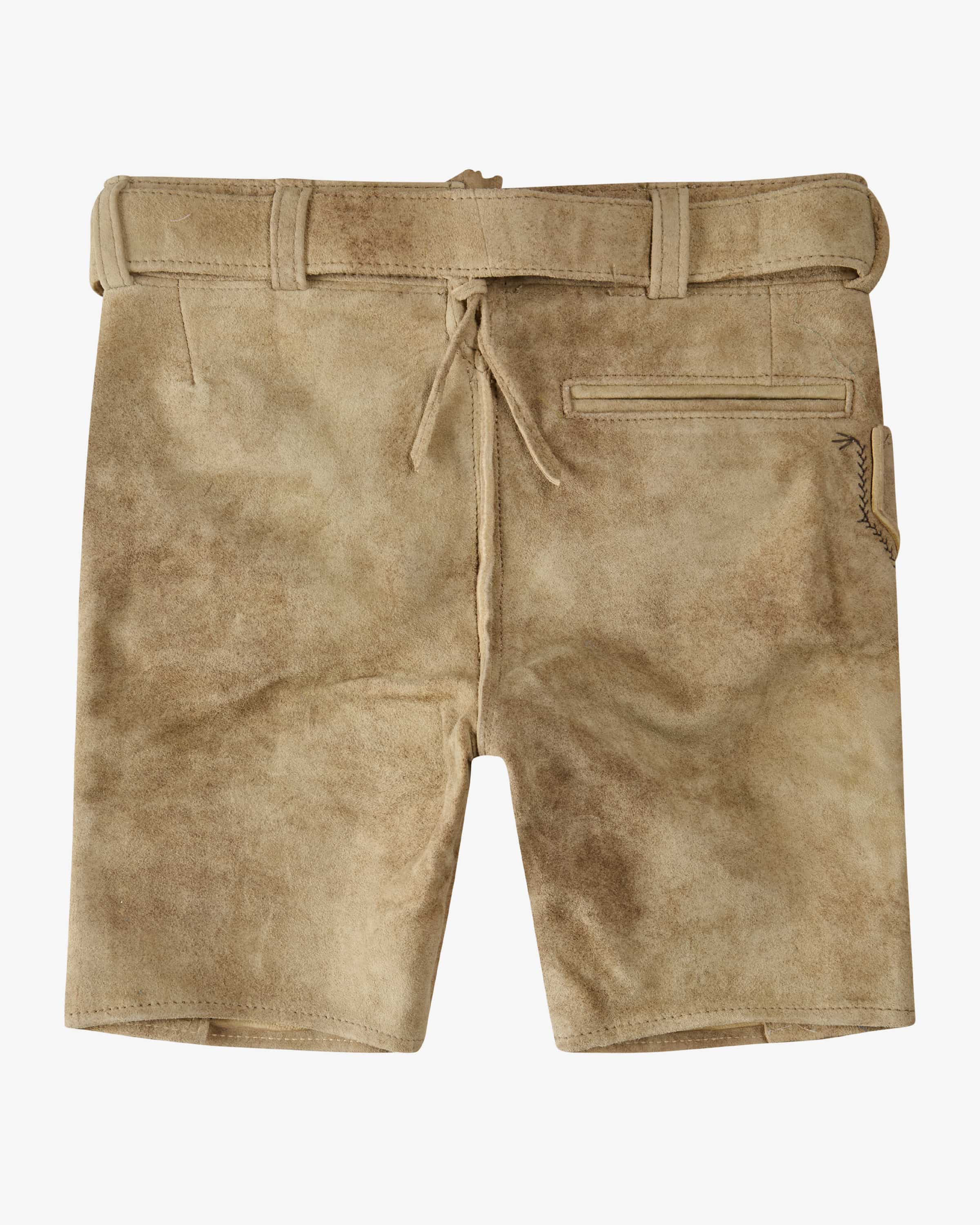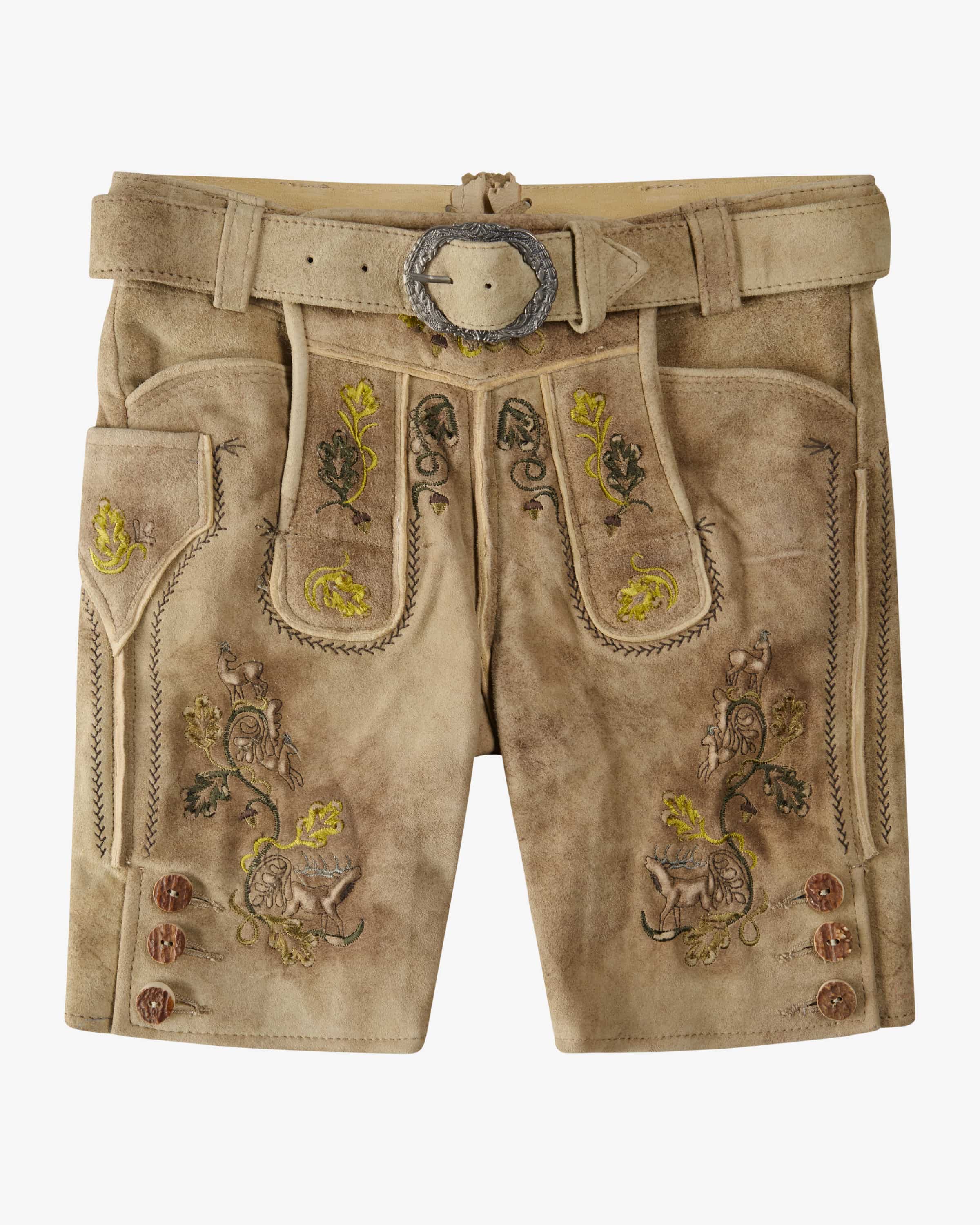 Bruno leather trousers for children from Spieth & Wensky in beige, dark green and lime. This model is characterized by its high-quality goatskin leather finish, while stylish relief embroidery with stags skilfully accentuates the traditional look. skilfully set the scene.