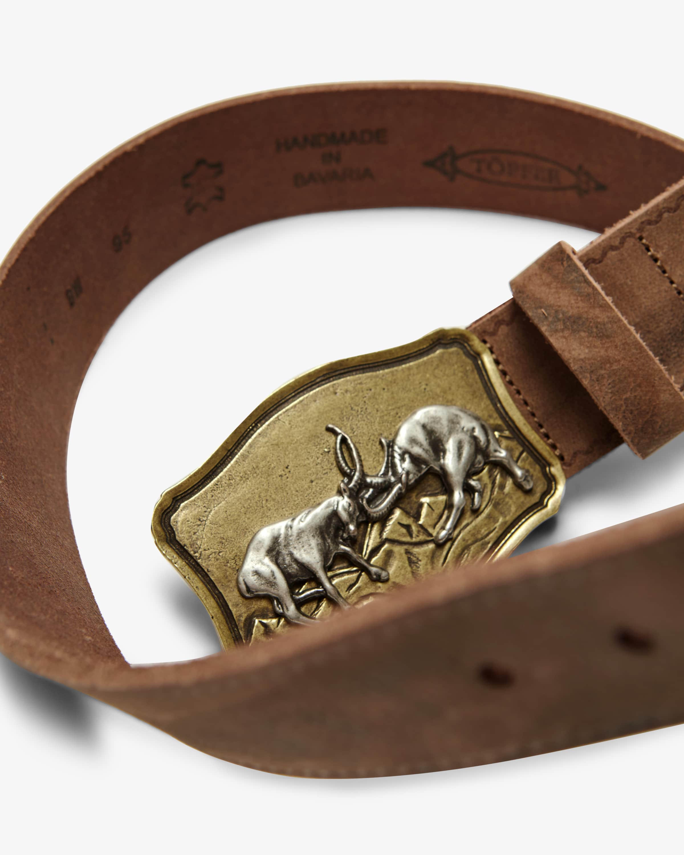Traditional belt for men from Töpfer in light brown. Handmade in Bavaria and in soft leather quality, the rustic belt presents itself as a masculine companion to lederhosen, while the striking metal buckle with a raised ibex ibex motif adds a traditional touch.