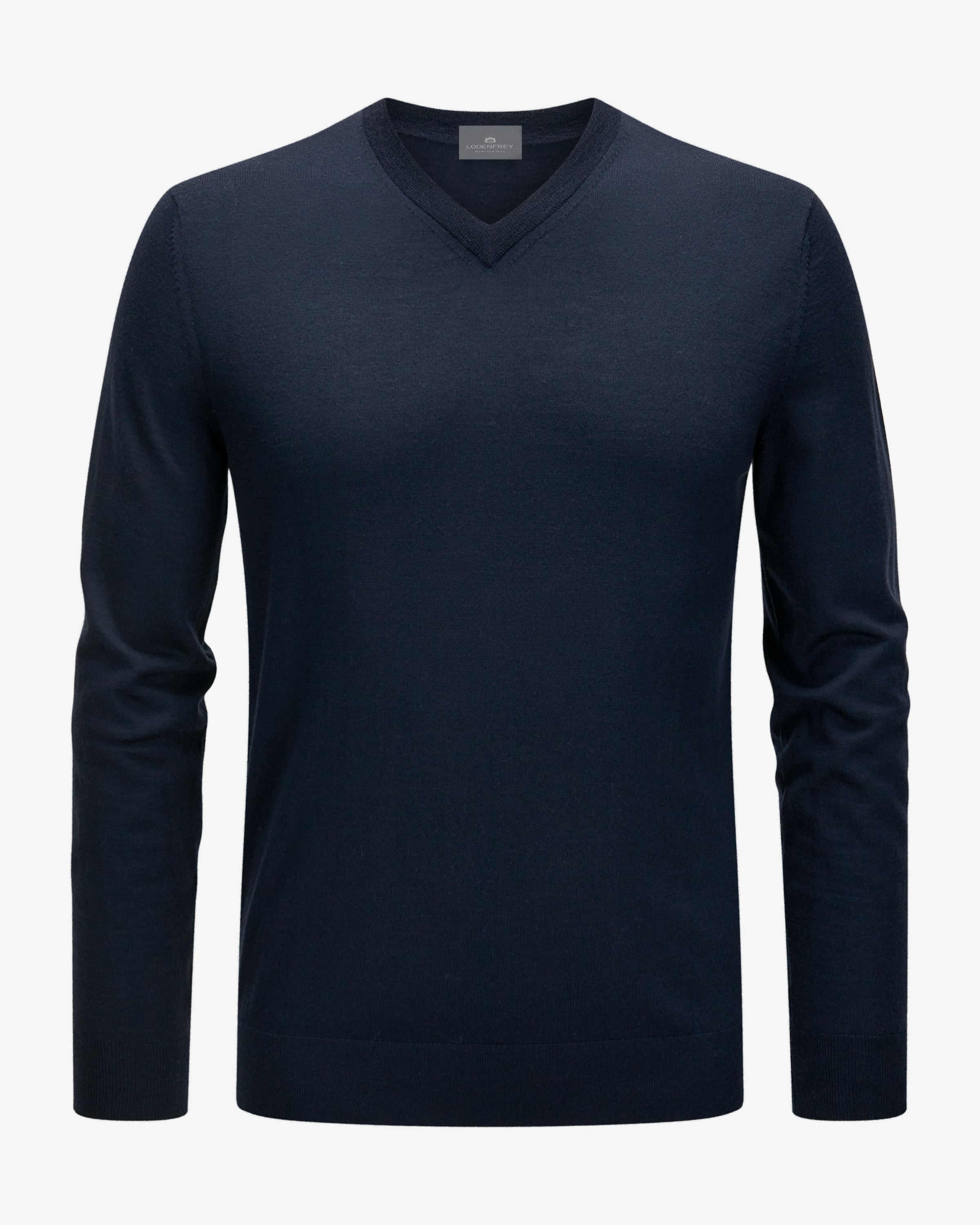 Sweater for men from LODENFREY in navy. This model impresses thanks to the high-quality merino wool in a fine knit quality, this model is soft to the touch and and lightweight feel, while the clean design creates an ideal layering essential. essential.