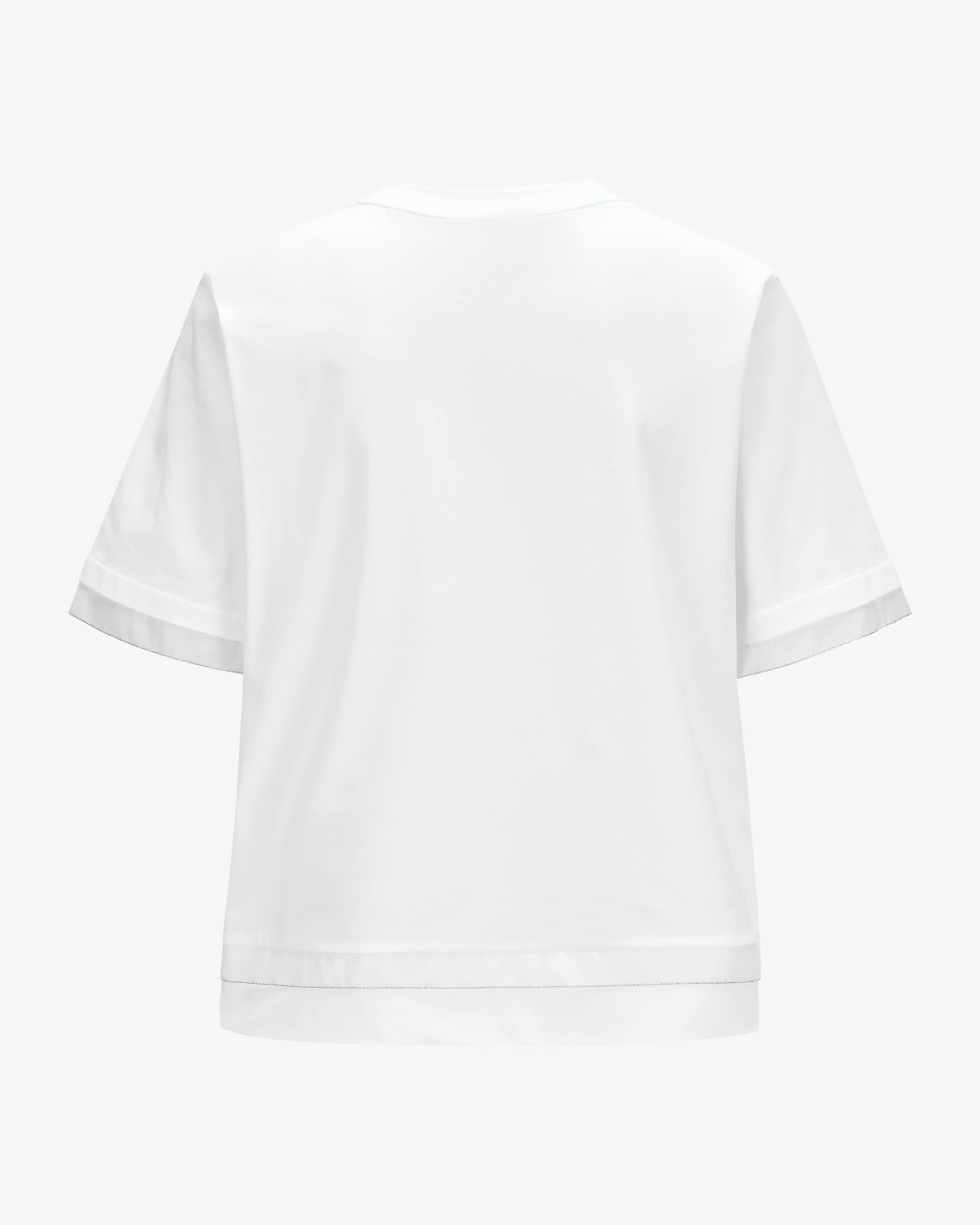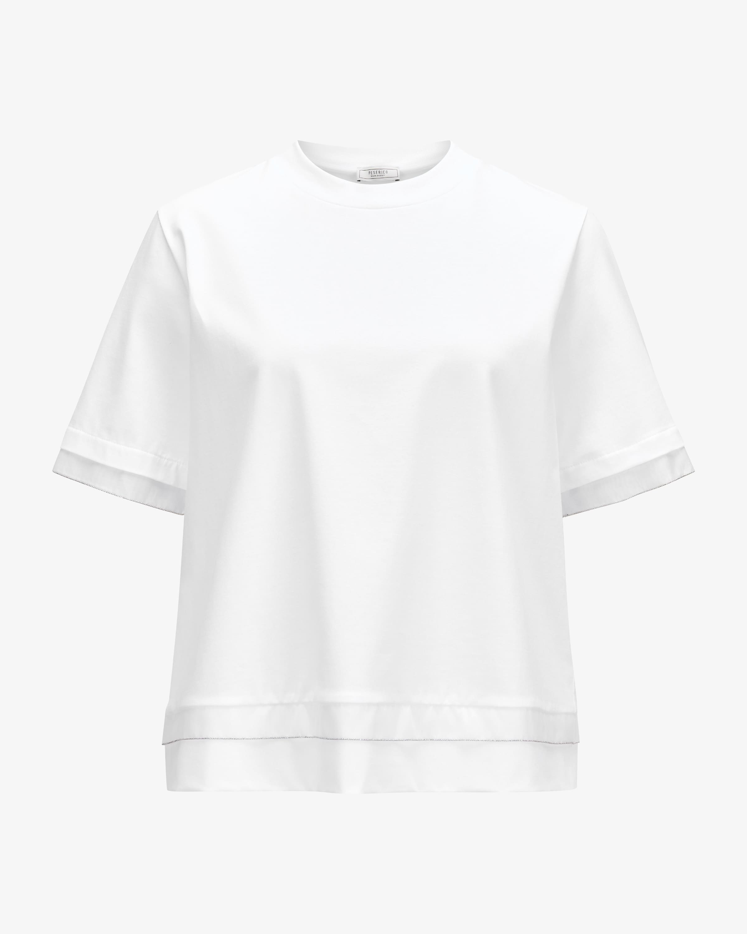 T-shirt for women from Peserico in white. The Italian brand stands for fine women's women's fashion with a focus on materials, fit and craftsmanship. This model also features lightweight cotton jersey, which guarantees pleasant wearing comfort. The fine chain appliqué and the semi-transparent trimming harmoniously round off the sophisticated basic look.