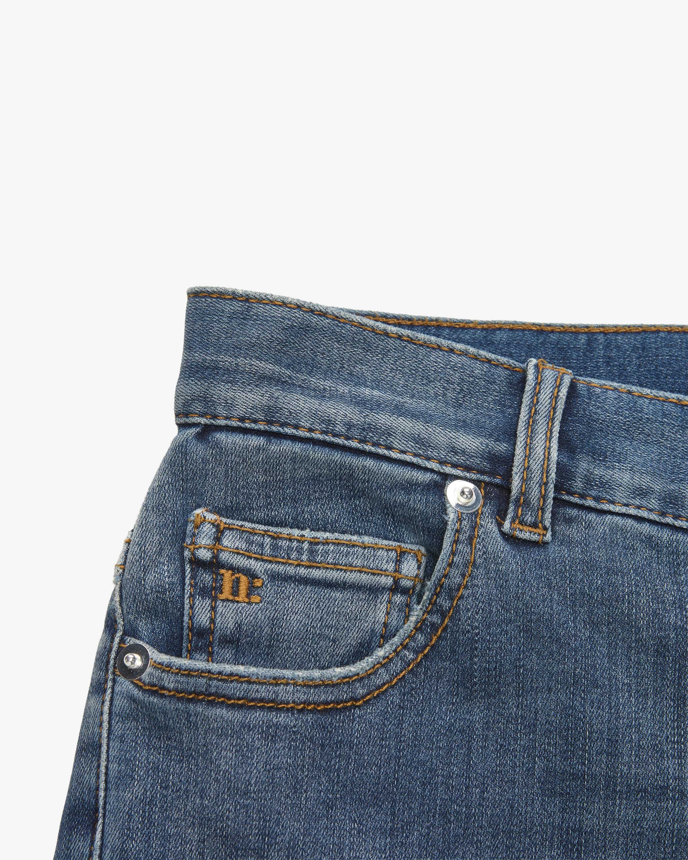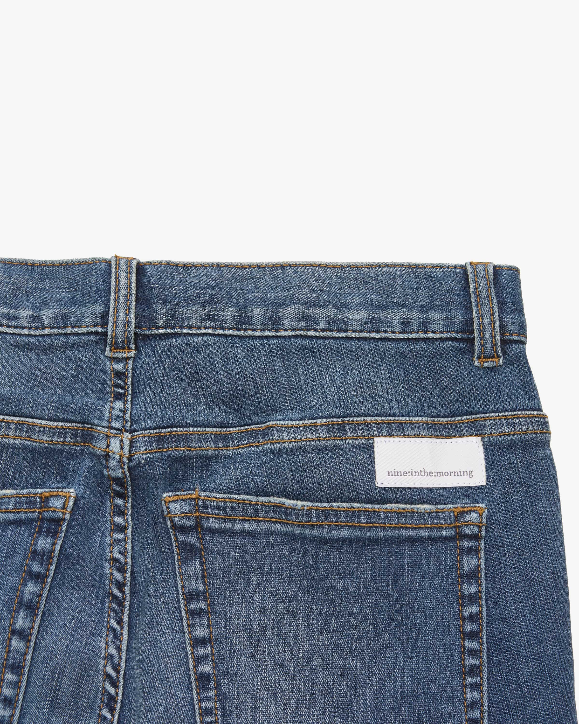 Ameli bootcut jeans for women from nine:inthe:morning in blue. The model with flared leg model has a feminine look with classic denim details denim details, while the stretchy cotton fabric ensures a comfortable fit. wearing comfort.