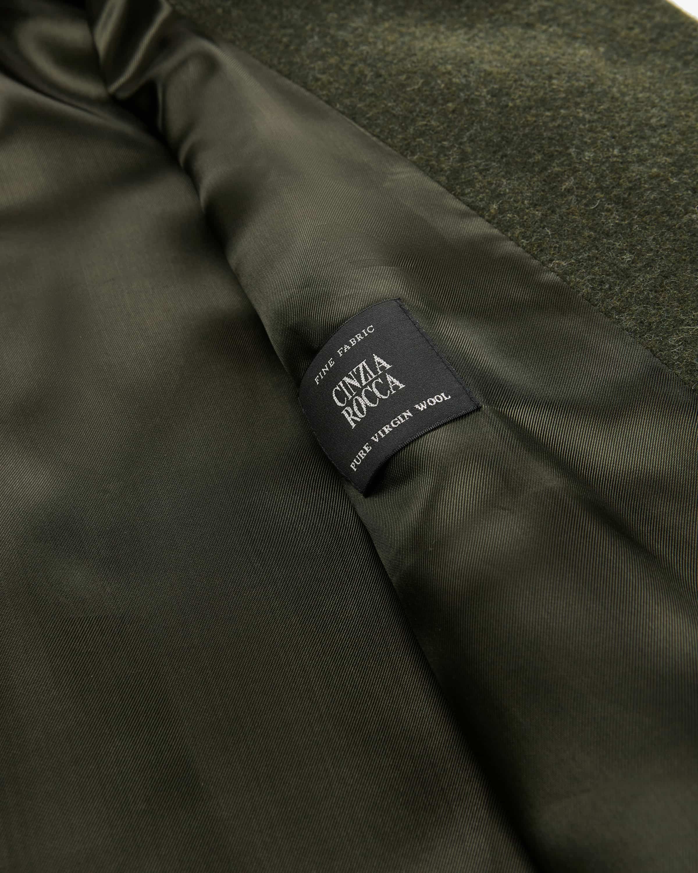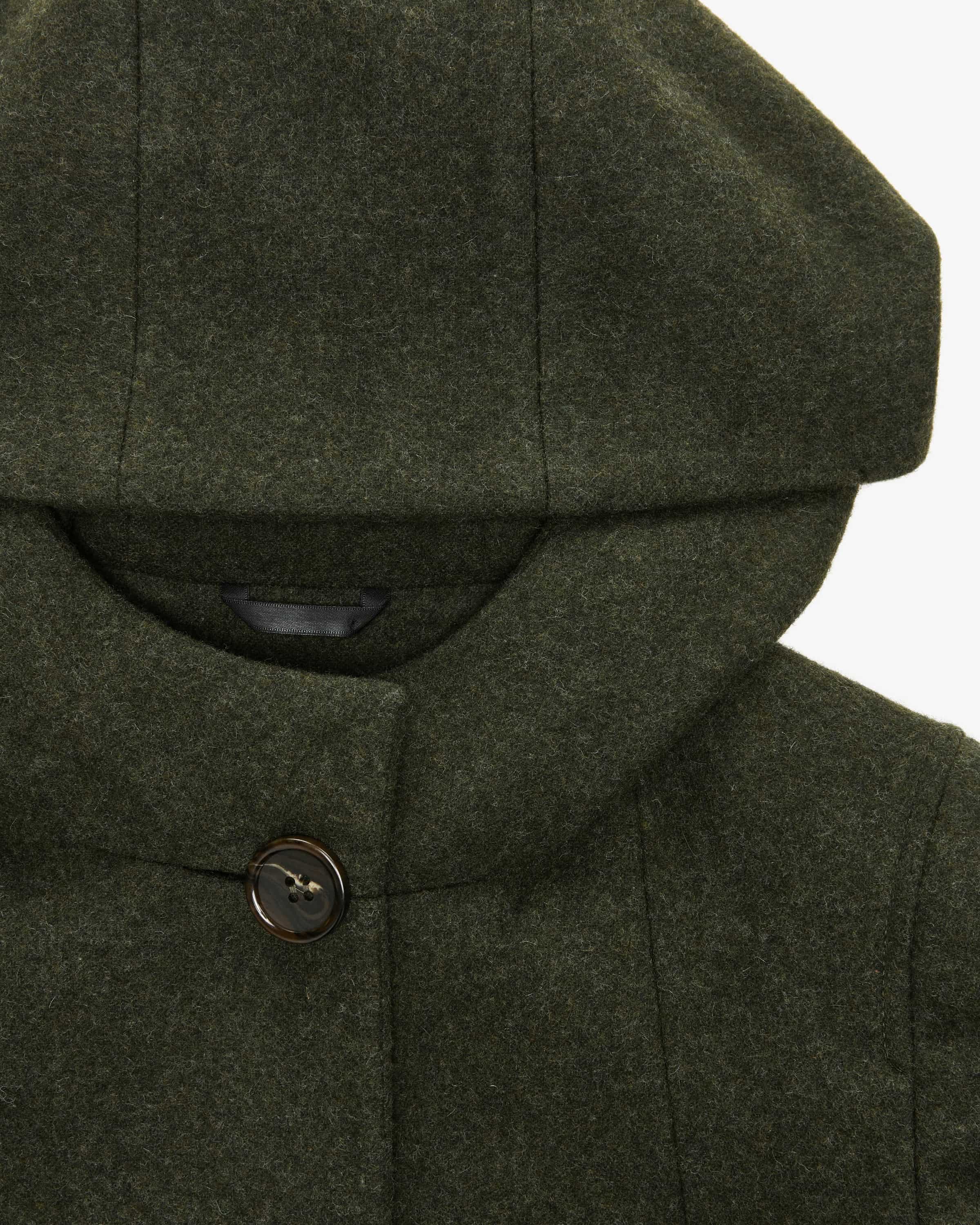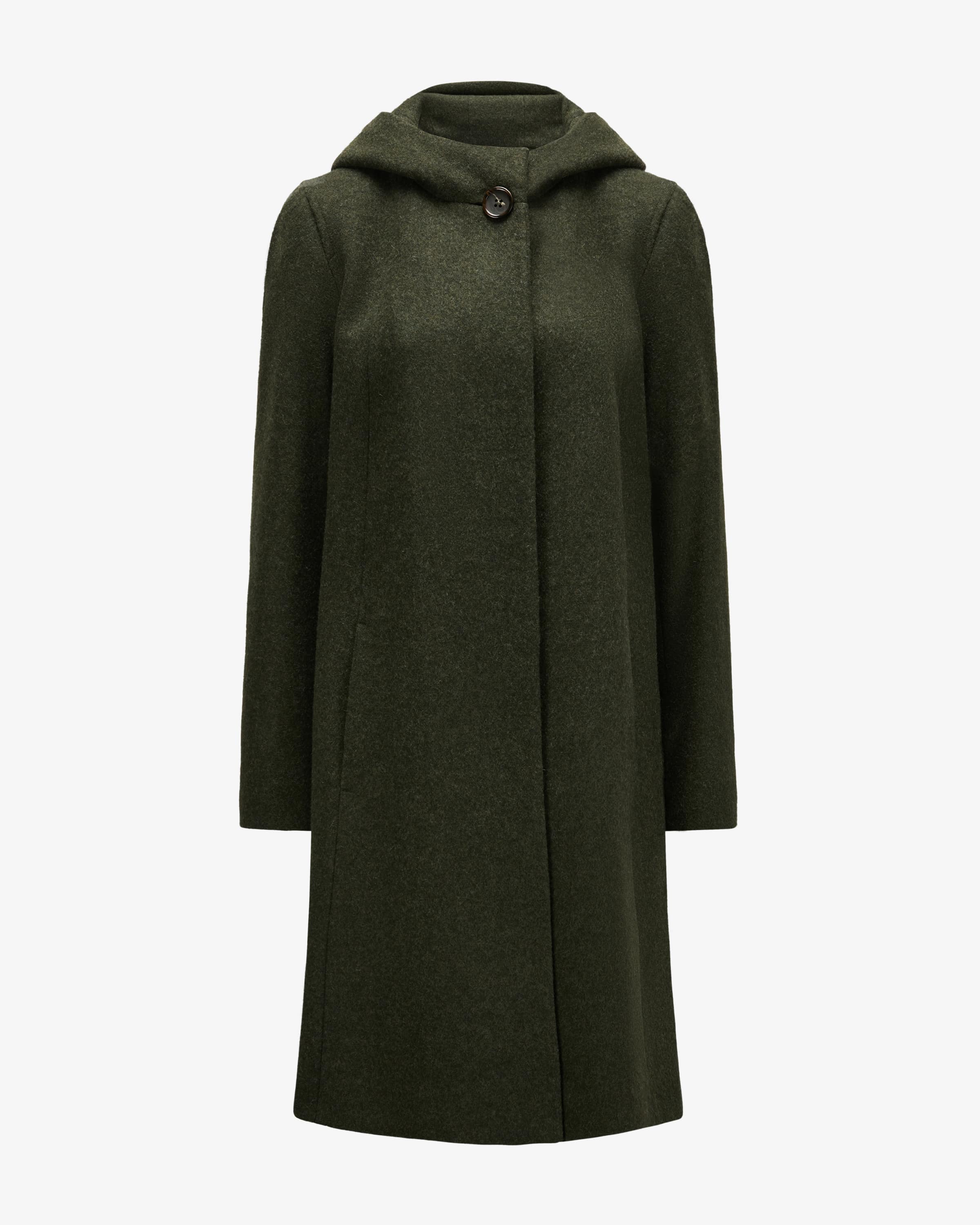 Wool coat for women from Cinzia Rocca in olive. Thanks to the fine virgin wool quality, the model impresses with a high-quality feel, while the minimalist minimalist design with a casual hood creates a versatile companion for the transitional transitional period.