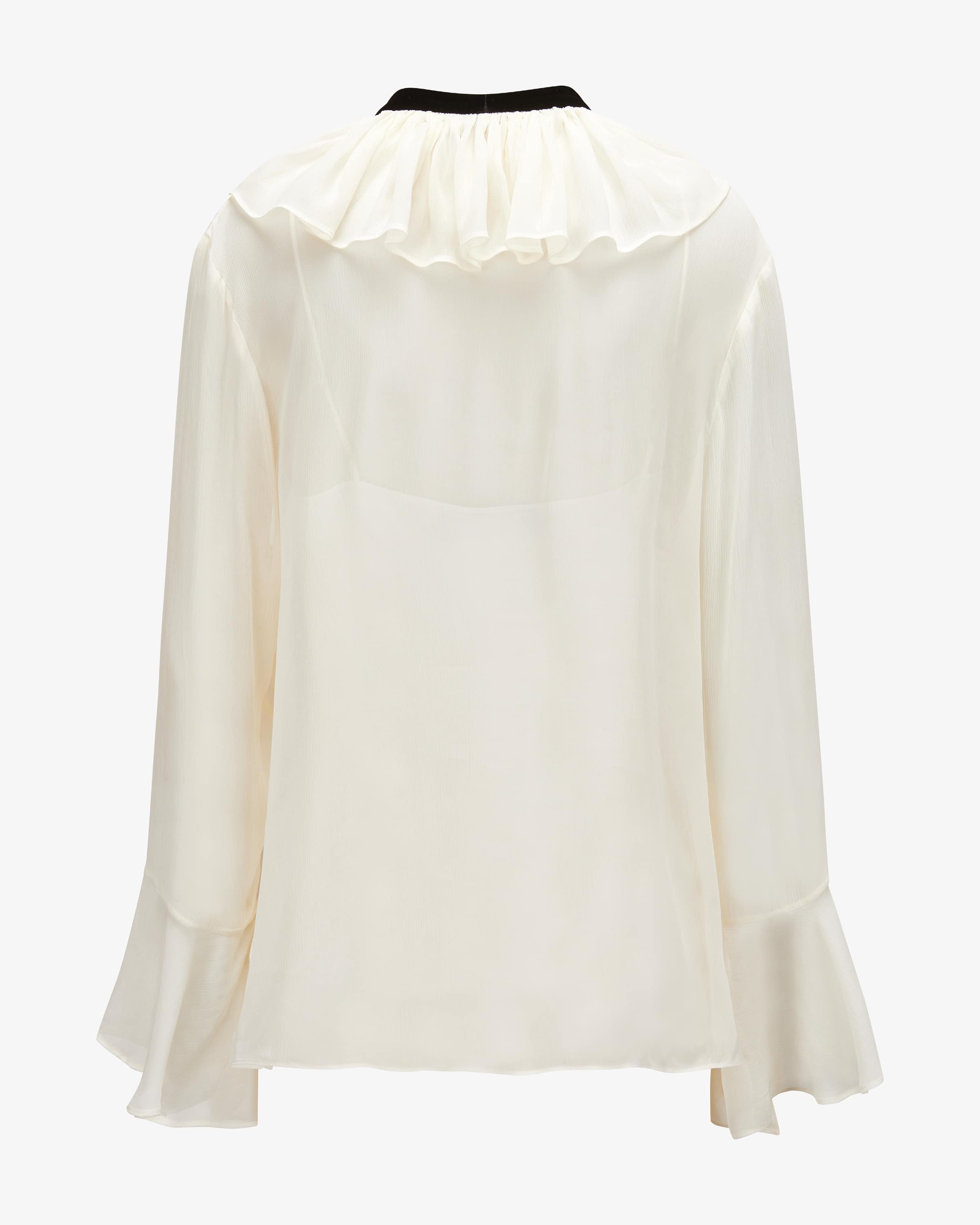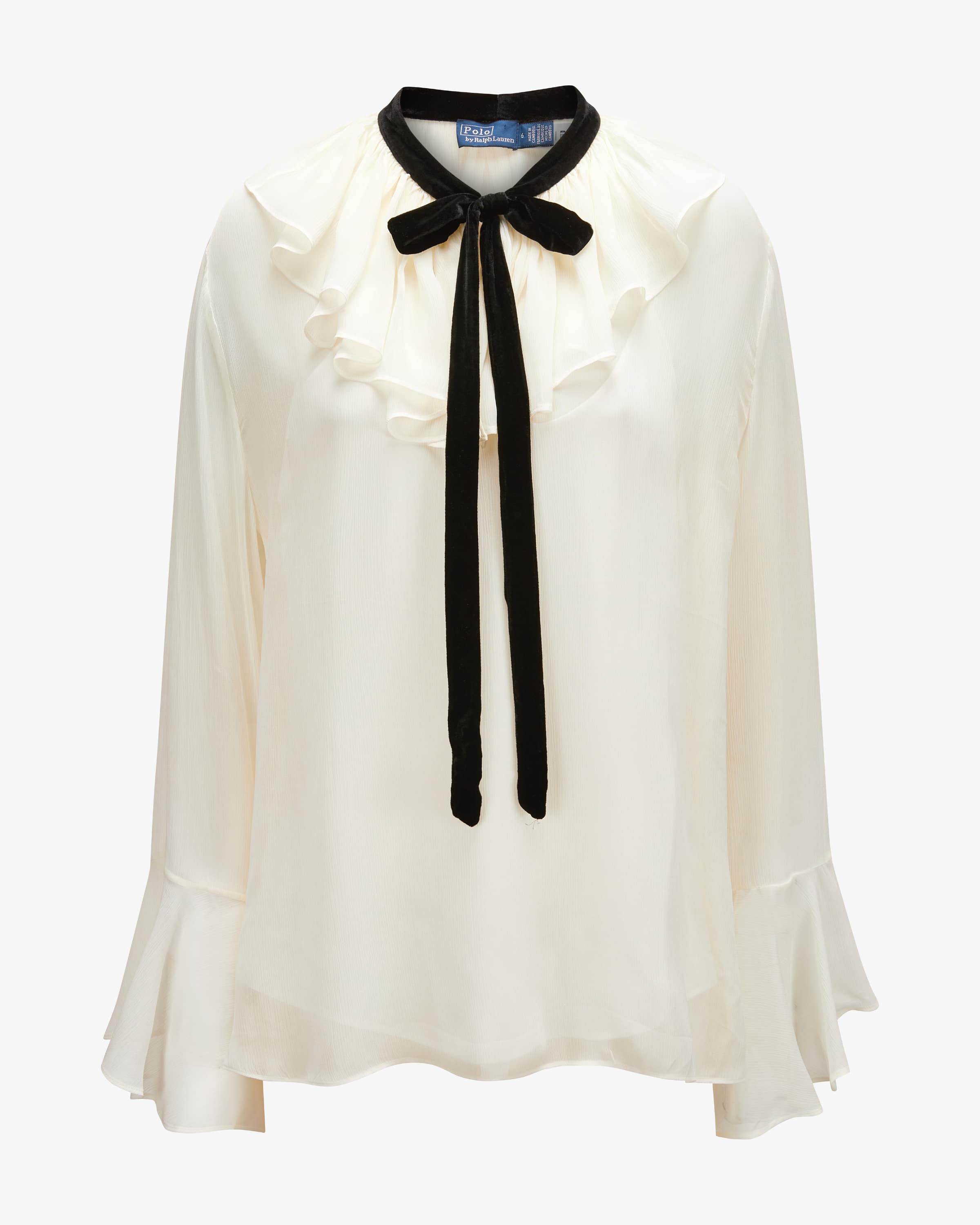 Chiffon blouse for women from Polo Ralph Lauren in off-white and black. The feminine model with semi-transparent viscose chiffon and matching top underneath. The romantic design with trumpet sleeves and ruffled collar is elegantly accentuated by the contrasting velvet bow.