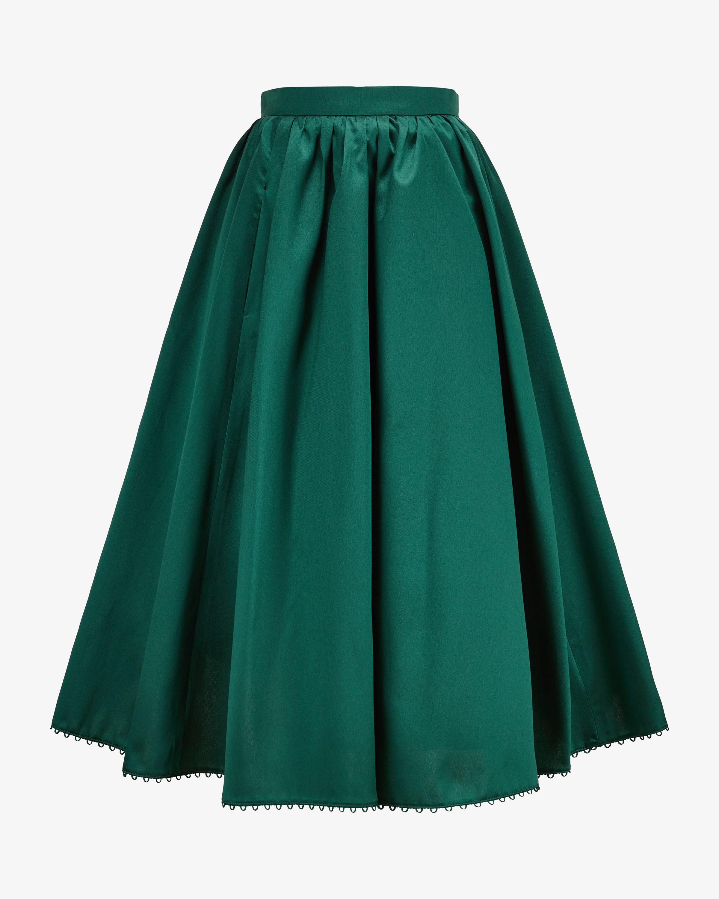 Kinga traditional skirt for women from Kinga Mathe in emerald. The model presents with an elegantly iridescent material quality that, together with the crocheted border at the hem for an elegant look. The slit pockets also create casual accents and add a sophisticated finishing touch to the overall look.