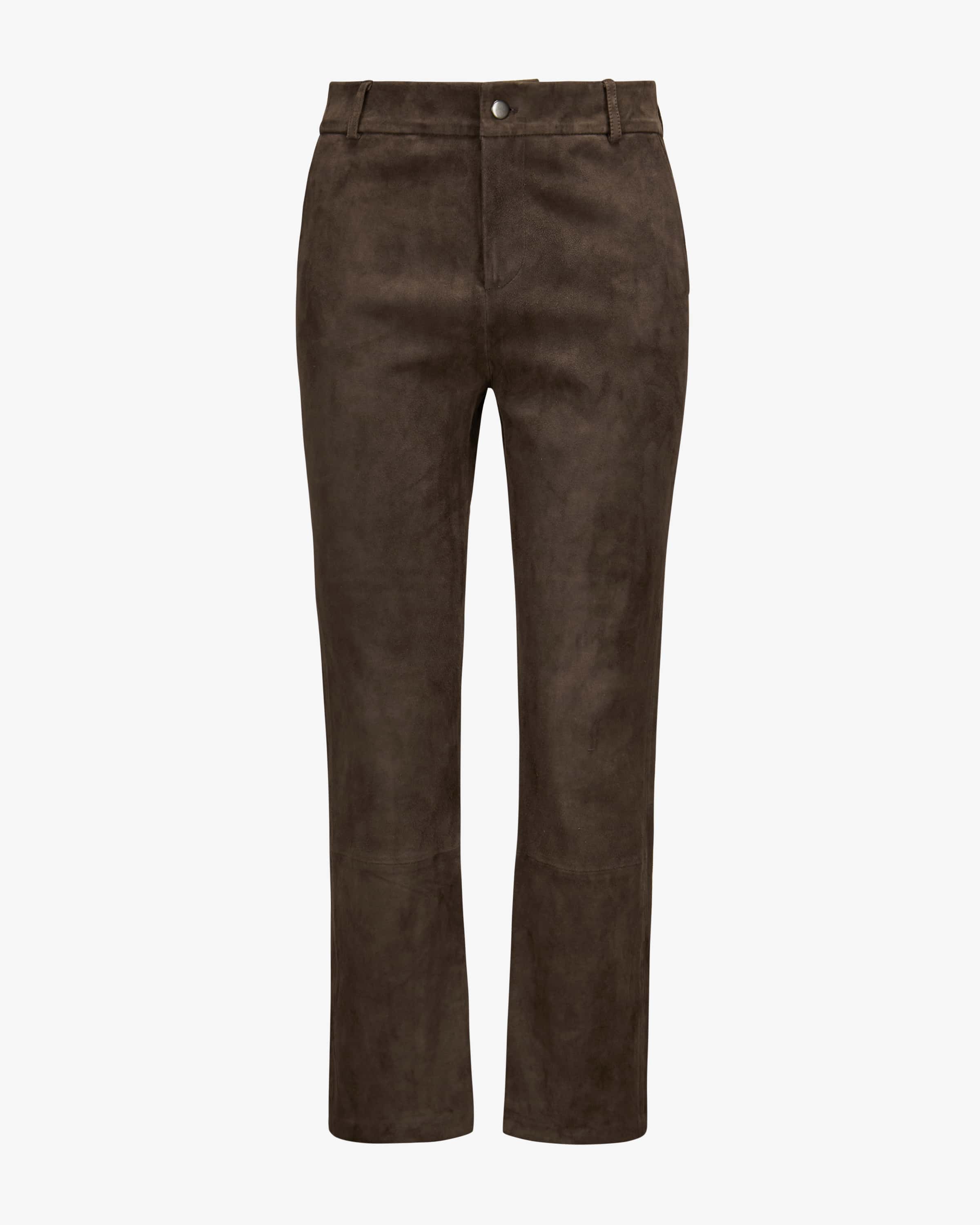 Tropez 7/8 leather trousers for women from Nove in Chocolate. Made from high-quality lambskin suede lambskin velour, the model is both tactile and visually appealing, while the discreetly flared leg adds a modern touch.
