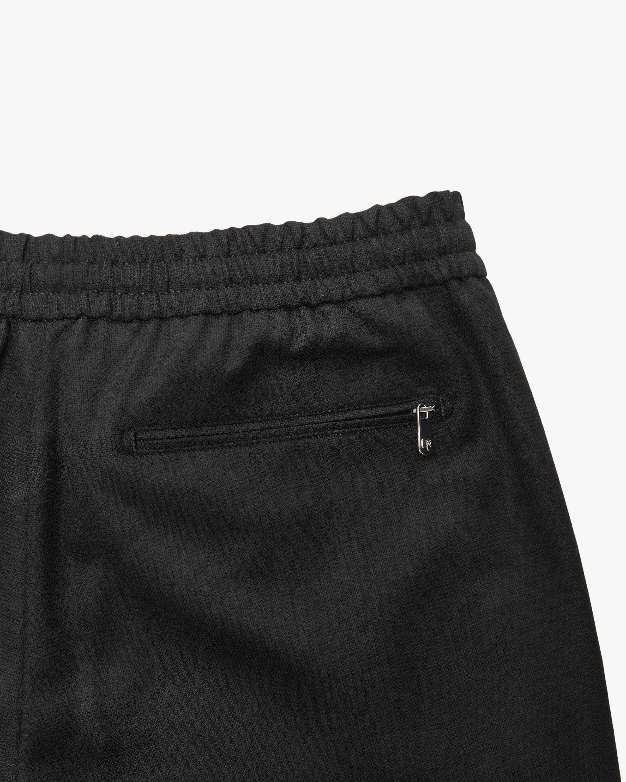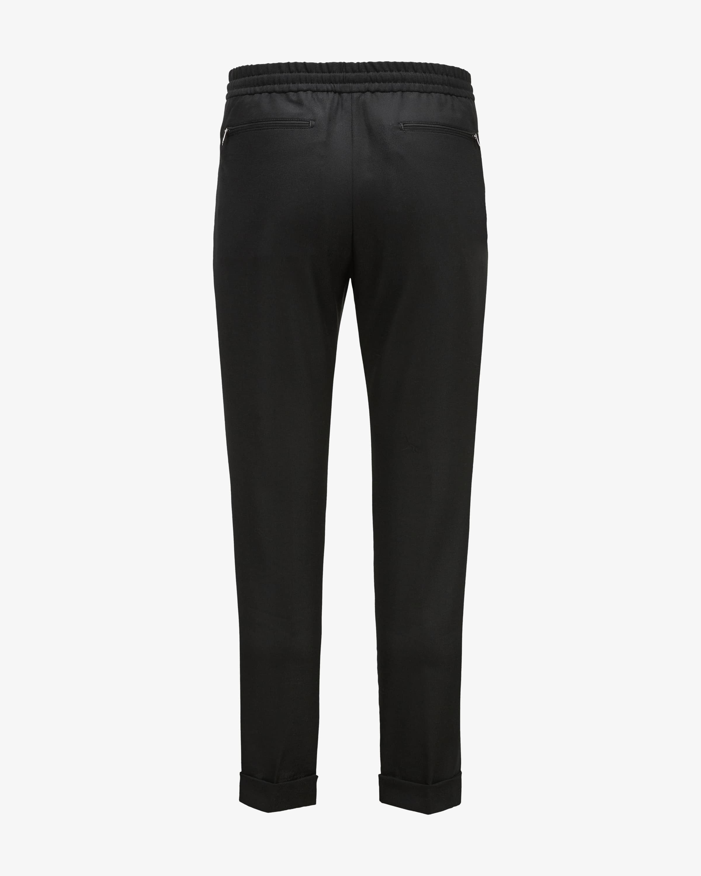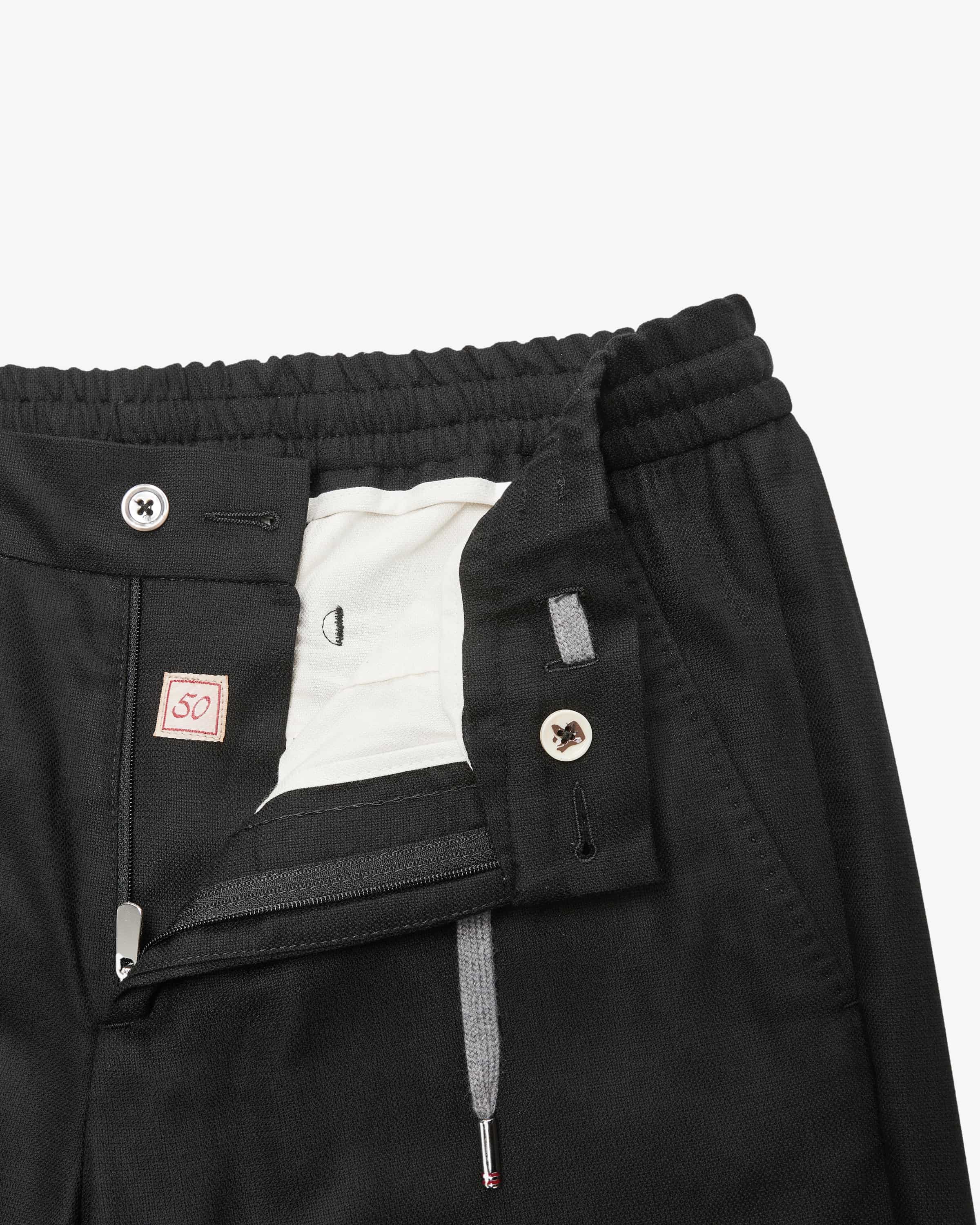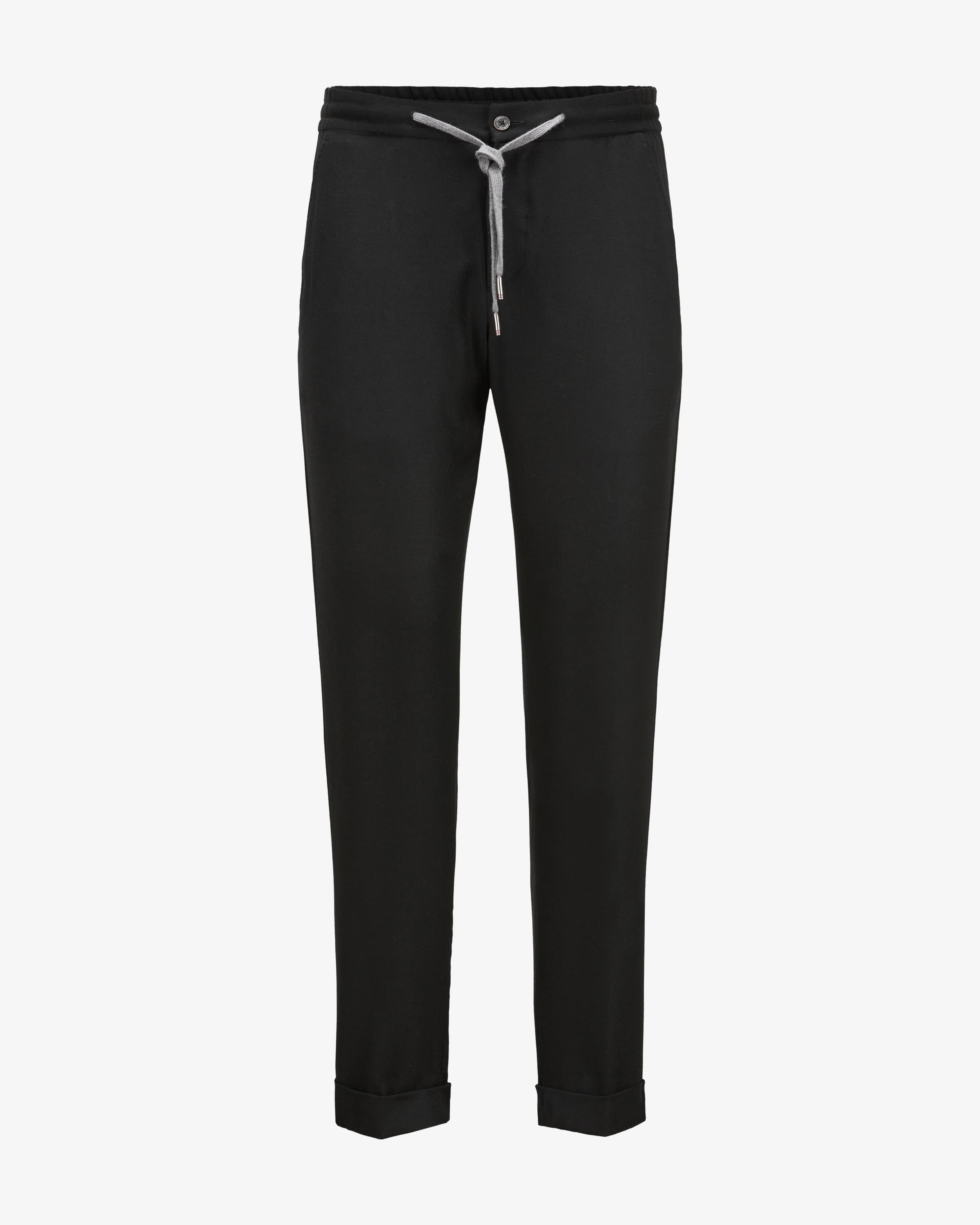 Caracciolo trousers for men from Marco Pescarolo in black. Made in Italy - The casual model with a cropped leg impresses thanks to its lightweight virgin wool fabric and fine fine structure and the elasticated drawstring waistband make them extremely comfortable to wear, while the label's signature pendant with stones and mask adds the finishing touch. adds the finishing touch.