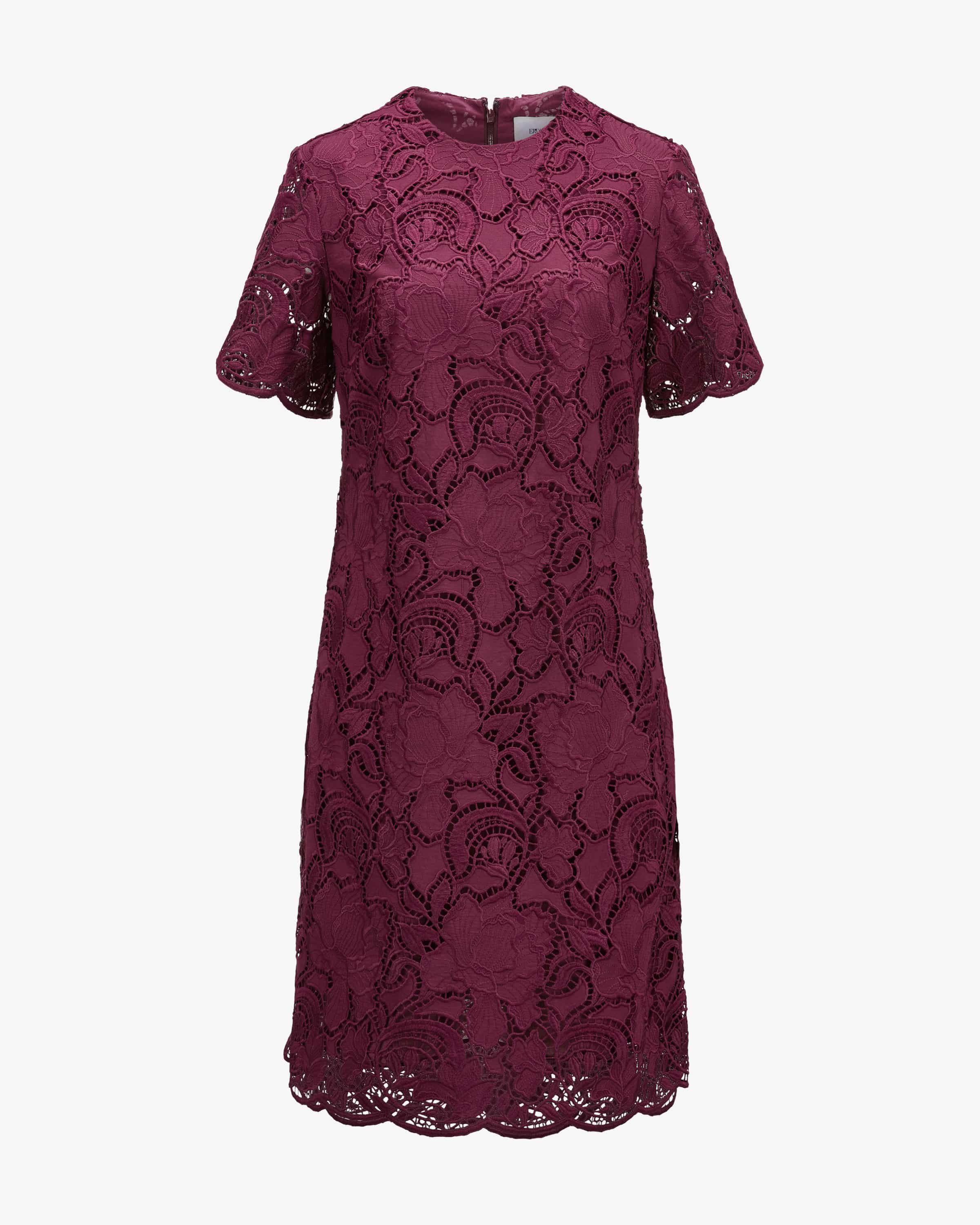 Lace dress for women from $stopword_875$ in Bordeaux. The British luxury brand stands for poetic prints, floral embroidery and a narrative signature. This This model also impresses with semi-transparent lace with a floral pattern and a feminine feminine scalloped hem - a romantic look for elegant occasions.