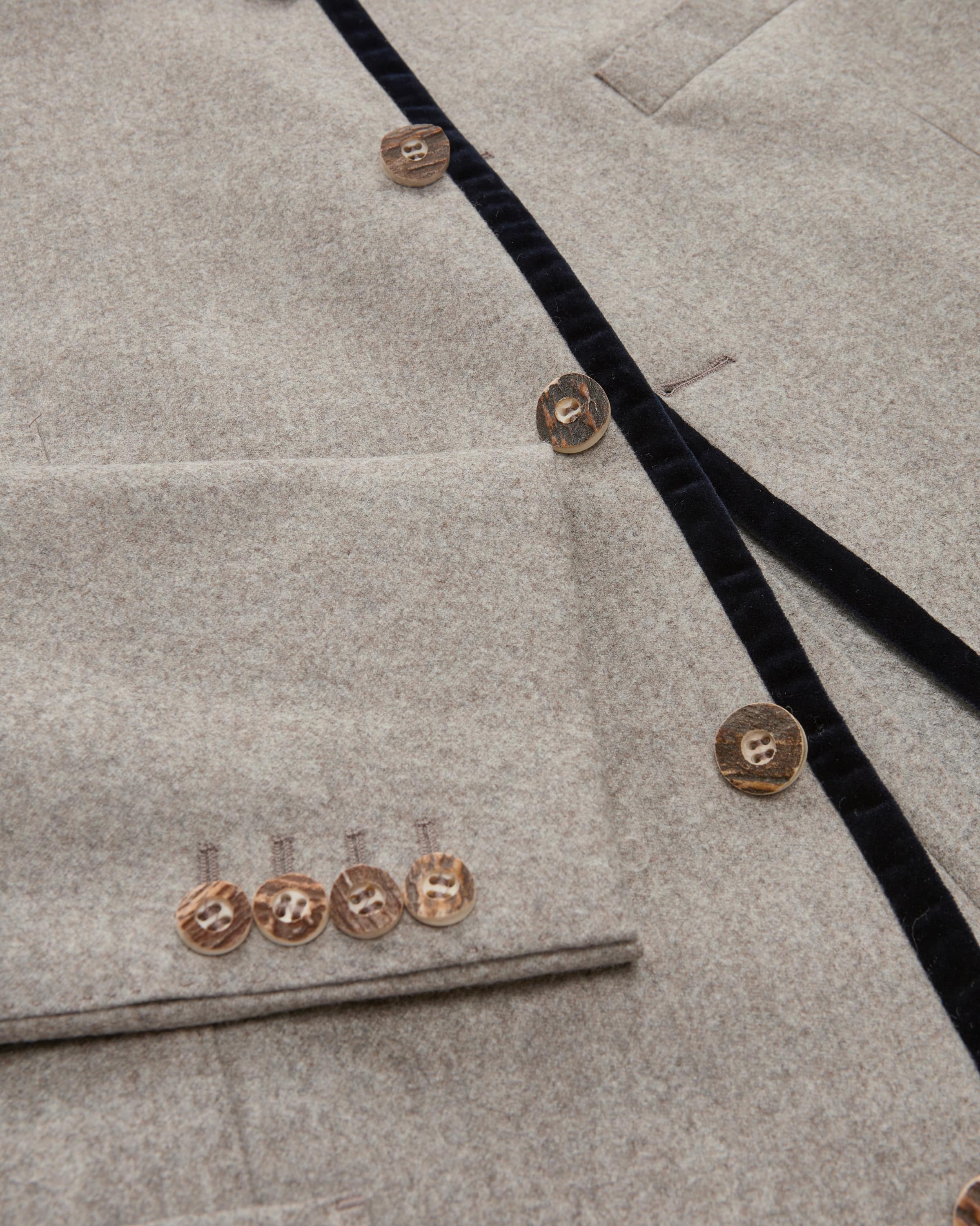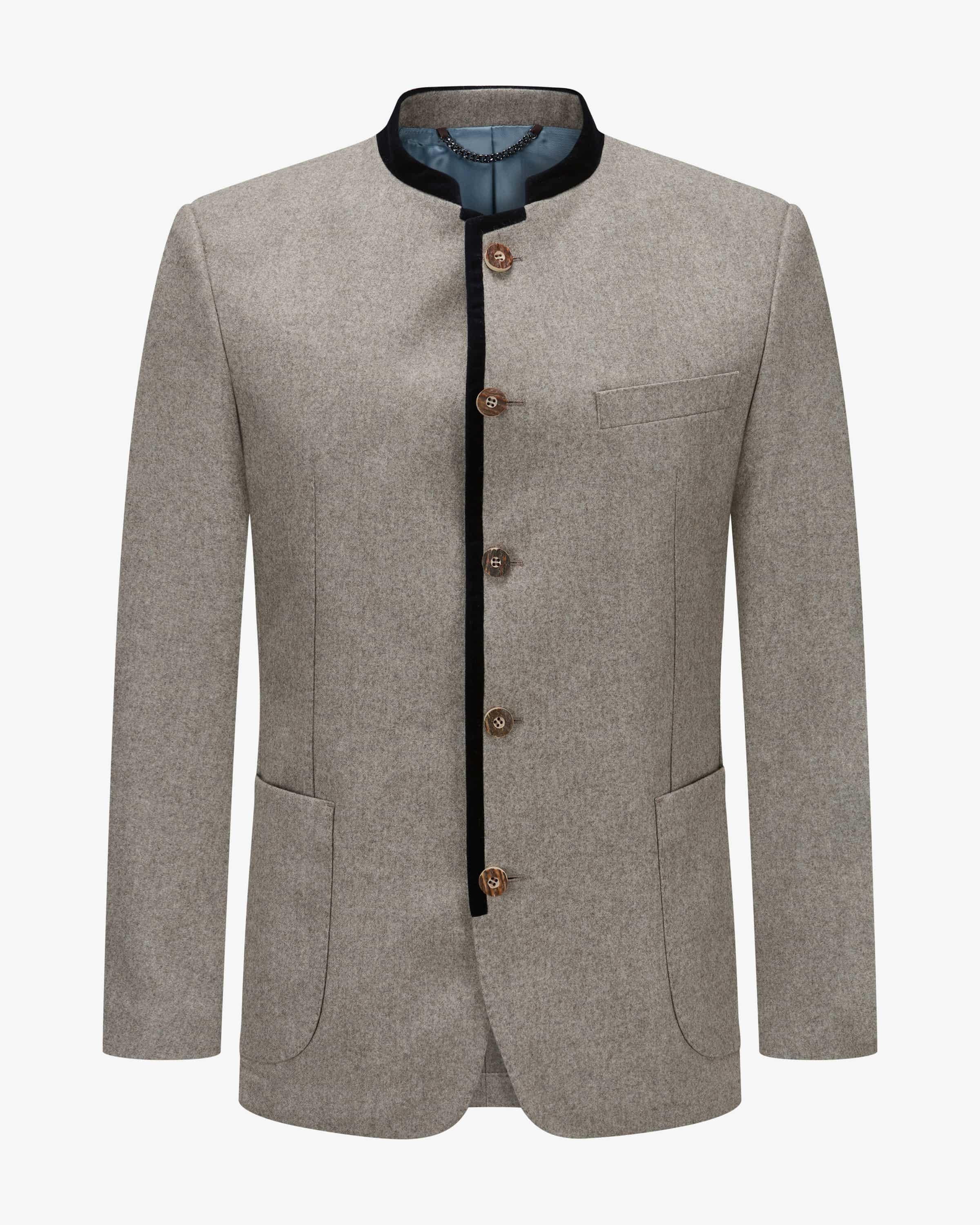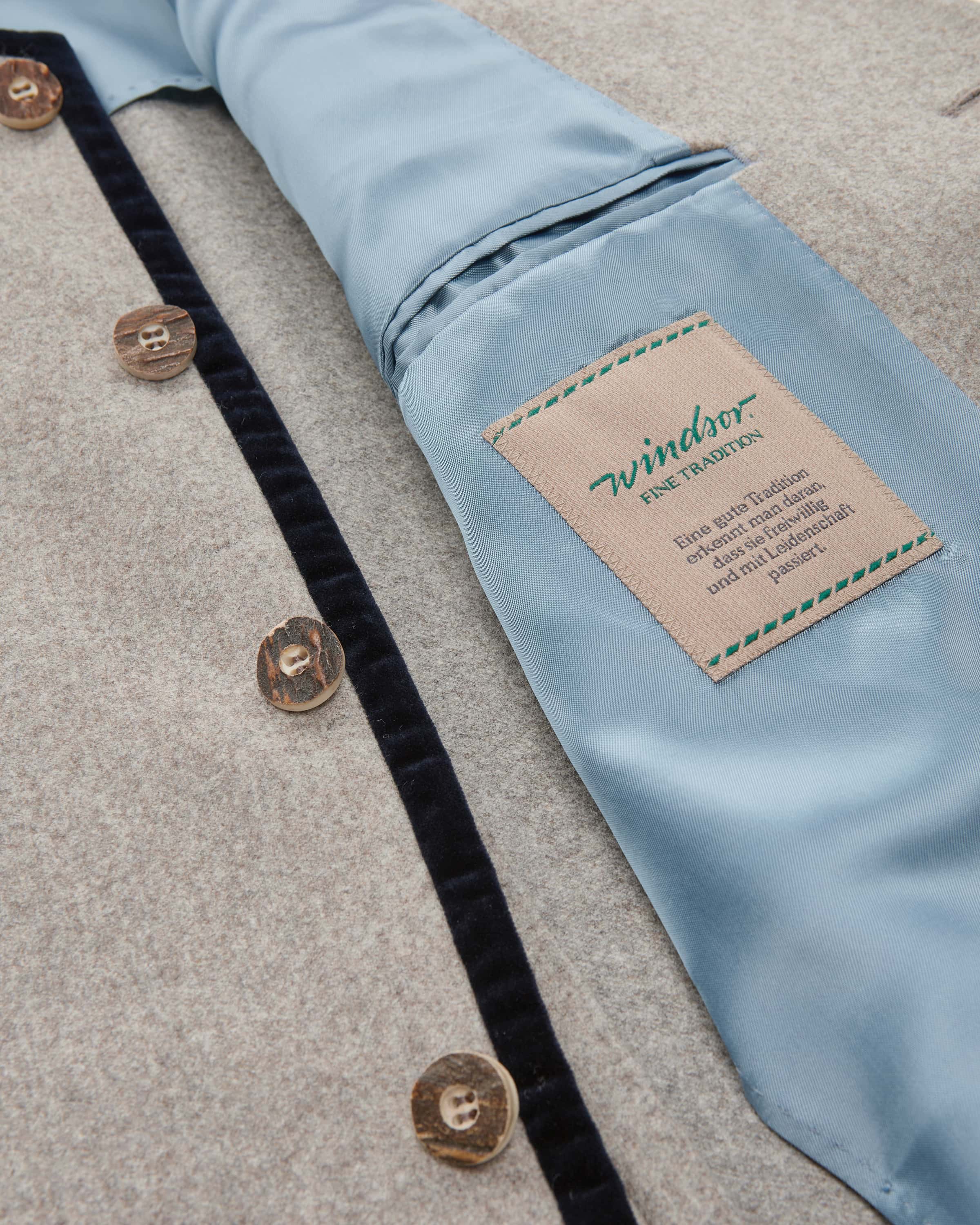 Sendling traditional jacket for men from Windsor in beige and midnight blue. The model impresses thanks to the high-quality wool fabric with a pleasant feel, while soft soft velvet details and horn buttons add the finishing touches to the traditional look. the finishing touches.
